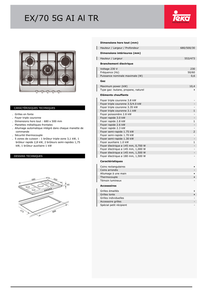 EX/70 5G AI Al TR Dimensions hors tout (mm) Hauteur / Largeur / Profondeur 680/500/30 Dimensions intérieures (mm) Hauteur / Largeur 553/473 Branchement électrique Voltage 230 V Fréquence (Hz) Puissance nominale maximale (W) 230 50/60 0,6 Gaz Maximum power (kW) Type gaz: butane, propane, naturel 10,4 • Eléments chauffants CARACTÉRISIQUES TECHNIQUES . Grilles en fonte . Foyer triple couronne . Dimensions hors tout : 680 x 500 mm . Manettes métalliques frontales . Allumage automatique intégré dans chaque manette de commande . Sécurité thermocouple . 5 zones de cuisson : 1 brûleur triplezone 3,1 kW, 1 brûleur rapide 2,8 kW, 2 brûleurs semirapides 1,75 kW, 1 brûleur auxiliaire 1 kW DESSINS TECHNIQUES Foyer triple couronne 3.8 kW Foyer triple couronne 3.5/4.0 kW Foyer triple couronne 3.35 kW Foyer triple couronne 3.1 kW Foyer poissonière 2.8 kW Foyer rapide 3.0 kW Foyer rapide 2.8 kW Foyer rapide 2.6 kW Foyer rapide 2.3 kW Foyer semirapide 1.75 kW Foyer semirapide 1.70 kW Foyer semirapide 1.30 kW Foyer auxiliaire 1.0 kW Foyer électrique ø 145 mm, 0,700 W Foyer électrique ø 145 mm, 1,000 W Foyer électrique ø 145 mm, 1,500 W Foyer électrique ø 180 mm, 1,500 W 1 1 2 1 Caractéristiques Coins rectangulaires Coins arrondis Allumage à une main Thermocouple Témoin lumineux • • • Accessoires Grilles émaillés Grilles lonte Grilles individuelles Accessoire grilles Spécial petit récipient • •