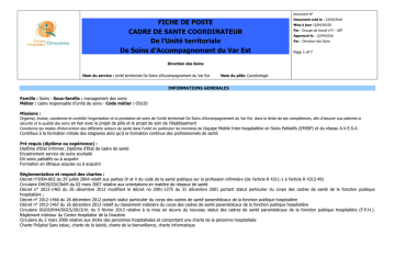 Document N° FICHE DE POSTE CADRE DE SANTE COORDINATEUR De l’Unité territoriale De Soins d’Accompagnement du Var Est Document créé le : 23/03/2016 Mise à jour 12/04/20105 Par : Groupe de travail n°2 - USP Approuvé le : 12/04/2016 Par : Directeur des Soins Page 1 of 7 Direction des Soins Nom du service : Unité territoriale De Soins d’Accompagnement du Var Est Nom du pôle: Cancérologie INFORMATIONS GENERALES Famille : Soins - Sous-famille : management des soins Métier : cadre responsable d’unité de soins - Code métier : 05U20 Missions : Organise, évalue, coordonne et contrôle l’organisation et la prestation de soins de l’unité territoriale De Soins d’Accompagnement du Var Est dans la limite de ses compétences, afin d’assurer aux patients la sécurité et la qualité des soins en lien avec le projet de pôle et le projet de soin de l’établissement Coordonne les modes d’intervention des différents acteurs de santé dans l’unité en particulier les membres de l’équipe Mobile Inter-hospitalière en Soins Palliatifs (EMISP) et du réseau A.V.E.S.A . Contribue à la formation initiale des stagiaires ainsi qu’à la formation continue des professionnels de santé Pré requis (diplôme ou expérience) : Diplôme d'Etat Infirmier, Diplôme d’Etat de cadre de santé Encadrement service de soins souhaité DU soins palliatifs ou à acquérir Formation en éthique acquise ou à acquérir Règlementation et respect des chartes : Décret n°2004-802 du 29 juillet 2004 relatif aux parties IV et V du code de la santé publique sur la profession infirmière (de l’article R 4311-1 à l’article R 4312-49) Circulaire DHOS/03/CNAM du 02 mars 2007 relative aux orientations en matière de réseaux de santé Décret n° 2012-1465 du 26 décembre 2012 modifiant le décret no 2001-1375 du 31 décembre 2001 portant statut particulier du corps des cadres de santé de la fonction publique hospitalière ; Décret n° 2012-1466 du 26 décembre 2012 portant statut particulier du corps des cadres de santé paramédicaux de la fonction publique hospitalière Décret n° 2012-1467 du 26 décembre 2012 relatif au classement indiciaire du corps des cadres de santé paramédicaux de la fonction publique hospitalière Circulaire DGOS/RH4/DGCS/2013/41 du 5 février 2013 relative à la mise en œuvre du nouveau statut des cadres de santé paramédicaux de la fonction publique hospitalière (F.P.H.). Règlement intérieur du Centre Hospitalier de la Dracénie Circulaire du 2 mars 2006 relative aux droits des personnes hospitalisées et comportant une charte de la personne hospitalisée Charte l’hôpital Sans tabac, charte de la laïcité, charte de la bienveillance, charte informatique Document N° FICHE DE POSTE CADRE DE SANTE COORDINATEUR De l’Unité territoriale De Soins d’Accompagnement du Var Est Document créé le : 23/03/2016 Mise à jour 12/04/20105 Par : Groupe de travail n°2 - USP Approuvé le : 12/04/2016 Par : Directeur des Soins Page 2 of 7 Direction des Soins Nom du service : Unité territoriale De Soins d’Accompagnement du Var Est Nom du pôle: Cancérologie AFFECTATION Nom du ou des services : Hospitalisation complète (USP) Equipe Mobile Inter-hospitalière en Soins Palliatifs (EMISP) Réseau A.V.E.S.A Capacités d’accueil : 10 lits Hospitalisation complète Lieux, bâtiment principal UF : UF : UF : CONDITIONS D’EXERCICE Quotité : temps plein Horaires : Référentiel de gestion du temps de travail 2014 Gardes et astreintes : Participation aux gardes de cadres de santé sur l’ensemble de l’hôpital les samedis, dimanches, jours fériés En absence du cadre de nuit, le cadre de garde est d'astreinte à domicile de 18h à 20h, semaine, week-end et jours fériés. Gestion de son temps de travail en binôme avec un autre cadre de santé de jour soit de son pôle soit en inter pole. Conditions matérielles : bureau à l’intérieur de l’unité où il exerce son activité. téléphone portable et fixe, ordinateur avec programmes (Intranet, prescription informatisée, dossier de soins informatisé, Blue Medi,etc…), imprimante, bibliothèque, armoire de rangement, fauteuil ergonomique. Durée de l’affectation : 5 ans minimum. ACTIVITES SPECIFIQUES DU POSTE o Assurer avec les équipes d’appui la mise en œuvre, le suivi et l’évaluation du dispositif de coopération entre acteurs de santé sur le territoire est var pour une réponse de proximité adaptée et une meilleure lisibilité pour le patient et ses proches o Renforcer les modes de pratiques coopératives avec les autres établissements public de santé, médicaux sociaux et sociaux, professionnels libéraux du territoire tout au long du parcours du patient dans une logique de pluri et l’interdisciplinarité et de mutualisation. o Veille à faire respecter les droits fondamentaux en soins palliatifs (Droits d’accès aux Soins Palliatifs, Loi LEONETTI et loi LEONETTI CLAEYS, plan national des soins palliatifs 2015 – 2018) o Participe à la création d’une commission territoriale de coordination des soins palliatifs Document N° Document créé le : 23/03/2016 FICHE DE POSTE CADRE DE SANTE COORDINATEUR De l’Unité territoriale De Soins d’Accompagnement du Var Est Mise à jour 12/04/20105 Par : Groupe de travail n°2 - USP Approuvé le : 12/04/2016 Par : Directeur des Soins Page 3 of 7 Direction des Soins Nom du service : Unité territoriale De Soins d’Accompagnement du Var Est Nom du pôle: Cancérologie SAVOIR-FAIRE « Pratique courante » : Mise en œuvre de manière efficace d’un savoir-faire de base en situation ordinaire, habituelle, courante. « Maîtrisé » : Mise en œuvre de manière efficace, d’un savoir-faire en situation tant quotidienne qu’inhabituelle, voire exceptionnelle (faisant appel à un appui). « Expert » : Mise en œuvre en situation de travail complexe de savoir-faire maitrisés (sans faire appel à un appui), en capacité de former ses pairs. Des