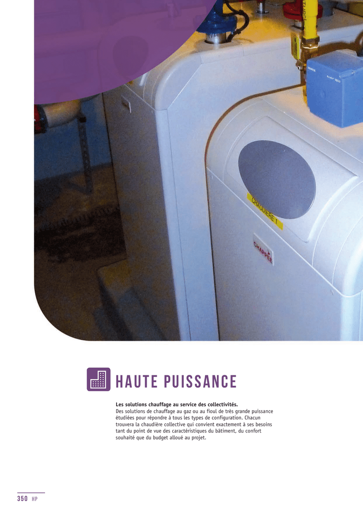 h a u t e puissance Les solutions chauffage au service des collectivités. Des solutions de chauffage au gaz ou au fioul de très grande puissance étudiées pour répondre à tous les types de configuration. Chacun trouvera la chaudière collective qui convient exactement à ses besoins tant du point de vue des caractéristiques du bâtiment, du confort souhaité que du budget alloué au projet. 3 5 0 HP Moorea H HTE Initia + HTE HP Applications hydrauliques ____________________352 Guide de choix _____________________________362 WGB H ___________________________________364 Moorea H HTE / SGB H ______________________376 Initia + HTE _______________________________390 Power Evolution HTE ________________________398 Arizona Progress HTE / LogoCondens LC _________410 NXR 4 Progress _____________________________416 NXR 3 Progress ____________________________420 Arizona Progress C __________________________426 Arizona Evolution 1 et 2 C ____________________430 Tableaux de commandes _____________________436 Brûleurs __________________________________438 HP 351 applications Chaudi è r e s à c o n d e n s at i o n ga z a l u m i n i um / silicium / magnésium HK 1 HK 1 HK 1 T HVF ATF EWM HVF EWM EWM HP HP HM HM M Valable pour WGB H HVF T T T HP M HM M T TWF TLP 125 – 610 E Preparateur ECS SGB/Moorea H HTE Installation multi-circuits : Chaque vanne est pilotée par un module d’extension EWM intégrable dans la chaudière jusqu’à 3 pour les Moorea H HTE / SGB H et 2 pour la WGB H. * Le débit de ces pompes devra être égal au minimum (m3/h) à la Pn chaudière/100 Valable pour WGB H * * SGB/Moorea H HTE 125-300 Cascade sans pompe de charge : A proscrire en présence de circuits haute température 80/60 °C (pas d’ECS instantanée) les vannes 2 voies motorisées isolent les chaudières pendant les périodes de non fonctionnement. Au démarrage les chaudières sont bloquées tant que leurs vannes d’isolement respectives ne sont pas complètement ouvertes. La fonction Cascade est intégrée , il suffit d’ajouter sur chaque régulateur chaudière un module BUS. 3 5 2 HP applications C h a u d i è r e s à condensation gaz aluminium / silicium / magnésium Valable pour Moorea H HTE / SGB H * * Installation multi-circuits : La vanne est pilotée par un module d’extension EWM intégrable dans la chaudière. * Le débit de ces pompes devra être égal au minimum (m3/h) à la Pn chaudière/100 * HP * Valable pour Moorea H HTE / SGB H * Circuit haute température et circuit chauffage direct sans vanne 3 voies : Le circuit haute température est piloté par l’entrée programmable H1 (signal donné par un contact sec type thermostat), le circuit direct est régulé par des trains de chaleur programmés par la chaudière pendant l’utilisation simultanée des deux circuits. HP 353 applications Chaudi è r e s à c o n d e n s at i o n ga z a l u m i n i um / silicium / magnésium * * Valable pour WGB H Le débit de ces pompes devra être égal au minimum (m3/h) à la Pn chaudière/100 SGB/Moorea H HTE 125-610 Optimisation de la condensation : Les retours « froids » sont privilégiés, grâce au ballon tampon à stratification, les cours cycles en haute température sont lissés : pertes de boucle, petits puisages. Le temps de mise en température de la chaudière est pris en charge par le ballon tampon, la contenance du ballon doit être au minimum de 2,5 l / kW de puissance installée en haute température. Valable pour WGB H SGB/Moorea H HTE 125-610 Cascade classique avec bouteille de mélange et circuits haute température : Pas de problème d’équilibrage de circuits, la station ECS est pilotée par la chaudière par 1 EWM. Le circuit haute température est piloté par l’entrée programmable H1 (signal donné par un contact sec type thermostat). Le BSM sert de relais de protection pour l’entrée H1. 3 5 4 HP applications C h a u d i è r e s à condensation gaz aluminium / silicium / magnésium lsr SGB/Moorea H HTE 125-300 H COLLECTIVES Production ECS semi-instantanée LSR : Le système est entièrement piloté par la régulation chaudière assurant des températures de retours basse et permettant de condenser pendant la production ECS. HP * SGB/Moorea H HTE 125-300 H Production ECS semi-instantanée LSR : Le système est entièrement piloté par la régulation chaudière assurant des températures de retours basse et permettant de condenser pendant la production ECS. On peut doubler la capacité de stockage du LSR en couplant 2 ballons. HP 355 applications Chaudi è r e s à c o n d e n s at i o n ga z i n ox Installation multi-circuits : La vanne 3 voies est pilotée par un AVS75 intégrable dans le tableau de bord, possibilité d’une sonde ambiance par circuit. Installation cascade et multi-circuits : Les vannes 3 voies sont pilotées par un AVS75 intégrable dans le tableau de bord, possibilité d’une sonde ambiance par circuit. La cascade est gérée directement par les régulateurs chaudière, il suffit de rajouter un OCI 345 dans chaque tableau pour mettre en place la communication entre les appareils. 3 5 6 HP applications Chaudières à condensation gaz inox HP Installation multi-circuits : Le séparateur hydraulique est impératif. La vanne 3 voies est pilotée via un module d’extension régulateur AVS75. L’ECS est pilotée par le régulateur chaudière. Le circuit direct et l’ECS à partir du régulateur de la chaudière. Installation multi-circuits : Le séparateur hydraulique est impératif. Les vannes sont pilotées via deux modules d’extension régulateur AVS75. L’ECS est pilotée par le régulateur chaudière. HP 357 applications Chaudi è r e s à c o n d e n s at i o n ga z i n ox / acier inoxidable Initia + HTE 50 / 110 kW Installation multi-circuits : Le séparateur hydraulique est impératif. La vanne 3 voies est pilotée via un module d’extension régulateur AVS75. L’ECS est pilotée par le régulateur chaudière. Le circuit haute temp