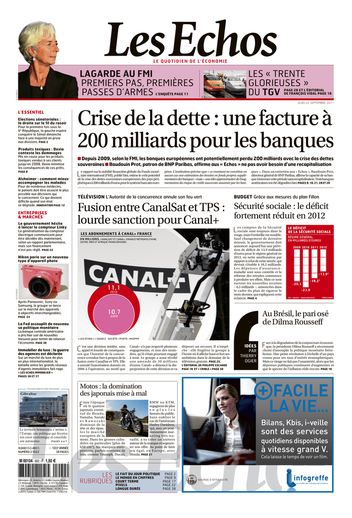 LE QUOTIDIEN DE L’ÉCONOMIE L’ENQUÊTE PAGE 11 LES « TRENTE GLORIEUSES » DU TGV PAGE 26 ET L’ÉDITORIAL DE FRANÇOIS VIDAL PAGE 16 DR BLOOMBERG LAGARDE AU FMI PREMIERS PAS, PREMIÈRES PASSES D’ARMES JEUDI 22 SEPTEMBRE 2011 L’ESSENTIEL Elections sénatoriales : la droite sur le fil du rasoir Pour la première fois sous la Ve République, la gauche espère conquérir le Sénat dimanche face à une majorité en proie aux divisions. PAGE 2 Produits toxiques : Dexia conteste les dommages Crise de la dette : une facture à 200 milliards pour les banques Mis en cause pour les produits toxiques vendus à ses clients jusqu’en 2008, Dexia minimise les conséquences de ces prêts. h Depuis 2009, selon le FMI, les banques européennes ont potentiellement perdu 200 milliards avec la crise des dettes souveraines h Baudouin Prot, patron de BNP Paribas, affirme aux « Echos » ne pas avoir besoin d’une recapitalisation PAGE 8 Ltaire international (FMI), publié hier, estime le coût potentiel e rapport sur la stabilité financière globale du Fonds moné- Alzheimer : comment mieux accompagner les malades Pour de nombreux médecins, le patient doit être associé le plus possible aux décisions qui le concernent. Ce qui devient difficile quand son état se dégrade. INNOVATION PAGE 12 ENTREPRISES & MARCHÉS Le gouvernement hésite à lancer le compteur Linky de la crise des dettes souveraines européennes des pays périphériquesà200milliardsd’eurospourlesystèmebancaireeuro- péen. L’institution précise que « ce montant ne constitue en aucun cas une estimation des besoins en fonds propres supplémentairesdesbanques »mais« uneidéeapproximativedel’augmentation du risque de crédit souverain assumée par les ban- ques ». Dans un entretien aux « Echos », Baudouin Prot, directeur général de BNP Paribas, affirme la capacité de sa banqueàtraversercettepériodesansrecapitalisation.Troisbanques américainesontétédégradéeshier. PAGES 9, 10, 21, 28 ET 29 TÉLÉVISION L‘Autorité de la concurrence annule son feu vert BUDGET Grâce aux mesures du plan Fillon Fusion entre CanalSat et TPS : lourde sanction pour Canal+ Sécurité sociale : le déficit fortement réduit en 2012 La généralisation du compteur électrique communicant peut être décidée dès maintenant, selon un rapport parlementaire, mais son financement n’est pas réglé. PAGE 22 es comptes de la Sécurité L sociale sont toujours dans le rouge, mais l’embellie est notable. Sauf changement de dernière minute, le gouvernement doit annoncer aujourd’hui une prévision de déficit de 13,9 milliards d’euros pour le régime général en 2012, en nette amélioration par rapport à celui de cette année, qui devrait s’établir à 18,2 milliards. L e s d é p e n s e s d’a ssu ra n c e maladie sont sous contrôle et la réforme des retraites commence à produire ses effets. Mais ce sont surtout les nouvelles recettes – 6,5 milliards –, annoncées dans le cadre du plan de rigueur le mois dernier, qui expliquent cette éclaircie. PAGE 4 BLOOMBERG Nikon parie sur un nouveau type d’appareil photo Après Panasonic, Sony ou Samsung, le groupe se lance sur le marché des appareils à objectifs interchangeables. Au Brésil, le pari osé de Dilma Rousseff PAGE 24 La Fed assouplit de nouveau sa politique monétaire La banque centrale américaine a pris hier soir de nouvelles mesures pour tenter de relancer l’économie. PAGE 30 Immobilier de luxe : la guerre des agences est déclarée Sur un marché du luxe de plus en plus internationalisé, la bataille entre les grands réseaux d’agents immobiliers fait rage. ’est une décision inédite, sans appel et lourde de conséquences que l’Autorité de la concurrence a rendue hier à propos de la fusion entre CanalSat et TPS. Elle a annulé l’autorisation donnée en 2006 à l’opération, au motif que C Canal+ n’a pas respecté plusieurs engagements, et non des moindres, qu’il s’était pourtant engagé à tenir. Le groupe a aussi récolté une amende de 30 millions d’euros. Canal+ a dénoncé la disproportion de cette décision et va déposer un recours. Il n’empêche : elle fragilise le groupe à l’heure où il affiche haut et fort ses ambitions dans le domaine de la télévision gratuite. PAGE 25, L’ÉDITORIAL DE PHILIPPE ESCANDE PAGE 16 ET « CRIBLE » PAGE 38 IDÉES PAR THIERRY OGIER ace à la dégradation de la conjoncture économi- F que, la présidente Dilma Rousseff a récemment choisi d’assouplir la politique monétaire brésilienne. Une petite révolution à l’échelle d’un pays connu pour ses taux d’intérêt stratosphériques. Mais ce virage ne fait pas l’unanimité, alors que les dépenses publiques continuent d’augmenter et que le spectre de l’inflation rôde encore. PAGE 16 « LES ECHOS IMMOBILIER » PAGES 36 ET 37 Gibraltar inie l’époque F où le quatuor Le territoire britannique s’arrime à l’Europe, une politique qui favorise son essor économique et consolide PAGES 6 et 7 son autonomie. ISSN0153.4831. NUMÉRO 21022 103e ANNÉE 38 PAGES Allemagne:2€.Andorre:2€.Antilles-Guyane-Réunion: 2€. Belgique : 1,80 €. Canada : 4,10 CAD. Espagne : 2,10€.Grande-Bretagne:1£60.Grèce:2,20€.Italie: 2,20 €. Luxembourg : 1,80 €. Maroc : 16 DH. Suisse : 3,20FS.Tunisie:2.100TNM.ZoneCFA:1.500CFA. FACILE LA VIE… Motos : la domination des japonais mise à mal japonais constitué de Honda, Yamaha, Suzuki et Kawasaki dominait de la tête et des épaules le marché européen de la moto. Dans les grosses cylindrées en particulier (plus de 650 cm 3 ), les marques européennes, parfois revenues de loin, comme Triumph, Ducati, LES RUBRIQUES BMW ou K TM, regagnent de plus en plus les faveurs du public. Sans oublier le cas de l’américain Harley-Davidson, qui, avec un positionnement marketing très travaillé, a su créer un univers autour de la marque et segmenter son offre. Au point de faire j e u é g a l , e n E