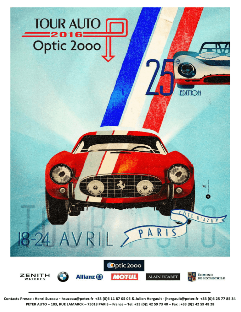 ____ Contacts Presse : Henri Suzeau - [email protected] +33 (0)6 11 87 05 05 & Julien Hergault - [email protected] +33 (0)6 25 77 85 34 PETER AUTO – 103, RUE LAMARCK – 75018 PARIS – France – Tel. +33 (0)1 42 59 73 40 – Fax : +33 (0)1 42 59 48 28 TOUR AUTO OPTIC 2ooo (18-24 AVRIL) SPECIAL 25ème EDITION Un quart de siècle, cela se fête ! La prochaine édition du Tour Auto Optic 2ooo - du 18 au 24 avril s’inscrit comme un évènement anniversaire très spécial et, à ce titre, proposera aux 230 équipages participants un parcours inédit qui se clôturera par une ronde de nuit sur des routes de rallye réputées de l’arrière-pays azuréen. Les voitures qui ont fait la légende du Tour seront, pour l'occasion, à l'honneur : Ferrari 250 GT Competizione, Jaguar 3,8 l MKII, Ligier JS2 … Comme le veut la tradition, l’édition 2016 du Tour Auto Optic 2ooo commencera le lundi 18 avril par une exposition des voitures au Grand Palais à Paris. Le lendemain (mardi 19 avril), les concurrents quitteront la capitale dès les premières heures de la matinée pour rejoindre le départ officiel qui aura lieu au Château de Courances. Ils se lanceront ensuite sur les routes de France et se mesureront lors d’épreuves chronométrées (Compétition ou Régularité) sur 4 circuits (Dijon-Prenois, Bresse, Lédenon, Paul Ricard) et 11 épreuves spéciales sur routes fermées. Le parcours du Tour Auto Optic 2ooo, chaque année renouvelé, fera étape à Beaune, Lyon et Valence, avant de rejoindre la côte méditerranéenne. Marseille sera le théâtre de l’arrivée de la 4ème étape. Puis, à l’issue d’un périple d’environ 2000 kilomètres, les concurrents rejoindront la Croisette, à Cannes, où sera jugée l’arrivée de la 25ème édition du Tour Auto Optic 2ooo. Deux épreuves spéciales de nuit Pour que cette édition ‘‘Anniversaire’’ reste dans les mémoires, Peter Auto a inscrit pour la première fois une ronde de nuit au programme. Ainsi, les concurrents qui rallieront Cannes samedi après-midi n’en auront pas terminé pour autant. En effet, après quelques heures de répit, tous les équipages reprendront le volant en direction des routes de l’arrière-pays azuréen pour un parcours nocturne ponctué par deux épreuves spéciales et une arrivée célébrée sur la Croisette, dans la nuit de samedi à dimanche, qui clôturera cette 25ème édition du Tour Auto Optic 2ooo. PARIS CANNES EN 5 ETAPES Lundi 18 avril GRAND PALAIS PARIS (Contrôles techniques et administratifs) Ouverture au public de 10h à 17h Mardi 19 avril 1ère étape PARIS – BEAUNE (463 km) Départ officiel du Rallye au Château de Courances (7h30-10h30) 1 épreuve spéciale + Circuit de Dijon-Prenois (15h30-20h00) Arrivée de l’étape : Palais des Congrès (Beaune) (18h30-22h00) Mercredi 20 avril 2ème étape BEAUNE – LYON (330 km) 2 épreuves spéciales + Circuit de Bresse (9h00-13h30) Arrivée de l’étape : Palais des Sports (Lyon) (18h30-21h00) Jeudi 21 avril 3ème étape LYON – VALENCE (395 km) 3 épreuves spéciales Arrivée de l’étape : Champ de Mars (Valence) (17h30-21h00) Vendredi 22 avril 4ème étape VALENCE– MARSEILLE (399 km) 2 épreuves spéciales + Circuit de Lédenon (15h00-19h15) Arrivée de l’étape : Esplanade J4 / MUCEM (Marseille) (18h00-22h00) Samedi 23 avril MARSEILLE – CANNES (408 km) Dimanche 24 avril 3 épreuves spéciales + Circuit Paul Ricard (11h30-16h00) 5ème étape Arrivée de l’épreuve : Croisette (Cannes) (16h30-2h30) LE PARCOURS 2016 - SPECIAL 25ème EDITION DES OUVREURS OFFICIELS DE PREMIER PLAN ARI VATANEN Champion du Monde des Rallyes en 1981 sur Ford Escort RS 1800, quadruple vainqueur du Paris-Dakar sur Peugeot 205 T16 Grand Raid (1987), Peugeot 405 Mi16 (1989, 1990) et Citroën ZX (1991), le pilote finlandais s’est également fait connaître en établissant en 1988 le nouveau record de la montée de Pikes Peak sur une Peugeot 405 T16 GR, performance immortalisée par le film Climb Dance (La course vers les nuages). Au terme de sa carrière sportive, Vatanen s’engage en politique et sera élu député européen en 1999 et 2004. Ambassadeur BMW, il sera ouvreur officiel sur un Coupé M4. FRANÇOIS CHATRIOT Brillant animateur du Championnat de France des Rallyes dans les années 80, avec deux titres en 1989 et 1990 sur BMW M3, François Chatriot, surnommé Le Chat, sera aussi le nouvel ouvreur du Tour Auto Optic 2ooo. Une compétition qu’il connaît bien pour l’avoir remportée sur Renault 5 Maxi Turbo en 1986 (année de la dernière édition du Tour de France Automobile). François Chatriot s’est également illustré lors de compétitions sur glace en remportant le Trophée Andros et les 24 Heures de Chamonix en 1995 sur Opel Astra. LUNDI 18 AVRIL : LE TOUR AUTO OPTIC 2ooo S’EXPOSE AU GRAND PALAIS Inauguré pour l'Exposition Universelle de 1900, le Grand Palais (photo) est un monument unique installé au cœur de Paris. Son architecture fastueuse de pierre, de métal et de verre, a conquis le cœur de plusieurs millions de visiteurs et de nombreux organisateurs. Théâtre du tout premier Salon de l’Automobile en 1901 et jusqu’en 1961, on ne compte plus les expositions à se disputer ce lieu d’exception, écrin idéal pour mettre en valeur objets d’art, défilés de mode et… voitures de collection. Pour la 25ème édition, elles seront de nouveau plus de deux cents machines, aux carrosseries parfaitement lustrées et aux mécaniques finement préparées, prêtes à s’élancer dès le lendemain sur les routes de France et à parcourir près de 2 000 kilomètres pour rejoindre Cannes cinq jours plus tard. MARDI 19 AVRIL : PARISBEAUNE (1 épreuve spéciale + Circuit de Dijon-Prenois) Dès les premières lueurs du jour, les voitures s’échapperont du Grand Palais pour rejoindre le Château de Courances (photo) d’où sera donné le départ officiel de l’édition 2016. Situé à quarante-sept kilomètres au su