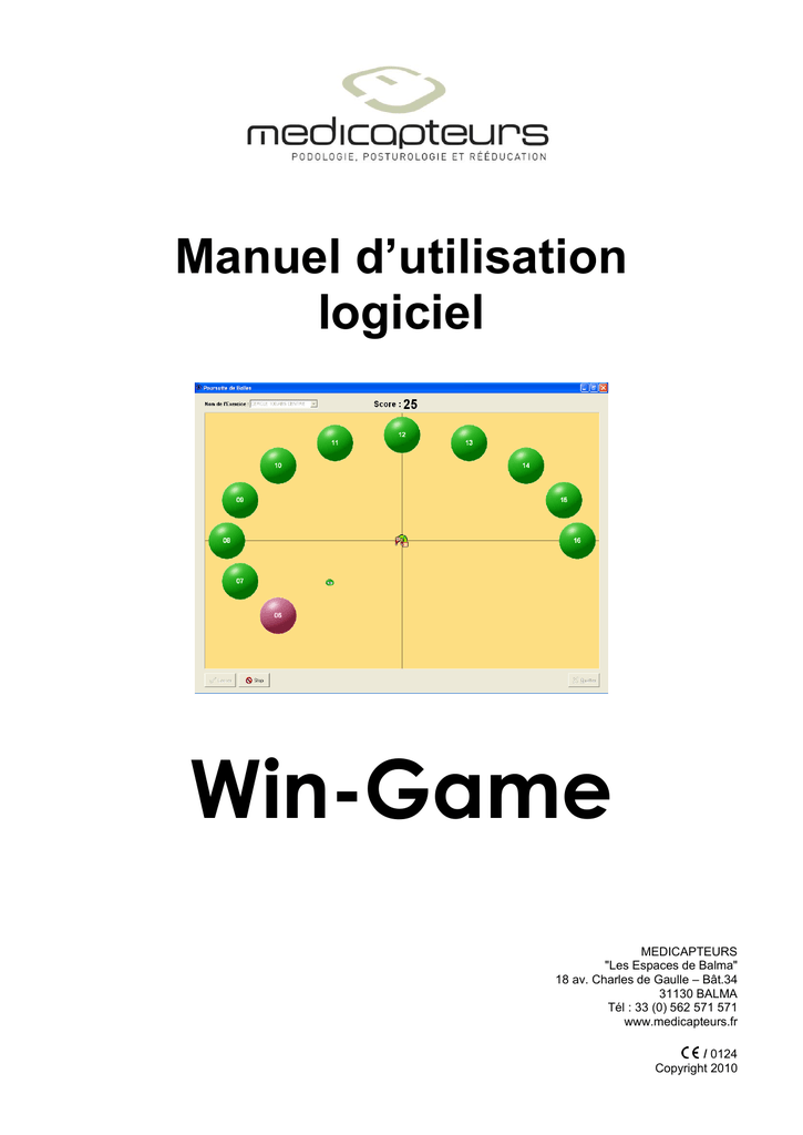 Manuel d’utilisation logiciel Win-Game MEDICAPTEURS "Les Espaces de Balma" 18 av. Charles de Gaulle – Bât.34 31130 BALMA Tél : 33 (0) 562 571 571 www.medicapteurs.fr / 0124 Copyright 2010 WINGAME – Manuel Utilisation Version 1.0 – Medicapteurs / 0124 – Copyright 2010 2 Avant-Propos Vous avez fait confiance à la société MEDICAPTEURS et nous vous en remercions. Ce logiciel a été conçu pour être utilisé avec le plus de facilité possible par des utilisateurs n’étant pas des experts en informatique. Néanmoins, la convivialité du logiciel ne vous dispense pas de lire attentivement ce manuel qui vous guidera pas à pas dans son utilisation, et vous fera gagner beaucoup de temps. WINGAME – Manuel Utilisation Version 1.0 – Medicapteurs / 0124 – Copyright 2010 3 WINGAME – Manuel Utilisation Version 1.0 – Medicapteurs / 0124 – Copyright 2010 4 Sommaire SOMMAIRE ............................................................................................................................................................................ 5 GARANTIE ............................................................................................................................................................................. 7 AVERTISSEMENT ................................................................................................................................................................ 9 LANCEMENT DU LOGICIEL ........................................................................................................................................... 11 QUITTER LE LOGICIEL ................................................................................................................................................... 11 ENVIRONNEMENT DU LOGICIEL ................................................................................................................................ 12 LA BARRE DE MENU ........................................................................................................................................................ 13 L’ONGLET "PATIENT" .................................................................................................................................................... 14 LA BARRE D’OUTILS ........................................................................................................................................................... 14 CREATION, MODIFICATION OU SUPPRESSION D’UN PATIENT ............................................................................................... 15 RAPPEL D’UN PATIENT EXISTANT ....................................................................................................................................... 15 L’ONGLET "EXERCICES" ............................................................................................................................................... 16 LA BARRE D’OUTILS ........................................................................................................................................................... 17 CREATION D’UNE MESURE (ACQUISITION) ......................................................................................................................... 17 PING PONG ......................................................................................................................................................................... 18 POURSUITE DE BALLES ....................................................................................................................................................... 20 APPARITION DE BALLES...................................................................................................................................................... 22 SURFACE DE POUSSEE ........................................................................................................................................................ 24 PACMAN ............................................................................................................................................................................ 26 IMPRESSION ....................................................................................................................................................................... 28 SAUVEGARDE DU FICHIER PATIENT ......................................................................................................................... 29 SAUVEGARDER LE FICHIER PATIENT ................................................................................................................................... 29 RECUPERER UN FICHIER PATIENT SAUVEGARDE ................................................................................................................. 29 WINGAME – Manuel Utilisation Version 1.0 – Medicapteurs / 0124 – Copyright 2010 5 WINGAME – Manuel Utilisation Version 1.0 – Medicapteurs / 0124 – Copyright 2010 6 Garantie Ce matériel est garanti de tout défaut de fabrication pendant 1 an à dater du jour de livraison. Pendant cette période, toute réparation ou remplacement de pièces défectueuses sera effectué par la société MEDICAPTEURS, à condition qu’aucune erreur d’utilisation ou d’installation n’ait été constatée. La totalité des frais de réexpédition en nos locaux est à la charge du client. Dans le cas où le dispositif devrait être réexpédié à MEDICAPTEURS pour réparation ou maintenance, précisez, en plus des coordonnées d’origine, le numéro de série de l’appareil et la description de l’anomalie constatée. Utilisez le carton et l’emballage d’origine. Dans le cas où celui-ci ne serait plus disponible, veuillez vous adresser à notre service expédition qui vous renseignera sur le type d’emballage à utiliser. Limites de la garantie La garantie n’est pas applicable aux détériorations causées sur le matériel par une mauv