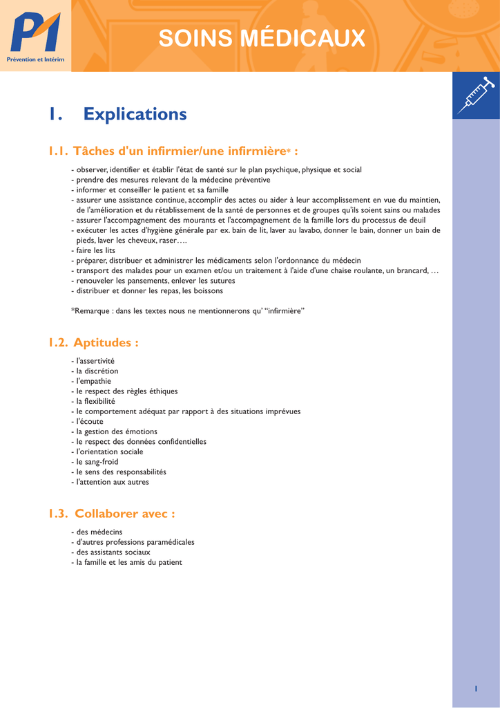 SOINS MÉDICAUX Prévention et Intérim 1. Explications 1.1. Tâches d'un infirmier/une infirmière* : - observer, identifier et établir l'état de santé sur le plan psychique, physique et social prendre des mesures relevant de la médecine préventive informer et conseiller le patient et sa famille assurer une assistance continue, accomplir des actes ou aider à leur accomplissement en vue du maintien, de l'amélioration et du rétablissement de la santé de personnes et de groupes qu'ils soient sains ou malades assurer l'accompagnement des mourants et l'accompagnement de la famille lors du processus de deuil exécuter les actes d'hygiène générale par ex. bain de lit, laver au lavabo, donner le bain, donner un bain de pieds, laver les cheveux, raser…. faire les lits préparer, distribuer et administrer les médicaments selon l'ordonnance du médecin transport des malades pour un examen et/ou un traitement à l'aide d'une chaise roulante, un brancard, … renouveler les pansements, enlever les sutures distribuer et donner les repas, les boissons *Remarque : dans les textes nous ne mentionnerons qu’ “infirmière” 1.2. Aptitudes : - l'assertivité la discrétion l'empathie le respect des règles éthiques la flexibilité le comportement adéquat par rapport à des situations imprévues l'écoute la gestion des émotions le respect des données confidentielles l'orientation sociale le sang-froid le sens des responsabilités l'attention aux autres 1.3. Collaborer avec : - des médecins d'autres professions paramédicales des assistants sociaux la famille et les amis du patient 1 SOINS MÉDICAUX 1.4. Emploi selon : - Groupe cible (enfants, adultes, personnes âgées) - Institution : 1. centre hospitalier avec ses différents services et consultations, classé en fonction des risques professionnels - Services médicaux en général : - médecine interne (e.a. : andrologie, cardiologie, dermatologie, diabétologie, endocrinologie, flébologie, gastro-entérologie, hématologie, immunologie, soins intensifs, néfrologie, neurologie, soins palliatifs, pneumologie, réadaptation, rhumatologie), maternité, fertilité, gynécologie, …. - chirurgie : générale, abdominale, centre des brûlés, cardiaque, thoracique, digestive, plastique, vasculaire, neurochirurgie, nez-gorge-oreilles, ophtalmo, orthopédie-traumatologie, stomatologie, urologie, … - Oncologie - Pédiatrie - Psychiatrie - Services médico-techniques : - Bloc opératoire - Service des urgences - Radiologie - Dialyse - Cliniques de jour 2. soins à domicile 3. centres pour visites médicales : inspection médico-scolaire (IMS), service externe de prévention et protection au travail (médecine du travail), entreprise 4. maison de repos et de soins (MRS), maison de repos (MR), institut médico-pédagogique (IMP), maison de soins psychiatriques (MSP), crèche - Statut de l'organisation : secteur privé ou public 1.5. Formation : Il y a deux niveaux de diplômes : - Diplôme d'infirmière hospitalière (ex infirmière A2) = formation du 4e degré de l'enseignement professionnel secondaire complémentaire - Bachelier en soins infirmiers/accoucheuse (ex infirmière A1 ou infirmière graduée/accoucheuse) = enseignement supérieur paramédical (ESP), infirmière ou accoucheuse. Des spécialisations se font en 1 an et permettent d'obtenir le titre d'infirmière spécialisée en pédiatrie, psychiatrie, gériatrie, salle d'opération, soins intensifs et aide médicale urgente, oncologie, imagerie médicale et radiothérapie, santé communautaire.… Les formations sont différentes selon la région. 1.6. Accès à la profession Un diplôme portant un visa et enregistré auprès de la commission médicale de la province où on a fait ses études. Remarque : Une infirmière en formation NE PEUT PAS exercer un job de vacances en tant qu'infirmière. Les autres jobs (sauf les interdits pour jobistes) sont permis. 2 2.1. En général Médecine interne, chirurgie, pédiatrie, psychiatrie, gériatrie Types de risques Risque biologique = transmettre des germes pathogènes via: • l'air (CMV, tuberculose, …) • la peau et les muqueuses (staphylococcus aureus, …) • le sang et liquides corporels (hépatite B et C, SIDA) • les voies digestives (salmonella, …) Conséquences pour la santé : • Contracter une maladie infectieuse ou autre maladie Charge physique Conséquences pour la santé, e.a. • fatigue • lésion dorsale • varices (longue station debout) Charge physique = • température: le froid, la chaleur • éclairage Conséquences pour la santé : - tomber plus facilement malade - fatigue - irritabilité - fatigue oculaire Protection Collective • Information et formation du personnel Individuelle • Porter les EPI : gants, masque, … • Suivre les procédures : - hygiène des mains - éviter les accidents par piqûres : utiliser les conteneurs d'aiguilles - trier et enlever les déchêts Remarques Fiches d'instructions : - Se laver les mains - Que faire en cas d'accidents par piqûre - Eviter les accidents par piqûres SOINS MÉDICAUX II. Risques et prévention Point d'attention particulier: protection de la travailleuse enceinte et de l'enfant à naître, par ex. infections par cytomégalovirus (CMV), rougeole, rubéole, varicelle • Conception et ergonomie des locaux • Formation gestes et postures • Formation pour utiliser les équipements actifs et passifs de levage, par ex. lits règlables en hauteur, soulève personne, siège règlable pour la douche • Vêtements de travail et chaussures adaptés : blouse et pantalon amples - chaussures stables et fermées • Aménagement du poste de travail, moins se déplacer • Ventilation, air-conditionné, individualisation du chauffage (vannes thermostatiques) • Saturateur (d'eau) Vêtements adaptés: blouse et pantalon amples Fiche d'instruction : manutention manuelle • Ergonomie : adapter l'éclairage au travail à exécuter par.ex. enlever les poi