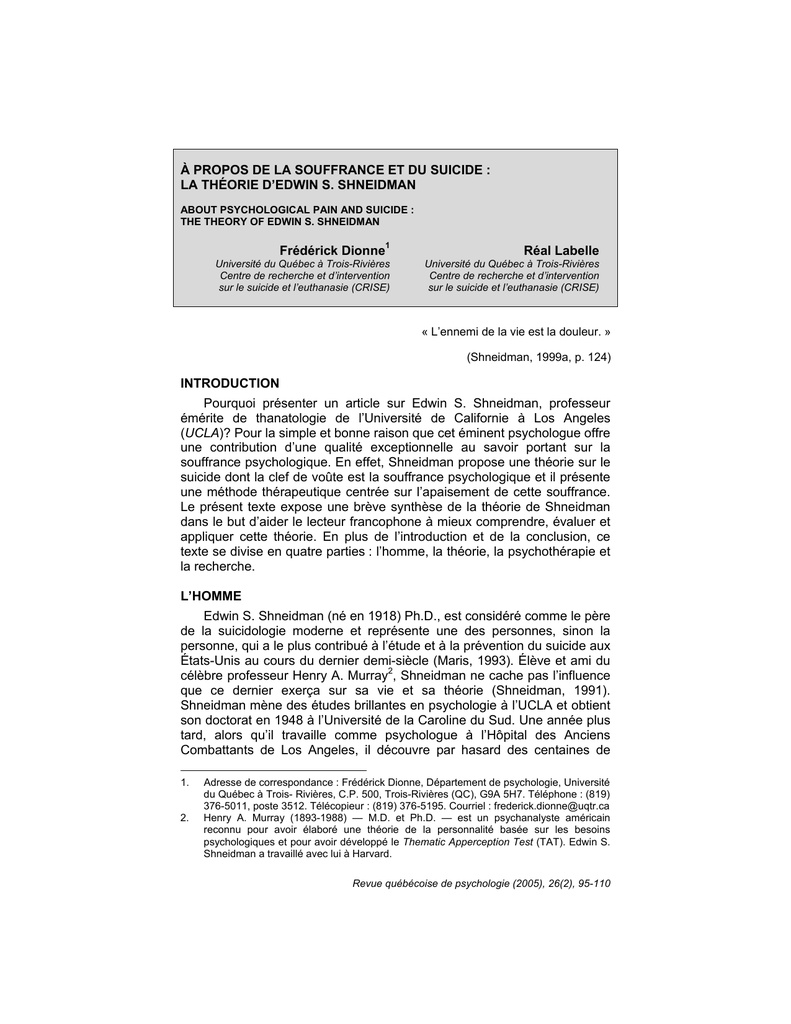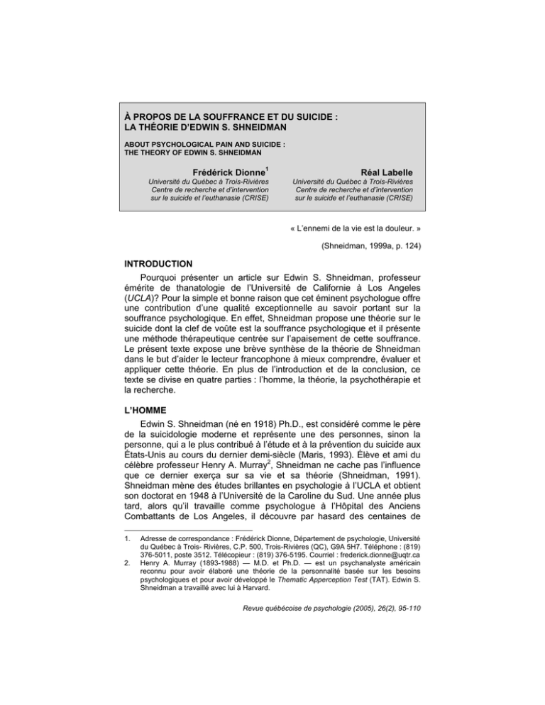 À PROPOS DE LA SOUFFRANCE ET DU SUICIDE : LA THÉORIE D’EDWIN S. SHNEIDMAN ABOUT PSYCHOLOGICAL PAIN AND SUICIDE : THE THEORY OF EDWIN S. SHNEIDMAN Frédérick Dionne1 Réal Labelle Université du Québec à Trois-Rivières Centre de recherche et d’intervention sur le suicide et l’euthanasie (CRISE) Université du Québec à Trois-Rivières Centre de recherche et d’intervention sur le suicide et l’euthanasie (CRISE) « L’ennemi de la vie est la douleur. » (Shneidman, 1999a, p. 124) INTRODUCTION Pourquoi présenter un article sur Edwin S. Shneidman, professeur émérite de thanatologie de l’Université de Californie à Los Angeles (UCLA)? Pour la simple et bonne raison que cet éminent psychologue offre une contribution d’une qualité exceptionnelle au savoir portant sur la souffrance psychologique. En effet, Shneidman propose une théorie sur le suicide dont la clef de voûte est la souffrance psychologique et il présente une méthode thérapeutique centrée sur l’apaisement de cette souffrance. Le présent texte expose une brève synthèse de la théorie de Shneidman dans le but d’aider le lecteur francophone à mieux comprendre, évaluer et appliquer cette théorie. En plus de l’introduction et de la conclusion, ce texte se divise en quatre parties : l’homme, la théorie, la psychothérapie et la recherche. L’HOMME Edwin S. Shneidman (né en 1918) Ph.D., est considéré comme le père de la suicidologie moderne et représente une des personnes, sinon la personne, qui a le plus contribué à l’étude et à la prévention du suicide aux États-Unis au cours du dernier demi-siècle (Maris, 1993). Élève et ami du célèbre professeur Henry A. Murray2, Shneidman ne cache pas l’influence que ce dernier exerça sur sa vie et sa théorie (Shneidman, 1991). Shneidman mène des études brillantes en psychologie à l’UCLA et obtient son doctorat en 1948 à l’Université de la Caroline du Sud. Une année plus tard, alors qu’il travaille comme psychologue à l’Hôpital des Anciens Combattants de Los Angeles, il découvre par hasard des centaines de 1. 2. Adresse de correspondance : Frédérick Dionne, Département de psychologie, Université du Québec à Trois- Rivières, C.P. 500, Trois-Rivières (QC), G9A 5H7. Téléphone : (819) 376-5011, poste 3512. Télécopieur : (819) 376-5195. Courriel : [email protected] Henry A. Murray (1893-1988) — M.D. et Ph.D. — est un psychanalyste américain reconnu pour avoir élaboré une théorie de la personnalité basée sur les besoins psychologiques et pour avoir développé le Thematic Apperception Test (TAT). Edwin S. Shneidman a travaillé avec lui à Harvard. Revue québécoise de psychologie (2005), 26(2), 95-110 À propos de la souffrance et du suicide notes de suicidés. Il photocopie ces notes et les compare plus tard « en aveugle » avec des notes de suicide rédigées par des personnes non suicidaires. Ce point tournant donnera par la suite naissance à une série de travaux novateurs dans le domaine du suicide, notamment son premier ouvrage intitulé Clues to Suicide (Shneidman et Farberow, 1957). C’est à Chicago que naît en 1968 l’Association américaine de suicidologie dirigée par Shneidman et Farberow. Parallèlement, en 1969, un Centre d’études sur le suicide est créé au sein du National Institute of Mental Health. Shneidman le dirigera plusieurs années. Il sera ensuite le fondateur et l’éditeur de plusieurs journaux scientifiques comme le Bulletin of Suicidology et Suicide and Life-Threatening Behavior. Actuellement, on compte plus de 170 livres, chapitres et articles publiés par Shneidman traitant la question du suicide. Il existe un seul ouvrage en langue française de Shneidman (1999a), Le tempérament suicidaire : Risques, souffrances et thérapies. LA THÉORIE Shneidman (1999a) est d’avis que le suicide est essentiellement un phénomène psychologique. Bien que le suicide comporte de multiples facettes (sociologiques, philosophiques, sociales, théologiques, neurochimiques, biologiques, statistiques, etc.), c’est l’état d’esprit de l’individu suicidaire qui nous rapproche le plus de la compréhension de ce phénomène. En bref, l’apport central de Shneidman sera de dire que presque tous les suicides sont causés par une seule et même chose : une souffrance psychologique insupportable (1993a; 1999a). Devant cette souffrance intolérable, la recherche active de la mort devient la façon d’interrompre le flux incessant d’une expérience consciente trop douloureuse. La souffrance psychologique, appelée le « psymal » (psychache), n’est pas le seul élément dans l’équation du suicide. Il faut aussi une pression négative, une perturbation psychologique marquée et l’idée du suicide comme solution à ses problèmes. Pour Shneidman, c’est à partir de ces quatre éléments que l’on peut comprendre la majorité des suicides. Le modèle cubique ou tridimensionnel qu’il propose (1987; 1989; 1992) est une synthèse théorique de sa conception du phénomène suicidaire. Essentiellement, c’est à l’aide d’études de cas, de tests projectifs, de notes de suicidés et d’autopsies psychologiques que Shneidman a développé sa vision de l’état d’esprit de l’individu suicidaire. En se référant à la Figure 1, on peut voir que, selon Shneidman, le suicide se produit lorsque le psymal, la pression négative ainsi que la perturbation sont à leur niveau maximum (5-5-5) et lorsque le suicide 96 RQP, 26(2) Figure 1 Modèle tridimensionnel de Shneidman devient une option disponible pour résoudre les problèmes d’un individu. Au cours des paragraphes qui suivent, chacun de ces quatre éléments sera expliqué. Le psymal Le psymal (psychache) est le terme employé par Shneidman pour désigner la souffrance psychologique insupportable qui est présente dans presque tous les cas de suicide. Ce concept est la pierre angulaire de sa théorie. Les gens