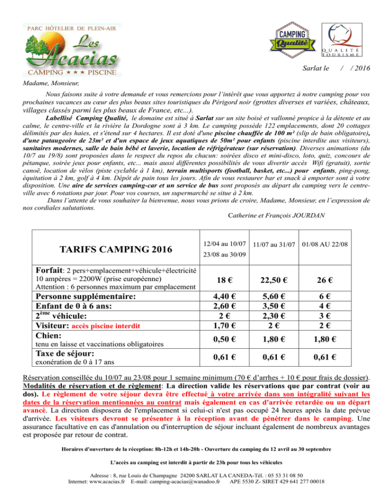 Sarlat le / / 2016 Madame, Monsieur, Nous faisons suite à votre demande et vous remercions pour l’intérêt que vous apportez à notre camping pour vos prochaines vacances au cœur des plus beaux sites touristiques du Périgord noir (grottes diverses et variées, châteaux, villages classés parmi les plus beaux de France, etc...). Labellisé Camping Qualité, le domaine est situé à Sarlat sur un site boisé et vallonné propice à la détente et au calme, le centre-ville et la rivière la Dordogne sont à 3 km. Le camping possède 122 emplacements, dont 20 cottages délimités par des haies, et s'étend sur 4 hectares. Il est doté d'une piscine chauffée de 100 m² (slip de bain obligatoire), d'une pataugeoire de 23m² et d'un espace de jeux aquatiques de 50m² pour enfants (piscine interdite aux visiteurs), sanitaires modernes, salle de bain bébé et laverie, location de réfrigérateur (sur réservation). Diverses animations (du 10/7 au 19/8) sont proposées dans le respect du repos du chacun: soirées disco et mini-disco, loto, quiz, concours de pétanque, soirée jeux pour enfants, etc... mais aussi différentes possibilités de vous divertir accès Wifi (gratuit), sortie canoë, location de vélos (piste cyclable à 1 km), terrain multisports (football, basket, etc...) pour enfants, ping-pong, équitation à 2 km, golf à 4 km. Dépôt de pain tous les jours. Afin de vous restaurer bar et snack à emporter sont à votre disposition. Une aire de services camping-car et un service de bus sont proposés au départ du camping vers le centreville avec 6 rotations par jour. Pour vos courses, un supermarché se situe à 2 km. Dans l’attente de vous souhaiter la bienvenue, nous vous prions de croire, Madame, Monsieur, en l’expression de nos cordiales salutations. Catherine et François JOURDAN TARIFS CAMPING 2016 12/04 au 10/07 11/07 au 31/07 01/08 AU 22/08 23/08 au 30/09 Forfait: 2 pers+emplacement+véhicule+électricité 10 ampères = 2200W (prise européenne) Attention : 6 personnes maximum par emplacement Personne supplémentaire: Enfant de 0 à 6 ans: 2ème véhicule: Visiteur: accès piscine interdit Chien: tenu en laisse et vaccinations obligatoires Taxe de séjour: exonération de 0 à 17 ans 18 € 22,50 € 26 € 4,40 € 2,60 € 2€ 1,70 € 5,60 € 3,50 € 2,30 € 2€ 6€ 4€ 3€ 2€ 0,50 € 1,80 € 1,80 € 0,61 € 0,61 € 0,61 € Réservation conseillée du 10/07 au 23/08 pour 1 semaine minimum (70 € d’arrhes + 10 € pour frais de dossier). Modalités de réservation et de règlement: La direction valide les réservations que par contrat (voir au dos). Le règlement de votre séjour devra être effectué à votre arrivée dans son intégralité suivant les dates de la réservation mentionnées au contrat mais également en cas d'arrivée retardée ou un départ avancé. La direction disposera de l'emplacement si celui-ci n'est pas occupé 24 heures après la date prévue d'arrivée. Les visiteurs devront se présenter à la réception avant de pénétrer dans le camping. Une assurance facultative en cas d'annulation ou d'interruption de séjour incluant également de nombreux avantages est proposée par retour de contrat. Horaires d'ouverture de la réception: 8h-12h et 14h-20h - Ouverture du camping du 12 avril au 30 septembre L’accès au camping est interdit à partir de 23h pour tous les véhicules Adresse : 8, rue Louis de Champagne 24200 SARLAT LA CANEDA-Tél. : 05 53 31 08 50 Internet: www.acacias.fr E-mail: [email protected] APE 5530 Z- SIRET 429 641 277 00018 RESERVATION CAMPING entre: PARC HÔTELIER DE PLEIN AIR / CAMPING « Les Acacias » 8, rue Louis de Champagne 24 200 SARLAT et NOM (Mr, Mme,Mlle)...........................................................................PRENOM:............................................................................. ADRESSE:...................................................................................................................................................CODE.POSTAL:............. VILLE:..................................................................PAYS:................................E.MAIL:....................................................................... TELEPHONE FIXE ET PORTABLE:............................................................................................................................................... PERSONNES 18 ANS ET +:….... (6 personnes maximum par emplacement). PERSONNES 7 à 17 ANS:……..... PERSONNES 0 à 6ANS:………... NBRE DE VOITURES:……......... ANIMAUX (nombre et race): ………...../.........................(chiens 1ère catégorie interdits, 2ème catégorie muselés) Location de réfrigérateur (une semaine minimum) possible dans la mesure où par sécurité le campeur prévoit un abri pour celui-ci, se renseigner par mail ou téléphone pour connaître les disponibilités puis écrire votre accord au bas de ce document: tarif 5 €uros/ jour et caution de 10 euros restituée après vérification du nettoyage (l’électricité est incluse dans le forfait) VOUS VENEZ SUR LE CAMPING AVEC: CARAVANE dimension:.........................................................(avec timon) TENTE dimension:............................................................................... CAMPING-CAR dimension:............................................................................... AUTRES : dimension:............................................................................... Le camping est équipé de prises européennes sur la plupart des emplacements, si besoin, adaptateur vendu 10 euros à la réception. En fonction du point de branchement le plus proche prévoir également une rallonge électrique d’environ 20 mètres. ARRIVÉE LE :...............................à partir de 12h. DÉPART LE : ..............................au plus tard à 12h. NB DE NUIT........ A réception de vos arrhes et frais de dossier ce contrat à vale