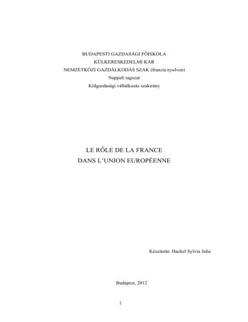 BUDAPESTI GAZDASÁGI FŐISKOLA KÜLKERESKEDELMI KAR NEMZETKÖZI GAZDÁLKODÁS SZAK (francia nyelven) Nappali tagozat Külgazdasági vállalkozás szakirány LE RÔLE DE LA FRANCE DANS L’UNION EUROPÉENNE Készitette: Hackel Sylvia Julie Budapest, 2012 1 Sommaire Sommaire ...................................................................................... 2 Listage des images ......................................................................... 4 Introduction................................................................................... 5 1 L’économie française ................................................................. 7 1.1 L’évolution de la situation économique....................................................................7 1.1.1 Le PIB ...................................................................................................................8 1.1.2 Le taux de chômage.............................................................................................12 1.1.3 La situation budgétaire : les déficits et dettes publics ........................................13 1.2 Les relations extérieures de la France ....................................................................15 1.2.1 Les relations commerciales : la balance commerciale et échanges commerciaux....................................................................................................................15 2 Le rôle historique de la France dans la Construction Européenne .. 19 2.1 2.1.1 Objectifs français et européens............................................................................20 2.1.2 Les apports et atouts de la France dans cette nouvelle intégration .....................21 2.2 3 Les débuts de l’intégration ......................................................................................19 La France et l’UE d’aujourd’hui ............................................................................23 2.2.1 L’enjeu des coopérations franco-allemandes ......................................................23 2.2.2 Le développement de l’Union : de 6 à 27 ...........................................................26 Le rôle politique de la France dans l’UE..................................... 27 3.1 La France et les principales politique communautaires .......................................27 3.1.1 La Politique Agricole Commune.........................................................................28 3.1.2 La Politique Régionale et de Cohésion ...............................................................32 3.2 Statut de la France dans la politique de l’ UE .......................................................33 3.2.1 3.2.1.1 Le Conseil de l’UE ................................................................................................... 34 3.2.1.2 La Commission européenne ..................................................................................... 35 3.2.1.3 Le Parlement européen ............................................................................................. 37 3.2.2 4 La France dans les principales Institutions Européennes ....................................34 La présidence française de 2008 .........................................................................38 3.2.2.1 Préparatifs................................................................................................................. 39 3.2.2.2 Objectifs.................................................................................................................... 40 Le rôle économique de la France dans l’UE ................................ 42 4.1 La France et l’euro ...................................................................................................42 2 4.1.1 4.2 Les avantages et inconvénients de l’euro ............................................................43 La France et le Commerce de l’UE.........................................................................46 4.2.1 Les investissements .............................................................................................46 4.2.1.1 Les IDE en France .................................................................................................... 47 4.2.1.2 Les IDE français á l’étranger.................................................................................... 51 4.2.2 Les partenaires commerciaux de la France .........................................................53 4.2.2.1 4.2.2.1.1 L’Allemagne ...................................................................................................... 54 4.2.2.1.2 Benelux .............................................................................................................. 55 4.2.2.1.3 Sud Européen .................................................................................................... 56 4.2.2.1.4 Nord Européen .................................................................................................. 56 4.2.2.2 4.3 5 Ses partenaires en Europe......................................................................................... 54 Ses partenaires hors Europe...................................................................................... 57 4.2.2.2.1 Les États-Unis ................................................................................................... 57 4.2.2.2.2 Les pays BRIC, la Chine ................................................................................... 57 4.2.2.2.3 Anciennes colonies : exemple du Maroc ........................................................... 58 La France et le budget européen.............................................................................59 La France et les défis de l’Union Européenne ............................. 61 5.1 La crise économique depuis 2008............................................................................61 5.2 Les défis à venir de l’U