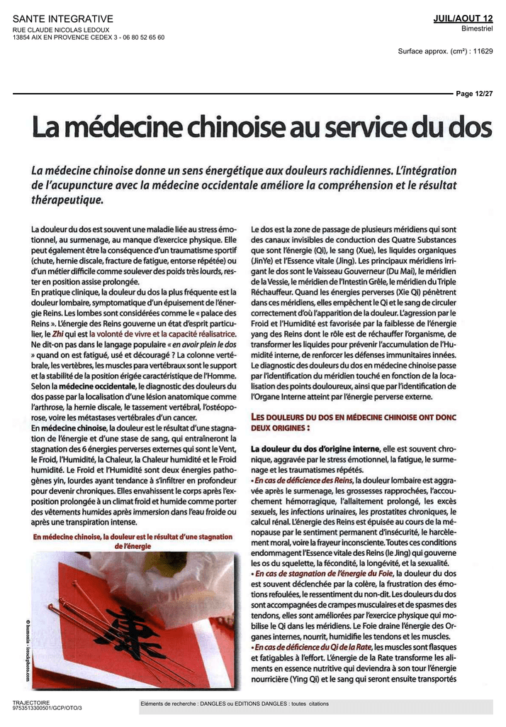 JUIL/AOUT 12 SANTE INTEGRATIVE Bimestriel RUE CLAUDE NICOLAS LEDOUX 13854 AIX EN PROVENCE CEDEX 3 - 06 80 52 65 60 Surface approx. (cm²) : 11629 Page 12/27 La médecine chinoise au service du dos La médecine chinoise donne un sens énergétique aux douleurs rachidiennes. L'intégration de l'acupuncture avec la médecine occidentale améliore la compréhension et le résultat thérapeutique. La douleur du dos est souvent une maladie liée au stress émotionnel, au surmenage, au manque d'exercice physique. Elle peut également être la conséquence d'un traumatisme sportif (chute, hernie discale, fracture de fatigue, entorse répétée) ou d'un métier difficile comme soulever des poids très lourds, rester en position assise prolongée. En pratique clinique, la douleur du dos la plus fréquente est la douleur lombaire, symptomatique d'un épuisement de l'énergie Reins. Les lombes sont considérées comme le « palace des Reins ». Lénergie des Reins gouverne un état d'esprit particulier, le Zh/qui est la volonté de vivre et la capacité réalisatrice. Ne dit-on pas dans le langage populaire « en avoir plein le dos » quand on est fatigué, usé et découragé ? La colonne vertébrale, les vertèbres, les muscles para vertébraux sont le support et la stabilité de la position érigée caractéristique de l'Homme. Selon la médecine occidentale, le diagnostic des douleurs du dos passe par la localisation d'une lésion anatomique comme l'arthrose, la hernie discale, le tassement vertébral, l'ostéoporose, voire les métastases vertébrales d'un cancer. En médecine chinoise, la douleur est le résultat d'une stagnation de l'énergie et d'une stase de sang, qui entraîneront la stagnation des 6 énergies perverses externes qui sont le Vent, le Froid, l'Humidité, la Chaleur, la Chaleur humidité et le Froid humidité. Le Froid et l'Humidité sont deux énergies pathogènes yin, lourdes ayant tendance à s'infiltrer en profondeur pour devenir chroniques. Elles envahissent le corps après l'exposition prolongée à un climat froid et humide comme porter des vêtements humides après immersion dans l'eau froide ou après une transpiration intense. En médecine chinoise, la douleur est le résultat d'une stagnation de l'énergie TRAJECTOIRE 9753513300501/GCP/OTO/3 Le dos est la zone de passage de plusieurs méridiens qui sont des canaux invisibles de conduction des Quatre Substances que sont l'énergie (Qi), le sang (Xue), les liquides organiques (JinYe) et l'Essence vitale (Jing). Les principaux méridiens irrigant le dos sont le Vaisseau Gouverneur (Du Mai), le méridien de la Vessie, le méridien de lintestin Grêle, le méridien duTriple Réchauffeur. Quand les énergies perverses (Xie Qi) pénètrent dans ces méridiens, elles empêchent le Qi et le sang de circuler correctement d'où l'apparition de la douleur. L'agression par le Froid et l'Humidité est favorisée par la faiblesse de l'énergie yang des Reins dont le rôle est de réchauffer l'organisme, de transformer les liquides pour prévenir l'accumulation de l'Humidité interne, de renforcer les défenses immunitaires innées. Le diagnostic des douleurs du dos en médecine chinoise passe par l'identification du méridien touché en fonction de la localisation des points douloureux, ainsi que par l'identification de l'Organe Interne atteint par l'énergie perverse externe. LES DOULEURS DU DOS EN MÉDECINE CHINOISE ONT DONC DEUX ORIGINES : La douleur du dos d'origine interne, elle est souvent chronique, aggravée par le stress émotionnel, la fatigue, le surmenage et les traumatismes répétés. • En cas de déficience des Reins, la douleur lombaire est aggravée après le surmenage, les grossesses rapprochées, l'accouchement hémorragique, l'allaitement prolonge, les excès sexuels, les infections urinaires, les prostatites chroniques, le calcul rénal. L'énergie des Reins est épuisée au cours de la ménopause par le sentiment permanent d'insécurité, le harcèlement moral, voire la frayeur inconsciente.Toutes ces conditions endommagent l'Essence vitale des Reins (le Jing) qui gouverne les os du squelette, la fécondité, la longévité, et la sexualité. • En cas de stagnation de l'énergie du Foie, la douleur du dos est souvent déclenchée par la colère, la frustration des émotions refoulées, le ressentiment du non-dit. Les douleurs du dos sont accompagnées de crampes musculaires et de spasmes des tendons, elles sont améliorées par lexercice physique qui mobilise le Qi dans les méridiens. Le Foie draine l'énergie des Organes internes, nourrit, humidifie les tendons et les muscles. • En cas de déficience du Qi de la Rate, les muscles sont flasques et fatigables à l'effort. Lénergie de la Rate transforme les aliments en essence nutritive qui deviendra à son tour l'énergie nourricière (Ying Qi) et le sang qui seront ensuite transportés Eléments de recherche : DANGLES ou EDITIONS DANGLES : toutes citations JUIL/AOUT 12 SANTE INTEGRATIVE Bimestriel RUE CLAUDE NICOLAS LEDOUX 13854 AIX EN PROVENCE CEDEX 3 - 06 80 52 65 60 Surface approx. (cm²) : 11629 Page 13/27 jusqu'aux muscles. La douleur du dos liée à la déficience du Qi de la Rate s'aggrave à l'effort, elle est accentuée par l'Humidité perverse externe. La déficience du Qi de la Rate produit un excès d'Humidite interne et de Mucosités, elle est le terrain énergétique spécifique chez les patients en surpoids qui souvent digèrent mal, ont des selles molles, ballonnent et sont fatigues après le repas. Leur surpoids aggrave leur douleur du dos. • En cas de stagnation de sang, la douleur du dos peut être aigue ou chronique, elle est fixe car la stase de sang est déjà un signe d'aggravation d'une stagnation chronique du Qi. Ce type de douleur s'installe souvent à la suite de traumatismes répétés (hernie discale, chute sur le sacrum, entorses répétées de la cheville). La douleur du dos d'origine externe est due à l'invasion des