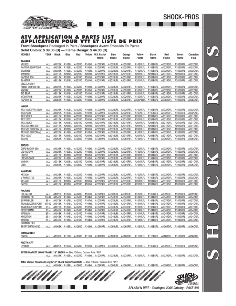 SHOCK-PROS Front Shockpros Packaged In Pairs / Shockpros Avant Emballés En Paires Solid Colors: $ 39.00 (G) — Flame Design: $ 44.00 (G) MODELS YEAR Black Blue Red Blue Flame Orange Flame Yellow Flame Black Flame Red Flame Green Flame Canadian Flag ALL ALL ALL ALL ALL ALL A102BK A102BK A102BK A201BK A201BK A201BK A102BL A102BL A102BL A201BL A201BL A201BL A102RD A102RD A102RD A201RD A201RD A201RD A102YL A102YL A102YL A201YL A201YL A201YL A102PAFL A102PAFL A102PAFL A201PAFL A201PAFL A201PAFL A102BLFL A102BLFL A102BLFL A201BLFL A201BLFL A201BLFL A102ORFL A102ORFL A102ORFL A201ORFL A201ORFL A201ORFL A102YLFL A102YLFL A102YLFL A201YLFL A201YLFL A201YLFL A102BKFL A102BKFL A102BKFL A201BKFL A201BKFL A201BKFL A102RDFL A102RDFL A102RDFL A201RDFL A201RDFL A201RDFL A102GRFL A102GRFL A102GRFL A201GRFL A201GRFL A201GRFL A102CAFL A102CAFL A102CAFL A201CAFL A201CAFL A201CAFL ALL ALL ALL ALL ALL A102BK A102BK A201BK A102BK A106BK A102BL A102BL A201BL A102BL A106BL A102RD A102RD A201RD A102RD A106RD A102YL A102YL A201YL A102YL A106YL A102PAFL A102PAFL A201PAFL A102PAFL A106PAFL A102BLFL A102BLFL A201BLFL A102BLFL A106BLFL A102ORFL A102YLFL A102ORFL A102YLFL A201ORFL A201YLFL A102ORFL A102YLFL A106ORFL A106PYLFL A102BKFL A102BKFL A201BKFL A102BKFL A106BKFL A102RDFL A102RDFL A201RDFL A102RDFL A106RDFL A102GRFL A102GRFL A201GRFL A102GRFL A106GRFL A102CAFL A102CAFL A201CAFL A102CAFL A106CAFL HONDA TRX 400EX/TRX450R TRX 250R TRX 300EX TRX 250X TRX 250EX TRX 350,400,450 TRX 500 RUBICON (4) TRX 650 RINCON (4) TRX 400AT TRX 90 ALL ALL ALL ALL ALL ALL ALL ALL ALL ALL A102BK A102BK A201BK A201BK A201BK A201BK A201BK A102BK A201BK A106BK A102BL A102BL A201BL A201BL A201BL A201BL A201BL A102BL A201BL A106BL A102RD A102RD A201RD A201RD A201RD A201RD A201RD A102RD A201RD A106RD A102YL A102YL A201YL A201YL A201YL A201YL A201YL A102YL A201YL A106YL A102PAFL A102PAFL A201PAFL A201PAFL A201PAFL A201PAFL A201PAFL A102PAFL A201PAFL A106PAFL A102BLFL A102BLFL A201BLFL A201BLFL A201BLFL A201BLFL A201BLFL A102BLFL A201BLFL A106BLFL A102ORFL A102ORFL A201ORFL A201ORFL A201ORFL A201ORFL A201ORFL A102ORFL A201ORFL A106ORFL A102YLFL A102YLFL A201YLFL A201YLFL A201YLFL A201YLFL A201YLFL A102YLFL A201YLFL A106YLFL A102BKFL A102BKFL A201BKFL A201BKFL A201BKFL A201BKFL A201BKFL A102BKFL A201BKFL A106BKFL A102RDFL A102RDFL A201RDFL A201RDFL A201RDFL A201RDFL A201RDFL A102RDFL A201RDFL A106RDFL A102GRFL A102GRFL A201GRFL A201GRFL A201GRFL A201GRFL A201GRFL A102GRFL A201GRFL A106GRFL A102CAFL A102CAFL A201CAFL A201CAFL A201CAFL A201CAFL A201CAFL A102CAFL A201CAFL A106CAFL SUZUKI QUAD RACER 450 LTZ400/DVX LTZ250 LT250R/500R VINSON LT80 ALL ALL ALL ALL ALL ALL A102BK A102BK A201BK A102BK A201BK A106BK A102BL A102BL A201BL A102BL A201BL A106BL A102RD A102RD A201RD A102RD A201RD A106RD A102YL A102YL A201YL A102YL A201YL A106YL A102PAFL A102PAFL A201PAFL A102PAFL A201PAFL A106PAFL A102BLFL A102BLFL A201BLFL A102BLFL A201BLFL A106BLFL A102ORFL A102ORFL A201ORFL A102ORFL A201ORFL A106ORFL A102YLFL A102YLFL A201YLFL A102YLFL A201YLFL A106YLFL A102BKFL A102BKFL A201BKFL A102BKFL A201BKFL A106BKFL A102RDFL A102RDFL A201RDFL A102RDFL A201RDFL A106RDFL A102GRFL A102GRFL A201GRFL A102GRFL A201GRFL A106GRFL A102CAFL A102CAFL A201CAFL A102CAFL A201CAFL A106CAFL KAWASAKI KFX400 V-FORCE 700 MOJAVE BAYOU ALL ALL ALL ALL A102BK A102BK A201BK A201BK A102BL A102BL A201BL A201BL A102RD A102RD A201RD A201RD A102YL A102YL A201YL A201YL A102PAFL A102PAFL A201PAFL A201PAFL A102BLFL A102BLFL A201BLFL A201BLFL A102ORFL A102ORFL A201ORFL A201ORFL A102YLFL A102YLFL A201YLFL A201YLFL A102BKFL A102BKFL A201BKFL A201BKFL A102RDFL A102RDFL A201RDFL A201RDFL A102GRFL A102GRFL A201GRFL A201GRFL A102CAFL A102CAFL A201CAFL A201CAFL ALL 95-97 98 + 95-02 03 + 95 + 95 + 95 + 95 + A102BK A104BK A107BK A104BK A107BK A104BK A104BK A104BK A104BK A102BL A104BL A107BL A104BL A107BL A104BL A104BL A104BL A104BL A102RD A104RD A107RD A104RD A107RD A104RD A104RD A104RD A104RD A102YL A104YL A107YL A104YL A107YL A104YL A104YL A104YL A104YL A102PAFL A104PAFL A107PAFL A104PAFL A107PAFL A104PAFL A104PAFL A104PAFL A104PAFL A102BLFL A104BLFL A107BLFL A104BLFL A107BLFL A104BLFL A104BLFL A104BLFL A104BLFL A102ORFL A104ORFL A107ORFL A104ORFL A107ORFL A104ORFL A104ORFL A104ORFL A104ORFL A102YLFL A104YLFL A107YLFL A104YLFL A107YLFL A104YLFL A104YLFL A104YLFL A104YLFL A102BKFL A104BKFL A107BKFL A104BKFL A107BKFL A104BKFL A104BKFL A104BKFL A104BKFL A102RDFL A104RDFL A107RDFL A104RDFL A107RDFL A104RDFL A104RDFL A104RDFL A104RDFL A102GRFL A104GRFL A107GRFL A104GRFL A107GRFL A104GRFL A104GRFL A104GRFL A104GRFL A102CAFL A104CAFL A107CAFL A104CAFL A107CAFL A104CAFL A104CAFL A104CAFL A104CAFL ALL A106BK A106BL A106RD A106YL A106PAFL A106BLFL A106ORFL A106YLFL A106BKFL A106RDFL A106GRFL A106CAFL BOMBARDIER DS650 ALL A110BK A110BL A110RD A110YL A110PAFL A110BLFL A110ORFL A110YLFL A110BKFL A110RDFL A110GRFL A110CAFL ARCTIC CAT DVX400 ALL A102BK A102BL A102RD A102YL A102PAFL A102BLFL A102ORFL A102YLFL A102BKFL A102RDFL A102GRFL A102CAFL AFTER MARKET LONG TRAVEL 19” SHOCK — Elka /Ohlins / Custom Axis / PEP ALL A103BK A103BL A103RD A103YL A103PAFL A103BLFL A103ORFL A103YLFL A103BKFL A103RDFL A103GRFL A103CAFL After Market Standard Length 16” Shock Triple/Dual Rate — Elka /Ohlins / Custom Axis / PEP ALL A109BK A109BL A109RD A109YL A109PAFL A109BLFL A109ORFL A109YLFL A109BKFL A109RDFL A109GRFL A109CAFL YAMAHA YFZ450 RAPTOR 660R/700R BANSHEE WARRIOR RAPTOR 350 BLASTER GRIZZLY 660 / RHINO 660/450 (4) KODIAK BIG BEAR WOLVERINE RAPTOR 80 POLARIS PREDATOR SCRAMBLER SCRAMBLER TRAILBLAZER/SPORT TRAILBLAZER/SPORT SPORTSMAN MAGNUM XPEDITION XPRESS SCRAMBLER / SPORTSMAN 50/90 Yellow U.S. Patriot Flame SPLASH’N DIRT - Catalogue 2005 Catalog - PAGE 493 S H O C K - P R O S ATV APPLICATION & PARTS LIST APPLICATION POUR VTT ET LISTE DE PRIX SHOCK-PROS ATV APPLICATION & PARTS LIST APPLICATION POUR VTT ET LISTE DE PRIX Rear Shockpros packaged in singles unless noted / Shockpros Arrière emballés à l’unité sauf si di