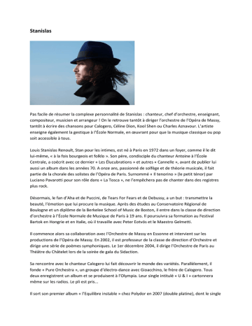 Stanislas Pas facile de résumer la complexe personnalité de Stanislas : chanteur, chef d’orchestre, enseignant, compositeur, musicien et arrangeur ! On le retrouve tantôt à diriger l’orchestre de l’Opéra de Massy, tantôt à écrire des chansons pour Calogero, Céline Dion, Kool Shen ou Charles Aznavour. L’artiste enseigne également la gestique à l’École Normale, en œuvrant pour que la musique classique ou pop soit accessible à tous. Louis Stanislas Renoult, Stan pour les intimes, est né à Paris en 1972 dans un foyer, comme il le dit lui-même, « à la fois bourgeois et folklo ». Son père, condisciple du chanteur Antoine à l’École Centrale, a coécrit avec ce dernier « Les Élucubrations » et autres « Cannelle », avant de publier lui aussi un album dans les années 70. A onze ans, passionné de solfège et de théorie musicale, il fait partie de la chorale des solistes de l’Opéra de Paris. Surnommé « Il tenorino » (le petit ténor) par Luciano Pavarotti pour son rôle dans « La Tosca », ne l’empêchera pas de chanter dans des registres plus rock. Désormais, le fan d’Aha et de Puccini, de Tears For Fears et de Debussy, a un but : transmettre la beauté, l’émotion que lui procure la musique. Après des études au Conservatoire Régional de Boulogne et un diplôme de la Berkelee School of Music de Boston, il entre dans la classe de direction d’orchestre à l’École Normale de Musique de Paris à 19 ans. Il poursuivra sa formation au Festival Bartok en Hongrie et en Italie, où il travaille avec Peter Eotvös et le Maestro Gelmetti. Il commence alors sa collaboration avec l’Orchestre de Massy en Essonne et intervient sur les productions de l’Opéra de Massy. En 2002, il est professeur de la classe de direction d’Orchestre et dirige une série de poèmes symphoniques. Le 1er décembre 2004, il dirige l’Orchestre de Paris au Théâtre du Châtelet lors de la soirée de gala du Sidaction. Sa rencontre avec le chanteur Calogero lui fait découvrir le monde des variétés. Parallèlement, il fonde « Pure Orchestra », un groupe d’électro-dance avec Gioacchino, le frère de Calogero. Tous deux enregistrent un album et se produisent à l’Olympia. Leur single intitulé « U & I » cartonnera même sur les radios. Le pli est pris... Il sort son premier album « l’Equilibre instable » chez Polydor en 2007 (double platine), dont le single « Le Manège » cartonne. En parallèle, il continue sa carrière de chef d’orchestre en dirigeant, la même année, la 7eme Symphonie de Beethoven au Château de Versailles et en devenant responsable de la formation "Direction d'orchestre" de l'Ariam Ile de France. Il est également nommé à la tête de l'Orchestre de L'union des conservatoires de l'Essonne. Avec l'aide d'Universal Music Publishing et du conservatoire de la ville de Suresnes, Stanislas met en place l’Atelier d'écriture musicale accueillant pour un an des "stagiaires" de tout horizon musical. Cette classe accueille une fois par semaine un invité pour décortiquer son travail d'auteur ou de compositeur avec les élèves (Alain CHAMFORT, CALOGERO, BENJAMIN BIOLAY, Maxime LE FORESTIER, ...). Il sort son second album “Les carnets de la Vigie” en 2009 (disque d'or), puis un album “Tribute to Fred Astaire chez Universal Jazz”, en 2011 chez Decca. C’est alors que M6 et Disney le contacte pour diriger au Grand Rex le spectacle “La Symphonie des Grands classiques Disney”, première fois créé en Europe, où il dirige un orchestre de 70 musiciens. En 2012, il crée avec son ami Calogéro le groupe « Circus », dont il compose la moitié de l’album et qui devient dès sa sortie, en janvier 2013, une valeur importante de la pop française. En 2014, Stanislas est invité par Jenifer pour être coach vocal de l’émission The Voice France. 2014 marque également la sortie de son nouvel album « Ma solitude », sorti en mai. Stanislas a un parcours atypique et profite de cette différence pour donner, à chaque nouveau projet, l'éclairage singulier que réclame la vie culturelle de notre temps. Site officiel : http://www.stanislasmusic.fr/