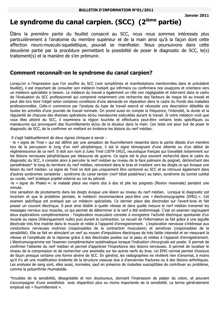 BULLETIN D'INFORMATION N°01/2011 Janvier 2011 Le syndrome du canal carpien. (SCC) (2 ième partie) Dans la première partie du feuillet consacré au SCC, nous nous sommes intéressés plus particulièrement à l’anatomie du membre supérieur et de la main ainsi qu’à la façon dont cette affection neuro-musculo-squelettique, pouvait se manifester. Nous poursuivons dans cette deuxième partie par la procédure permettant la possibilité de poser le diagnostic de SCC, le(s) traitement(s) et la manière de s’en prémunir. Comment reconnaît-on le syndrome du canal carpien? Lorsqu’on a l’impression que l’on souffre du SCC (voir symptômes et manifestations mentionnées dans le précédent feuillet), il est important de consulter son médecin traitant qui infirmera ou confirmera nos soupçons et orientera vers un médecin spécialiste si besoin. Le médecin du travail a également un rôle non négligeable et intervient dans le cadre de l'évaluation du SCC professionnel qui comprend notamment une recherche des facteurs de risque lié au travail et peut dès lors faire l’objet selon certaines conditions d’une demande en réparation dans le cadre du Fonds des maladies professionnelles. Celle-ci commence par l'analyse du type de travail exercé et nécessite une description détaillée de toutes les activités d'une journée de travail normale. On prend aussi en compte la fréquence, l'intensité, la durée et la régularité de chacune des diverses opérations et/ou manœuvres exécutées durant le travail. Si votre médecin croit que vous êtes atteint du SCC, il examinera la région touchée et effectuera peut-être certains tests spécifiques ou manœuvres qui provoquent des fourmillements et/ou de la douleur dans la main. Ces tests ont pour but de poser le diagnostic de SCC, de le confirmer en mettant en évidence les lésions du nerf médian. Il s'agit habituellement de deux signes cliniques à savoir : - le « signe de Tinel » qui est définit par une sensation de fourmillement ressentie dans la partie distale d'un membre lors de la percussion le long d'un nerf périphérique, il est le signe témoignant d'une atteinte ou d'un début de régénérescence de ce nerf. Il doit son nom à Jules Tinel (1879-1952), neurologue français qui travaillait notamment sur les lésions nerveuses périphériques par blessures de guerre. Ce signe est le plus souvent recherché dans le cadre du diagnostic du SCC, il consiste alors à percuter le nerf médian au niveau de la face palmaire du poignet, déclenchant des paresthésies* le long du territoire du nerf médian, remontant dans le bras et irradiant vers les doigts ce qui évoque une lésion du nerf médian. Le signe de Tinel ne doit pas uniquement être cantonné au SCC et se retrouve également dans d'autres syndromes canalaires : syndrome du canal tarsien (nerf tibial postérieur) au talon, syndrome du tunnel cubital au coude, nerf sciatique poplité externe au col du péroné. -le « signe de Phalen »: le malade place ses mains dos à dos et plie les poignets (flexion maximale) pendant une minute. Une sensation de picotements dans les doigts évoque une lésion au niveau du nerf médian. Lorsque le diagnostic est incertain et que le problème persiste, le médecin recommandera peut-être une « électromyographie (EMG) ». Cet examen spécifique est pratiqué par un médecin spécialiste. Ce dernier place des électrodes sur l'avant-bras et fait passer un courant électrique. Il peut ainsi établir à quelle vitesse et dans quelle mesure le nerf médian transmet les messages nerveux aux muscles, ce qui permet de déterminer si le nerf a été endommagé. C’est un examen regroupant deux explorations complémentaires : l'exploration musculaire consiste à enregistrer l’activité électrique spontanée d'un muscle au repos (théoriquement nulle) puis durant la contraction. Le recueil de l'information se fait grâce à une aiguille électrode très fine insérée dans le muscle et reliée à l'appareil d'enregistrement. L'exploration nerveuse s'intéresse aux conductions nerveuses motrices (responsables de la contraction musculaire) et sensitives (responsables de la sensibilité). Elle se fait en stimulant un nerf au moyen d'impulsions électriques de très faible intensité et en mesurant la vitesse et l'amplitude de la réponse grâce à des électrodes posées sur la peau et reliées à l'appareil d'enregistrement. L’électromyogramme est l’examen complémentaire systématique lorsque l’indication chirurgicale est posée. Il permet de confirmer l'atteinte du nerf médian et permet d'apprécier l'importance des lésions nerveuses. Il permet de localiser le niveau de la compression et de rechercher une anomalie sur les autres nerfs du bras. Un EMG normal permet d'exclure de façon presque certaine une forme sévère de SCC. En général, les radiographies ne révèlent rien d'anormal, à moins qu'il n'y ait une modification évidente de la structure osseuse due à d'anciennes fractures ou à des lésions arthritiques. Les analyses de sang sont, elles aussi, normales, sauf en présence de maladies susceptibles de contribuer au problème, comme la polyarthrite rhumatoïde. *troubles de la sensibilité, désagréable et non douloureux, donnant l'impression de palper du coton, et pouvant s'accompagner d'une anesthésie avec disparition plus ou moins importante de la sensibilité. Le terme généralement employé est « fourmillement ». Comment traite-t-on un syndrome du canal carpien ? On distingue le traitement conservateur (attelle et traitement médicamenteux) et le traitement chirurgical. Le traitement médical est assorti de l’arrêt des mouvements ayant entraîné l’apparition du SCC. En cas d’affection professionnelle, la modification du geste professionnel est impérative, réduction des microtraumatismes, suppression de l’exposition par exemple aux vibrations mécaniques. - le traitement conservateur s’a