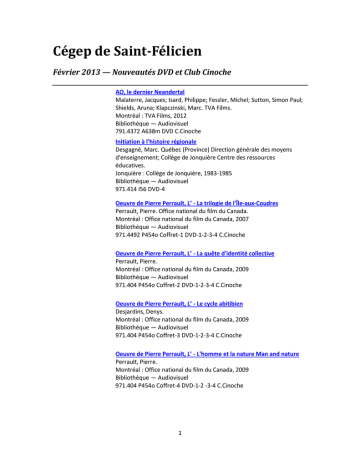 Cégep de Saint-Félicien Février 2013 — Nouveautés DVD et Club Cinoche AO, le dernier Neandertal Malaterre, Jacques; Isard, Philippe; Fessler, Michel; Sutton, Simon Paul; Shields, Aruna; Klapczinski, Marc. TVA Films. Montréal : TVA Films, 2012 Bibliothèque — Audiovisuel 791.4372 A638m DVD C.Cinoche Initiation à l'histoire régionale Desgagné, Marc. Québec (Province) Direction générale des moyens d'enseignement; Collège de Jonquière Centre des ressources éducatives. Jonquière : Collège de Jonquière, 1983-1985 Bibliothèque — Audiovisuel 971.414 I56 DVD-4 Oeuvre de Pierre Perrault, L’ - La trilogie de l'Île-aux-Coudres Perrault, Pierre. Office national du film du Canada. Montréal : Office national du film du Canada, 2007 Bibliothèque — Audiovisuel 971.4492 P454o Coffret-1 DVD-1-2-3-4 C.Cinoche Oeuvre de Pierre Perrault, L’ - La quête d'identité collective Perrault, Pierre. Montréal : Office national du film du Canada, 2009 Bibliothèque — Audiovisuel 971.404 P454o Coffret-2 DVD-1-2-3-4 C.Cinoche Oeuvre de Pierre Perrault, L’ - Le cycle abitibien Desjardins, Denys. Montréal : Office national du film du Canada, 2009 Bibliothèque — Audiovisuel 971.404 P454o Coffret-3 DVD-1-2-3-4 C.Cinoche Oeuvre de Pierre Perrault, L’ - L'homme et la nature Man and nature Perrault, Pierre. Montréal : Office national du film du Canada, 2009 Bibliothèque — Audiovisuel 971.404 P454o Coffret-4 DVD-1-2 -3-4 C.Cinoche 1 Oeuvre de Pierre Perrault, L’ - Le fleuve Perrault, Pierre; Boulais, Stéphane-Albert. Office national du film du Canada. Montréal : Office national du film du Canada, 2009 Bibliothèque — Audiovisuel 971.0113 P454o Coffret-5 DVD-1-2 -3-4 C.Cinoche Porte d'or, La Crialese, Emanuele; Gainsbourg, Charlotte; Amato, Vincenzo; Quattrocchi, Aurora; Monthieux, Maryline; Castrignano, Antonio. Montréal : Christal Films, 2007 Bibliothèque — Audiovisuel 791.4372 P843 DVD C.Cinoche 2 Cégep de Saint-Félicien Février 2013 — Nouveautés Littérature et BD Andante Leclerc, Félix. Anjou : Fides, 2012 Bibliothèque – Collection générale C841.914 L462a Antares Léo. Paris ; Montréal : Dargaud, 2009 Bibliothèque – Collection générale BD 843.914 L576a v.1 Anthologie de la littérature québécoise Provencher, Serge. Montréal : Éditions du renouveau pédagogique, 2007 Bibliothèque – Collection générale C840.8 P969a Assassin's creed Corbeyran, Éric; Defali, Djillali. Paris : Les Deux royaumes, 2009 Bibliothèque – Collection générale BD 843.914 C789a v.3 Avare, L’ Molière. Paris : Hachette, 2000 Bibliothèque – Collection générale 848.4 M721a Blast Larcenet, Manu. Paris : Dargaud, 2009-2012 Bibliothèque – Collection générale BD 741.5944 L319b v.2 3 Borgia Jodorowsky, Alexandro; Manara; Boschet, Jean-Michel. Issy-les-Moulineaux : Drugstore, 2010 Bibliothèque – Collection générale BD 843.6 J62b v.1 Britannicus : tragédie Racine, Jean; Fourtanier, Marie-José. Paris : Larousse, 2011 Bibliothèque – Collection générale 848.4 R121b Certaines n'avaient jamais vu la mer Otsuka, Julie. Paris : Phébus, 2012 Bibliothèque – Collection générale 813.6 O889c Christine, la reine-garçon : théâtre Bouchard, Michel-Marc. Montréal : Leméac, 2012 Bibliothèque – Collection générale C842.914 B752c Délivrance : la troisième enquête du département V Adler-Olsen, Jussi. Paris : Albin Michel, 2012, 2013 Bibliothèque – Collection générale 839.8138 A237d v.3 En vieillissant les hommes pleurent Seigle, Jean-Luc. Paris : Flammarion, 2012 Bibliothèque – Collection générale 843.92 S459e Enterrez vos morts : Armand Gamache enquête Penny, Louise; Chabalier, Claire; Chabalier, Louise. Montréal : Flammarion Québec, 2013 Bibliothèque – Collection générale C813.6 P416e 4 Guerre d'Alan, La Guibert, Emmanuel; Cope, Alan Ingram. Paris : L'Association, 2012 Bibliothèque – Collection générale BD 843.914 G944g Jane, le renard & moi Arsenault, Isabelle; Britt, Fanny. Montréal : La Pastèque, 2012 Bibliothèque – Collection générale BD 741.59714 A781j Lorsque le cœur est sombre Archambault, Gilles. Montréal : Boréal, 2013 Bibliothèque – Collection générale C843.914 A669L Miséricorde Adler-Olsen, Jussi. Paris : Albin Michel, 2011 Bibliothèque – Collection générale 839.8138 A237m Pablo Birmant, Julie; Oubrerie, Clément. Paris ; Montréal : Dargaud, 2012 Bibliothèque – Collection générale BD 843.92 B619p v.2 6e continent, Le ; précédé de Ancien malade des hôpitaux de Paris : [théâtre] Pennac, Daniel. Paris : Gallimard, 2012 Bibliothèque – Collection générale 848.914 P412s Super-héros & philo Merle, Simon. Paris : Bréal, 2012 Bibliothèque – Collection générale 741.5352 M564s 5 Thoreau : la vie sublime Le Roy, Maximilien; A.Dan. Bruxelles : Le Lombard, 2012 Bibliothèque – Collection générale BD 928.1 T488L Vérité sur l'affaire Harry Quebert, La Dicker, Joël. Paris : Éditions de Fallois Bibliothèque – Collection générale 843.92 D549v Cégep de Saint-Félicien Février 2013 — Nouveautés Monographies Arts plastiques en milieu éducatif, Les Berthiaume, Denise. Montréal : Chenelière éducation, 2012 Bibliothèque – Collection générale 372.5044 B541a Au fond du zoo à droite : découvertes récentes et intéressantes sur le règne animal Launet, Édouard. Paris : Éditions du Seuil, 2012 Bibliothèque – Collection générale 590 L376a Bodybuilding : anatomie et mouvements Ramsay, Craig. Saint-Constant : Broquet, 2012 Bibliothèque – Collection générale 613.713 R178b Champignons comestibles faciles à identifier Leclerc, Yvon. Boucherville : Broquet, 2001 Bibliothèque – Collection générale 579.6163 L462c 6 E-réputation : méthodes et outils pour les individus et les entreprises Guigou, Albéric. Paris : Eni, 2012 Bibliothèque – Collection générale 658.45 G951e Embarras du choix, L’ : comprendre ce qui nous guide en amour, au travail, dans la vie M