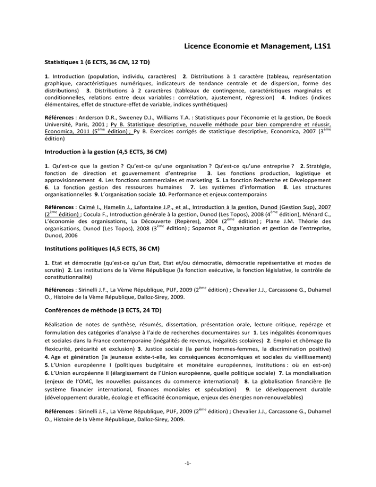 Licence Economie et Management, L1S1 Statistiques 1 (6 ECTS, 36 CM, 12 TD) 1. Introduction (population, individu, caractères) 2. Distributions à 1 caractère (tableau, représentation graphique, caractéristiques numériques, indicateurs de tendance centrale et de dispersion, forme des distributions) 3. Distributions à 2 caractères (tableaux de contingence, caractéristiques marginales et conditionnelles, relations entre deux variables : corrélation, ajustement, régression) 4. Indices (indices élémentaires, effet de structure‐effet de variable, indices synthétiques) Références : Anderson D.R., Sweeney D.J., Williams T.A. : Statistiques pour l’économie et la gestion, De Boeck Université, Paris, 2001 ; Py B. Statistique descriptive, nouvelle méthode pour bien comprendre et réussir, Economica, 2011 (5ème édition) ; Py B. Exercices corrigés de statistique descriptive, Economica, 2007 (3ème édition) Introduction à la gestion (4,5 ECTS, 36 CM) 1. Qu’est‐ce que la gestion ? Qu’est‐ce qu’une organisation ? Qu’est‐ce qu’une entreprise ? 2. Stratégie, fonction de direction et gouvernement d’entreprise 3. Les fonctions production, logistique et approvisionnement 4. Les fonctions commerciales et marketing 5. La fonction Recherche et Développement 6. La fonction gestion des ressources humaines 7. Les systèmes d’information 8. Les structures organisationnelles 9. L’organisation sociale 10. Performance et enjeux contemporains Références : Calmé I., Hamelin J., Lafontaine J.P., et al., Introduction à la gestion, Dunod (Gestion Sup), 2007 (2ème édition) ; Cocula F., Introduction générale à la gestion, Dunod (Les Topos), 2008 (4ème édition), Ménard C., L’économie des organisations, La Découverte (Repères), 2004 (2ème édition) ; Plane J.M. Théorie des organisations, Dunod (Les Topos), 2008 (3ème édition) ; Soparnot R., Organisation et gestion de l’entreprise, Dunod, 2006 Institutions politiques (4,5 ECTS, 36 CM) 1. Etat et démocratie (qu’est‐ce qu’un Etat, Etat et/ou démocratie, démocratie représentative et modes de scrutin) 2. Les institutions de la Vème République (la fonction exécutive, la fonction législative, le contrôle de constitutionnalité) Références : Sirinelli J.F., La Vème République, PUF, 2009 (2ème édition) ; Chevalier J.J., Carcassone G., Duhamel O., Histoire de la Vème République, Dalloz‐Sirey, 2009. Conférences de méthode (3 ECTS, 24 TD) Réalisation de notes de synthèse, résumés, dissertation, présentation orale, lecture critique, repérage et formulation des catégories d’analyse à l’aide de recherches documentaires sur 1. Les inégalités économiques et sociales dans la France contemporaine (inégalités de revenus, inégalités scolaires) 2. Emploi et chômage (la flexicurité, précarité et exclusion) 3. Justice sociale (la parité hommes‐femmes, la discrimination positive) 4. Age et génération (la jeunesse existe‐t‐elle, les conséquences économiques et sociales du vieillissement) 5. L’Union européenne I (politiques budgétaire et monétaire européennes, institutions : où en est‐on) 6. L’Union européenne II (élargissement de l’Union européenne, quelle politique sociale) 7. La mondialisation (enjeux de l’OMC, les nouvelles puissances du commerce international) 8. La globalisation financière (le système financier international, finances mondiales et spéculation) 9. Le développement durable (développement durable, écologie et efficacité économique, enjeux des énergies non‐renouvelables) Références : Sirinelli J.F., La Vème République, PUF, 2009 (2ème édition) ; Chevalier J.J., Carcassone G., Duhamel O., Histoire de la Vème République, Dalloz‐Sirey, 2009. ‐1‐ Problèmes économiques contemporains (3 ECTS, 24 CM) 1. Globalisation 2. Endettement et crises financières 3. Enjeux sociaux et environnementaux 4. Travail et protection sociale Références : Microéconomie 1 (4,5 ECTS, 24 CM 12 TD) 1. Introduction générale (principes de l’analyse économique, corrélation, causalité) 2. Théorie du consommateur (préférences, élasticités, fonctions d’utilité) 3. Théorie du producteur (production, coûts de production) 4. Equilibre partiel (hypothèses de concurrence pure et parfaite, offre agrégée, demande agrégée) Références : Wassmer E., Principes de microéconomie, Pearson, 2010 Mathématiques 1 (4,5 ECTS, 24 CM 12 TD) 1. Introduction (notions fondamentales, droite et plan) 2. Les fonctions d’une variable réelle (étude, développement de Taylor, extrema) 3. Les fonctions de plusieurs variables réelles (limites, continuité, dérivées partielle, différentiabilité, développement de Taylor à l’ordre 2) 4. Optimisation sans contrainte (conditions nécessaires, conditions suffisantes) 5. Optimisation avec contrainte égalitaire pour les fonctions de deux variables (convexité, lagrangien) Références : Martin‐Wolczyk P., Mathématiques pour économistes débutants, Vuibert (Dyna'sup), 2ème édition ; Michel P., Mathématiques pour l’économie, Economica ; Simon C.P., Blume L., Mathématiques pour Economistes débutants, De Boeck ; Ramis JP, Warusfel A, Buff X, Garnier J, et al., Mathématiques tout‐en‐un pour la Licence‐Niveau L1, Dunod, 2006 Parcours Réussite (0 ECTS, 30 TD) UE supplémentaire Parcours Honneur (0 ECTS, 24 CM) ‐2‐ Licence Economie et Management, L1S2 Macroéconomie 1 (6 ECTS, 36 CM, 12 TD) 1. Les grandes variables macroéconomiques 2. Le marché des biens et services 3. Le marché du travail 4. Le marché de la monnaie 5. Equilibre macroéconomique en économie fermée Références : Blanchard O., Cohen D. Macroéconomie, Pearson, 2010 (5ème édition); Mankiw G.N. Macroéconomie, De Boeck, 2003 (3ème édition) Analyse comptable (4,5 ECTS, 24 CM, 12 TD) 1. Généralités (définition et historique de la comptabilité, les obligations des commerçants, l’entreprise et l’