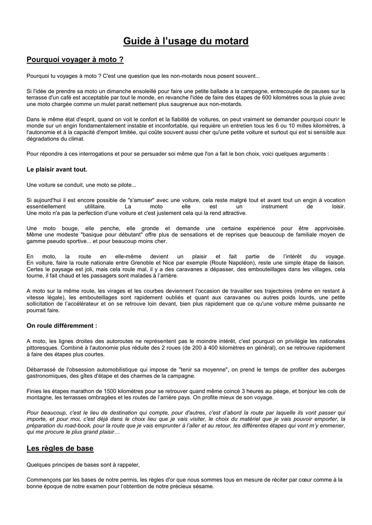 Guide à l’usage du motard Pourquoi voyager à moto ? Pourquoi tu voyages à moto ? C'est une question que les non-motards nous posent souvent... Si l'idée de prendre sa moto un dimanche ensoleillé pour faire une petite ballade a la campagne, entrecoupée de pauses sur la terrasse d'un café est acceptable par tout le monde, en revanche l'idée de faire des étapes de 600 kilomètres sous la pluie avec une moto chargée comme un mulet parait nettement plus saugrenue aux non-motards. Dans le même état d'esprit, quand on voit le confort et la fiabilité de voitures, on peut vraiment se demander pourquoi courir le monde sur un engin fondamentalement instable et inconfortable, qui requière un entretien tous les 6 ou 10 milles kilomètres, à l'autonomie et à la capacité d'emport limitée, qui coûte souvent aussi cher qu'une petite voiture et surtout qui est si sensible aux dégradations du climat. Pour répondre à ces interrogations et pour se persuader soi même que l'on a fait le bon choix, voici quelques arguments : Le plaisir avant tout. Une voiture se conduit, une moto se pilote... Si aujourd'hui il est encore possible de "s'amuser" avec une voiture, cela reste malgré tout et avant tout un engin à vocation essentiellement utilitaire. La moto elle est un instrument de loisir. Une moto n'a pas la perfection d'une voiture et c'est justement cela qui la rend attractive. Une moto bouge, elle penche, elle gronde et demande une certaine expérience pour être apprivoisée. Même une modeste "basique pour débutant" offre plus de sensations et de reprises que beaucoup de familiale moyen de gamme pseudo sportive... et pour beaucoup moins cher. En moto, la route en elle-même devient un plaisir et fait partie de l’intérêt du voyage. En voiture, faire la route nationale entre Grenoble et Nice par exemple (Route Napoléon), reste une simple étape de liaison. Certes le paysage est joli, mais cela roule mal, il y a des caravanes a dépasser, des embouteillages dans les villages, cela tourne, il fait chaud et les passagers sont malades à l’arrière. A moto sur la même route, les virages et les courbes deviennent l'occasion de travailler ses trajectoires (même en restant à vitesse légale), les embouteillages sont rapidement oubliés et quant aux caravanes ou autres poids lourds, une petite sollicitation de l’accélérateur et on se retrouve loin devant, bien plus rapidement que ce qu'une voiture même puissante ne pourrait faire. On roule différemment : A moto, les lignes droites des autoroutes ne représentent pas le moindre intérêt, c'est pourquoi on privilégie les nationales pittoresques. Combiné à l'autonomie plus réduite des 2 roues (de 200 à 400 kilomètres en général), on se retrouve rapidement à faire des étapes plus courtes. Débarrassé de l'obsession automobilistique qui impose de "tenir sa moyenne", on prend le temps de profiter des auberges gastronomiques, des gîtes d'étape et des charmes de la campagne. Finies les étapes marathon de 1500 kilomètres pour se retrouver quand même coincé 3 heures au péage, et bonjour les cols de montagne, les terrasses ombragées et les routes de l’arrière pays. On profite mieux de son voyage. Pour beaucoup, c'est le lieu de destination qui compte, pour d'autres, c'est d’abord la route par laquelle ils vont passer qui importe, et pour moi, c'est déjà dans le choix lieu que je vais visiter, le choix du matériel que je vais pouvoir emporter, la préparation du road-book, pour la route que je vais emprunter à l’aller et au retour, les différentes étapes qui vont m’y emmener, qui me procure le plus grand plaisir… Les règles de base Quelques principes de bases sont à rappeler, Commençons par les bases de notre permis, les règles d'or que nous sommes tous en mesure de réciter par cœur comme à la bonne époque de notre examen pour l’obtention de notre précieux sésame. A . La chaîne cinématique 1 Moteur. Mettre le contact, le voyant de pression d'huile et le voyant de point mort doivent s'allumer. Mettre le moteur en marche, contrôler l'extinction du témoin de pression d'huile et arrêter le moteur à l'aide du coupe circuit (arrêt d'urgence). 2 Commande d'embrayage et d'accélération. La poignée d'embrayage doit avoir une garde d'environ 5 mm, le câble ne doit pas être effiloché. La poignée d'accélération doit avoir une bonne rotation et un retour qui s'effectue normalement... 3 Fuites sous le moteur. Il ne doit y avoir aucune fuite du bloc moteur, ni du carter d'huile... Pas de trace d'huile ni de carburant. 4 Niveau d'huile moteur. la moto doit être droite ou sur la béquille centrale s'il y en a une. 5 Transmission. Vérifier la tension de la chaîne et constater le jeu vertical (flèche) de trois à quatre centimètres. B. La partie cycle 1 Direction. La moto étant béquillée, roue avant délestée, braquer la direction à gauche et à droite. Il ne doit pas y avoir de points durs. Vérifier visuellement le serrage des boulons des tés de fourche. 2 Suspensions. Contrôler la bonne étanchéité des joints de fourche avant ( joints à lèvre ou joint spi). L'amortisseur arrière doit être réglé en fonction de la charge. 3 Commande des freins. Contrôler les niveaux de liquide de frein avant et arrière dans les réservoirs. Il ne doit pas être en dessous du repère minimum. Si les freins ne sont pas hydrauliques, vérifiez le jeu aux câbles. 4 Pneumatique avant. La profondeur des sculptures de la bande de roulement ne doit pas être inférieure au témoin d'usure. Les flancs des pneus ne doivent laisser apparaître ni hernie ni déchirure. La pression des pneus doit être correcte et contrôlée à froid (ajouter 300g. si les pneus ont roulé plus de 10 km). 5 Pneumatique arrière. Idem pneumatique avant. C. L’ éclairage et les accessoires de sécurité 1 Éclairage avant. L'optique doit être propre et en bon état ( pas cassée, ni fendue) La parabole ne doit pas 