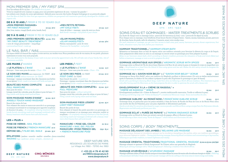Pour les enfants de 6 à 15 ans ~ For children 6 to 15 years Vivez la complicité avec maman ou papa, pour une première expérience de soin : «comme les grands» ! Les enfants sont choyés, les soins spécialement élaborés pour eux avec des huiles d’origine biologique et un protocole adapté. Just like Mum & Dad! For their first spa experience, children are pampered with treatments specifically developed for children with organic oils. De 6 à 10 ans / From 6 to 10 years old 20 mn 28 € (dos, bras, mains, visage) (back, arms, hands, face) «Mes petits petons» «My ickle feet» 20 mn 15 € «bain de billes» + massage + pose de verni au choix Bath bomb+ massage + nail polish of your choice SOINS D’EAU ET GOMMAGES - WATER TREATMENTS & SCRUBS De 11 à 15 ans / From 11 to 15 years old «Mes premiers gestes beauté» 45 mn 78 € “My first beauty treatment” 1 soin de visage personnalisé + maquillage 1 personalised facial + make-up «Glam mains/pieds» «Glam hands/feet» (La durée de chaque sois ou massage inclus : protocole de bienvenue (5 min) + soin + protocole de départ (5 min). Pour chaque soin ou massage, vous bénéficiez d’une heure d’accès à l’espace bains : bassin, saunas, hammam, jacuzzi, parcours de douches, bains de pieds, salle de relaxation / tisanerie, avant votre rendez-vous. For each treatment or massage, you get one hour access to bath area: pool, sauna, hammam, jacuzzi, shower experiences, foot baths, relaxation room / tea room, before your treatment. 40 mn 48 € Plateau mains/pieds + pose de verni Treatment for hands/feet + nail polish Hammam Traditionnel / Hammam Steam Bath Le Nail BAR / Nail Relaxation au hammam dans un bain de vapeur, selon une tradition orientale, pour favoriser la détente du corps et de l’esprit. (Soin préparatoire idéal avant un soin ou un massage ou encore avant un gommage pour bien préparer la peau). Relax in our hammam steam bath, which according to Eastern tradition promotes the relaxation of body and mind. (Ideal just before a treatment, massage or even a scrub to prepare the skin) Un espace dédié à la beauté des ongles, à votre service, sur rendez-vous. Nous prendrons soin de vos mains, de vos pieds…plusieurs traitements et soins vous sont proposés. This area dedicated to the beauty of your nails is at your service by appointment only. We will take care of your hands, feet... lots of treatments available. Les mains / Hands Les pieds / Feet 15 mn 15 € Nettoyer – limer sans pose de vernis ~ Clean – File « Le plateau » / Base 15 mn 15 € Nettoyer – limer sans pose de vernis ~ Clean – File Le soin des mains sans manucure : Dr TEMT 20 € Le soin des pieds : Dr TEMT Hand care without manicure : Dr TEMT 20 € Foot care : Dr TEMT Gommage + masque nourrissant dans des chaussons aux herbes et aux épices/ Scrub + mask in turnovers with herbs and spices Beauté des mains complète Full manicure 25 mn 35 € Sans pose de vernis ~ Without nail polish Limage, travail des cuticules, pose de crème et pose de base / Filing, cuticle work, laying cream and nail base . Soin-Massage Mains d’Ange® 55 mn 95 € Angels Touch Hand Massage® Beauté des mains de luxe Soin relaxant des mains et manucure associés à un gommage, un masque nourrissant et un massage pour apporter souplesse et douceur à la peau. ~ A completely relaxing treatment of the hands (scrub, nourishing mask and massage) combined with a beauty treatment which leaves them soft and smooth. Les « Plus » 20 mn 20 € Sans beauté des pieds ~ no pedicure Gommage + masque nourrissant dans des chaussons aux herbes et aux épices / Scrub + mask in turnovers with herbs and spices 25 mn 52 € Gommage au Savon Noir Beldi®, selon une tradition du Maghreb, purifiant et désincrustant. (Ce soin se réalise exclusivement après le hammam, la chaleur du lieu aidant à préparer la peau afin d’optimiser le gommage au gant de kassa). Scrub with a purifying & cleansing Black Soap, made from olive oil, following a North African tradition. This treatment is given only after having used the Hammam, as the heat prepares the skin in order to optimise the scrub with a kassa mitt. «Beauté des pieds complète» 25 mn 35 € Full pedicure Enveloppement à la « Crème de Rassoul® » “Crème de Rassoul®” Wrap Gommage au « Savon Noir Beldi® » / “Savon Noir Beldi®“ Scrub 25 mn Enveloppement purifiant à la « Crème de Rassoul® », recette traditionnelle marocaine. Tonifie et raffermit la peau. Purifying and firming wrap with “Crème de Rassoul®”, a traditional Moroccan recipe. Tones and soothes the skin. Sans pose de vernis ~ without nail polish Limage, travail des cuticules, pose de crème, et pose de base / Filing, cuticle work, laying cream and nail base . 52 € 25 mn 52 € Gommage doux, en particulier pour les peaux sensibles, à base de Sucre, de Poudre de Noix de Coco et de Monoï Noni selon une recette des îles de Polynésie, pour une peau régénérée et délicatement parfumée. Gentle scrub ideal for sensitive skins based on sugar, coconut powder and Monoï Noni, using a recipe from the Polynesian Islands. Regenerates and delicately perfumes your skin. Gommage Sublime® au Monoï NonI / Monoï Noni Sublime Scrub Soin-Massage Pieds Légers Light Feet Massage® ® 55 mn 95 € Beauté des pieds de luxe Soin relaxant et beauté des pieds associés à un gommage, un masque nourrissant et un massage pour retrouver confort et souplesse. ~ A completely relaxing treatment of the feet (scrub, nourishing mask and massage) combined with a beauty treatment which leaves them soft and smooth. Pose de vernis ~ Nail polish 8€ Manucure + Pose gel color manicure + nail gel polish Pose de frencH / French manicure 20 € Manucure +pose French gel Dépose gel / filed gel nails 30 min 35 € + french manicure pose EPILATIONS : jambes – sourcils – maillot – aisselles …(nous consulter) WAXING: legs - eyebrows - jersey - armpits ... (contact us