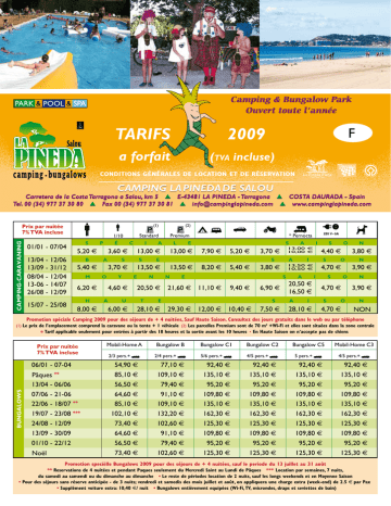 Camping & Bungalow Park Ouvert toute l’année tarifs 2009 a forfait F (tva incluse) Conditions Générales de Location et de Réservation CAMPING LA PINEDA DE SALOU Carretera de la Costa Tarragona a Salou, km 5 ▲ E-43481 LA PINEDA - Tarragona ▲ COSTA DAURADA - Spain Tel. 00 (34) 977 37 30 80 ▲ Fax 00 (34) 977 37 30 81 ▲ [email protected] ▲ www.campinglapineda.com camping-caravaning Prix par nuitée 7% TVA incluse 1/10 01/01 - 07/04 13/04 - 12/06 13/09 - 31/12 08/04 - 12/04 13-06 - 14/07 26/08 - 12/09 15/07 - 25/08 sp é 5,20 B 5,40 M Y 6,20 H 8,00 Premium S * Pernocta e E N N 20,50 t E 28,10 5,20 E 5,40 S S 21,60 11,10 9,40 S 7,50 I A S S O 4,70 N 3,90 O 4,70 S N 3,80 O 4,70 I 28,10 O 4,40 I 20,50 16,50 A S I 13,50 10,50 S 6,90 29,30 12,00 10,40 A 3,80 A 13,00 10,00 3,70 13,50 13,50 8,20 U 6,00 l 13,00 13,00 7,90 E 4,60 A Standard ia S 3,70 O (2) c 3,60 A (1) N 3,90 N NON Promotion spéciale Camping 2009 pour des séjours de + 4 nuitées, Sauf Haute Saison. Consultez des jours gratuits dans le web ou par téléphone (1) Le prix de l’emplacement comprend la caravane ou la tente + 1 véhicule (2) Les parcelles Premium sont de 70 m2 +Wi-Fi et elles sont situées dans la zone centrale * Tarif applicable seulement pour entrées à partir des 18 heures et la sortie avant les 10 heures • En Haute Saison on n’accepte pas de chiens Prix par nuitée 7% TVA incluse bungalows 06/01 - 07-04 Pâques ** 13/04 - 06/06 07/06 - 21-06 22/06 - 18/07 ** 19/07 - 23/08 *** 24/08 - 12/09 13/09 - 30/09 01/10 - 22/12 Noël Mobil-Home A 2/3 pers.+ 54,90 85,10 56,50 64,60 85,10 102,10 73,40 64,60 56,50 73,40 Bungalow B 2/4 pers.+ 77,10 109,10 79,40 91,10 109,10 132,20 102,60 91,10 79,40 102,60 Bungalow C1 Bungalow C2 5/6 pers.+ 4/5 pers.+ 92,40 135,10 95,20 109,80 135,10 162,30 125,30 109,80 95,20 125,30 92,40 135,10 95,20 109,80 135,10 162,30 125,30 109,80 95,20 125,30 Bungalow C5 5 pers.+ 92,40 135,10 95,20 109,80 135,10 162,30 125,30 109,80 95,20 125,30 Mobil-Home C3 4/5 pers.+ 92,40 135,10 95,20 109,80 135,10 162,30 125,30 109,80 95,20 125,30 Promotion specièlle Bungalows 2009 pour des séjours de + 4 nuitées, sauf le periode du 13 juillet au 31 août ** Reservations de 4 nuitées et pendant Paques seulement du Mercredi Saint au Lundi de Pâques *** Location par semaines, 7 nuits, du samedi au samendi ou du dimanche au dimanche • Le reste de périodes location de 2 nuits, sauf les longs weekends et en Moyenne Saison • Pour des séjours sans réserve anticipée - de 3 nuits; vendredi et samedis des mois juillet et août, on appliquera une charge extra (week-end) de 2.5 e par Pax • Supplément voiture extra: 10,40 €/ nuit • Bungalows entièrement equipées (Wi-Fi, TV, microndes, draps et seviettes de bain) PROMOTION 2009 CAMPING ET CARAVANING Periodes: du 01/01 au 18/07 et du 26/08 au 31/12 Location: 5 nuitées 8 nuitées 14 nuitées Payez: 4 nuitées 6 nuitées 10 nuitées PROMOTION BUNGALOWS 2009 Periodes: du 01/01 au 12/07 et du 01/09 au 31/12 Location: 5 nuitées 8 nuitées 14 nuitées Payez: 4 nuitées 6 nuitées 10 nuitées B u n g Les promotions sont toujours selon disponibilitée et ne sont pas acumulables. Mobil-Home A, 2/3 Pax. - 16 m2 Bungalow B1, 2/4 Pax. - 24 m2 Bungalow B2, 2/4 Pax. - 24 m2 Bungalow C1. 5/6 Pax. - 30 m2 Le type A est un Mobil Home O’Hara, doublement isolé, très confortable et fonctionnel, d’une capacité de 2/3 personnes. Il se compose d’un salon/salle à manger avec un canapé-lit une place ; d’une chambre double ; d’une salle de bains avec WC, lavabo et douche (eau chaude) ; d’une cuisine aménagée et équipée d’ustensiles, d’un évier, d’un plan de travail et d’un réfrigérateur ; d’une terrasse extérieure ; d’un solarium et d’une place de stationnement pour une voiture. Il dispose d’une TV, d’un micro-ondes et de meubles de jardin avec parasol. La location de ce Mobil home comprend la mise à disposition de draps et de serviettes de bains, changés chaque semaine. Le type B1 est un bungalow Gitotel très lumineux, agréable et confortable, d’une capacité de 2/4 personnes. Il se compose d’un salon/salle à manger avec un canapé-lit deux places ; d’une chambre double ; d’une salle de bains avec WC, lavabo et douche (eau chaude) ; d’une cuisine aménagée et équipée d’ustensiles, d’un évier, d’un plan de travail et d’un réfrigérateur ; d’un porche avec terrasse couverte ; et un espace extérieur pour le stationnement d’une voiture. Il dispose d’une TV, d’un micro-ondes et de meubles de jardin. La location de ce bungalow comprend la mise à disposition de draps et de serviettes de bains, changés chaque semaine. Le bungalow B2 est en bois et s’encadre entièrement dans la nature. Très accueillant et confortable, sa capacité d’accueil est de 2/4 personnes. Il se compose d’un salon/salle à manger avec un canapé-lit deux places ; d’une chambre double ; d’une salle de bains avec WC, lavabo et douche (eau chaude) ; d’une cuisine aménagée et équipée d’ustensiles, d’un évier, d’un plan de travail et d’un réfrigérateur ; d’un porche avec terrasse extérieure et d’une place de stationnement pour une voiture. Il dispose d’une TV, d’un micro-ondes et de meubles de jardin. La location de ce bungalow comprend la mise à disposition de draps et de serviettes de bains, changés chaque semaine. Le type C1 est un bungalow Campitel, en bois, très agréable et confortable. Il se compose de 2 chambres, d’une salle de bains, d’un salon/salle à manger, d’une terrasse couverte et d’un espace extérieur pour le stationnement d’une voiture. La salle de bains est dotée d’un WC, d’un lavabo et d’une douche avec eau chaude. La cuisine est équipée de vaisselle et d’ustensiles de cuisine, d’un plan de travail, d’un évier et d’un réfrigérateur. L’une des chambres est meublée d’un lit double et l’autre, d’un lit double et de deux lits ind