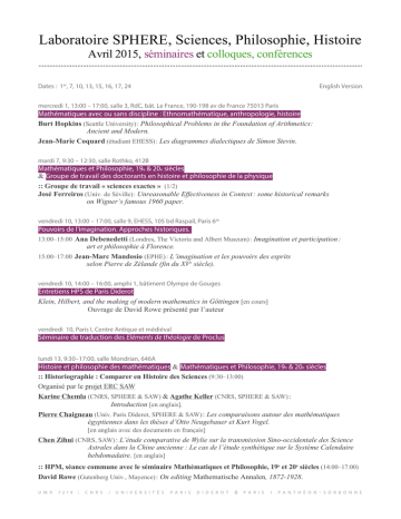 Laboratoire SPHERE, Sciences, Philosophie, Histoire Avril 2015, séminaires et colloques, conférences ............................................................................................................................................................................... Dates : 1er, 7, 10, 13, 15, 16, 17, 24 English Version mercredi 1, 13:00 – 17:00, salle 3, RdC, bât. Le France, 190-198 av de France 75013 Paris Mathématiques avec ou sans discipline : Ethnomathématique, anthropologie, histoire Burt Hopkins (Seattle University) : Philosophical Problems in the Foundation of Arithmetics: Ancient and Modern. Jean-Marie Coquard (étudiant EHESS) : Les diagrammes dialectiques de Simon Stevin. mardi 7, 9:30 – 12:30, salle Rothko, 412B Mathématiques et Philosophie, 19e & 20e siècles & Groupe de travail des doctorants en histoire et philosophie de la physique :: Groupe de travail « sciences exactes » (1/2) José Ferreiros (Univ. de Séville) : Unreasonable Effectiveness in Context : some historical remarks on Wigner’s famous 1960 paper. vendredi 10, 13:00 – 17:00, salle 9, EHESS, 105 bd Raspail, Paris 6th Pouvoirs de l’imagination. Approches historiques. 13:00–15:00 Ana Debenedetti (Londres, The Victoria and Albert Museum) : Imagination et participation : art et philosophie à Florence. 15:00–17:00 Jean-Marc Mandosio (EPHE) : L’imagination et les pouvoirs des esprits selon Pierre de Zélande (fin du XVe siècle). vendredi 10, 14:00 – 16:00, amphi 1, bâtiment Olympe de Gouges Entretiens HPS de Paris Diderot Klein, Hilbert, and the making of modern mathematics in Göttingen [en cours] Ouvrage de David Rowe présenté par l’auteur vendredi 10, Paris I, Centre Antique et médiéval Séminaire de traduction des Eléments de théologie de Proclus lundi 13, 9:30–17:00, salle Mondrian, 646A Histoire et philosophie des mathématiques & Mathématiques et Philosophie, 19e & 20e siècles :: Historiographie : Comparer en Histoire des Sciences (9:30–13:00) Organisé par le projet ERC SAW Karine Chemla (CNRS, SPHERE & SAW) & Agathe Keller (CNRS, SPHERE & SAW) : Introduction [en anglais]. Pierre Chaigneau (Univ. Paris Diderot, SPHERE & SAW) : Les comparaisons autour des mathématiques égyptiennes dans les thèses d’Otto Neugebauer et Kurt Vogel. [en anglais avec des documents en français] Chen Zihui (CNRS, SAW) : L’étude comparative de Wylie sur la transmission Sino-occidentale des Science Astrales dans la Chine ancienne : Le cas de l’étude synthétique sur le Système Calendaire hebdomadaire. [en anglais] :: HPM, séance commune avec le séminaire Mathématiques et Philosophie, 19e et 20e siècles (14:00–17:00) David Rowe (Gutenberg Univ., Mayence) : On editing Mathematische Annalen, 1872-1928. u m r 7219 : c n r s / u n i v e r s i t é s p a r i s d i d e r o t & p a r i s 1 p a n t h é o n - s o r b o n n e mercredi 15, 13:00 – 17:00, salle 3, RdC, bât. Le France, 190-198 av de France 75013 Paris Mathématiques avec ou sans discipline : Ethnomathématique, anthropologie, histoire Sophie Desrosiers (EHESS) et Eric Vandendriessche (SPHERE) : Tissage, vannerie, jeux de ficelle : textiles et mathématiques. jeudi 16, 9:30–16:30, salle Kandinsky, 631B Sciences et philosophie de l’Antiquité à l’Age classique :: L’identification des auteurs des textes anonymes médiévaux : méthodes, enjeux et résultats de la critique d’attribution Journée organisée par Silvia Di Donato (CNRS, SPHERE). 9:30 Silvia Di Donato : Présentation de la journée et des thèmes abordés. 9:45–10:45 Jean-Pierre Rothschild (IRHT, CNRS) : Du danger de quelques paralogismes en critique d’attribution. Réflexions sur une pratique (hébreu et latin). 11:00 Mauro Zonta (Université de Rome, La Sapienza) : How to ascribe anonymous Medieval Aristotelian commentaries in various languages : three different cases. 12:00–13:00 Judith Kogel (IRHT, CNRS) : Datation, localisation, sources et influences d’un abrégé anonyme du Sefer ha-Shorashim. 14:30 Dominique Poirel (IRHT, CNRS) : Les preuves, les indices et leur interprétation. Critique d’attribution et littérature latine du Moyen Âge. 15:30–16:30 Jean-Marc Mandosio (EPHE, Sorbonne) : Le labyrinthe d’Hermès. Difficultés et apories de la critique d’attribution des textes alchimiques médiévaux, entre anonymes, pseudépigraphes et textes indatables. jeudi 16, 9:30 – 16:00, salle Malevitch, 483 A Histoire des sciences, histoire du texte :: Collections used in The History of Sciences – Scholarly value, market value, patrimonial value Rencontre organisée par Magali Dessagnes (SPHERE, CNRS & University Paris Diderot, SAW Project) et Christine Proust (SPHERE, CNRS & University Paris Diderot, SAW Project), en dialogue avec le groupe SAW. Wendy Shaw (Freie Universität Berlin) : Intersecting Narratives, Interpolating Collections: the Museum of Islamic Art, Berlin. Magali Dessagnes : Elias Géjou, seller of antiquities from Mesopotamia, heart of a network of collectors and scholars. Table ronde animée par Florence Bretelle-Establet (CNRS, SPHERE & SAW Project), avec la participation de Jens Høyrup (Roskilde University) et d’Agathe Keller (CNRS, SPHERE & SAW Project). vendredi 17, 9:30 – 12:30, salle Kandinsky, 631B Mathématiques « arabes » et Mathématiques à la Renaissance Sabine Rommevaux-Tani (CNRS, SPHERE) : La résolution des équations du troisième degré par Simon Stevin dans l’Arithmetique (1585) : des avancées significatives par rapport à l’exposé de Gerolamo Cardamo dans l’Ars magna (1545). vendredi 17, 14:00–16:00, salle Malevitch, 483A Striving for coherence: Readings in Averroes’ Incoherence of the Incoherence Cristina Cerami (CNRS, SPHERE) : Generation and Creation in the Tahâfut. vendredi 17, 16:00 – 18:00 , salle Malevitch, 483A La cosmologie d’Averroès : le Commentaire moyen au De caelo d’Aristote Cristina Cerami (CNRS, SPHERE) : Révision de la traduction de CMDC I,