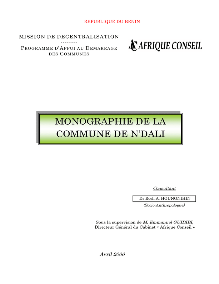 REPUBLIQUE DU BENIN MISSION DE DECENTRALISATION -------P ROGR AMME D ’A PPUI A U D E MAR RAGE DES C O MMUNE S MONOGRAPHIE DE LA COMMUNE DE N’DALI Consultant Dr Roch A. HOUNGNIHIN (Socio-Anthropologue) Sous la supervision de M. Emmanuel GUIDIBI, Directeur Général du Cabinet « Afrique Conseil » Avril 2006 MONOGRAPHIE DE LA COMMUNE DE N’DALI Monographie de N'dali Afrique Conseil, Avril 2006 2 REMERCIEMENTS Nous adressons nos sincères remerciements à la Mission de Décentralisation et au Programme d’Appui au Démarrage des Communes (PRODECOM) pour la confiance placée en nous dans le cadre de la réalisation de l'étude monographique de la Commune de N’Dali. Nos remerciements vont aussi à Monsieur le Maire de la commune, au Conseil communal, aux responsables des services techniques, aussi bien au niveau central qu’aux niveaux déconcentré et décentralisé pour leur disponibilité et leur contribution. Monographie de N'dali Afrique Conseil, Avril 2006 3 N SINENDE BEMBEREKE KALALE NIKKI N'DALI PERERE PARAKOU TCHAOUROU 0 40 80 Kilometers LA COMMUNE DE N’DALI DANS LE DEPARTEMENT DU BORGOU Monographie de N'dali Afrique Conseil, Avril 2006 4 SOMMAIRE SIGLES ET ABREVIATIONS…………………………………………….……. 6 INTRODUCTION ………………………………………………………….…...… 7 CHAPITRE I : SITUATION PHYSIQUE ET ADMINISTRATIVE …….… 8 1.1. CADRE PHYSIQUE ET ADMINISTRATIF ……………………………. 8 1.2. SITUATION DEMOGRAPHIQUE …………………………………….… 11 CHAPITRE II : ORGANISATION SOCIALE …………………………….… 13 2.1. LE POUVOIR TRADITIONNEL…………………………………………. 13 2.2. LE POUVOIR MODERNE ……………………………………………….… 14 2.3. LA FEMME DANS LA SOCIETE BAATONU DE N’DALI …………… 15 CHAPITRE III : ACTIVITES ECONOMIQUES …………………………. 16 3.1. L’AGRICULTURE …………………………………………………………. 17 3.2. ELEVAGE ET PECHE ……………………………………………………. 20 3.3. LE COMMERCE ……………………………………………………………. 22 3.4. L’ARTISANAT ………………………………………………………………... 24 3.5. LA TRANSFORMATION……………………………………………………. 25 3.6. LE TOURISME ………………………………………………………………. 25 3.7. INFRASTRUCTURES ROUTIERES ET DE TRANSPORT…………… 26 CHAPITRE IV : SECTEURS SOCIAUX ……………………………………… 27 4.1. LA SANTE ……………………………………………………………………. 27 4.2. L’EDUCATION……………………………………………………………….. 28 4.3. L’HABITAT ET LES CONDITIONS D’HABITATION…………………. 29 4.4. LES AUTRES SERVICES SOCIAUX ……………………………………. 30 CHAPITRE V : PRINCIPALES FILIERES PORTEUSES ……………….… 32 CHAPITRE VI. CONTRAINTES ET ATOUTS………………………………. 33 6.1. CONTRAINTES ET FAIBLESSES ………………………………………. 33 6.2. OPPORTUNITES ET FORCES …………………………………………… 33 CHAPITRE VII : PERSPECTIVES ET RECOMMANDATIONS ………… 37 CONCLUSION ………………………………………………………………….… 38 BIBLIOGRAPHIE ………………………………………………………….......... 39 Monographie de N'dali Afrique Conseil, Avril 2006 5 SIGLES ET ABREVIATIONS ADECOI Projet d’Appui au Développement Communal et aux Initiatives Locales AIMF Association Internationale des Maires Francophones ANCB Association Nationale des Communes du Bénin APE Association des Parents d’Elèves ASF Association des Services Financiers CA Chef d’Arrondissement CARDER Centre d’Action Régional pour le Développement Rural CCS Centre Communal de Santé CEG Collège d’Enseignement Général CeRPA Centre Régional de Promotion Agricole CLAC Centre de Lecture et d’Animation Culturelle CLCAM Caisse Locale de Crédit Agricole Mutuel CPS Centre de Promotion Sociale CS Circonscription Scolaire CSA Centre de Santé d’Arrondissement CSC Centre de Santé de Commune FED Fonds Européen de Développement GV Groupement Villageois HZ Hôpital de Zone MEHU Ministère de l’Environnement, de l’Habitat et de l’Urbanisme MISD Ministère de l’Intérieur, de la Sécurité et de la Décentralisation MSP Ministère de la Santé Publique MTPT Ministère des Travaux Publics et des Transports ONASA Office National de Sécurité Alimentaire ONG Organisation Non Gouvernementale OP Organisation Paysanne PDC Plan de Développement Communal PDRT Projet de Développement des plantes à Racines et Tubercules PME Petite et Moyenne Entreprise PNUD Programme des Nations Unies pour le Développement PRODECOM Programme d’Appui au Démarrage des Communes PTT Postes, Téléphone et Télécommunications RGPH Recensement Général de la Population et de l’Habitat SBEE Société Béninoise d’Energie Electrique SER Service d’Entretien Routier SERHAU Société d’Etudes Régionales, d’Habitat et d’Aménagement Urbain SNV Organisation Néerlandaise de Développement SONEB Société Nationale des Eaux du Bénin UCPC Union Communale des Producteurs de Coton USAID United States of America Agency for International Development USPP Union Sous-Préfectorale des Producteurs Monographie de N'dali Afrique Conseil, Avril 2006 6 INTRODUCTION Dans le cadre du renforcement des acquis de la Conférence des Forces Vives de la Nation de février 1990 et notamment de la consolidation de la décentralisation au Bénin, le Gouvernement avec l’appui de la Commission Européenne, a entrepris de mettre en œuvre le Programme d’Appui au Démarrage des Communes (PRODECOM) pour une durée de trois ans, afin d’appuyer le processus d