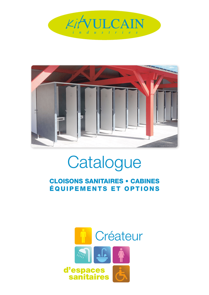 Catalogue CLOISONS SANITAIRES • CABINES ÉQUIPEMENTS ET OPTIONS Créateur d’espaces sanitaires SOMMAIRE 4 LES CLOISONS SANITAIRES 5 GAMME « CLASSIC » 8 GAMME « MATERNELLE » 11 CABINES « POLYCOMPACT » 20 LES EQUIPEMENTS ET OPTIONS 21 LES SEPARATIONS ET LES PORTES DE RENOVATION 22 LES PLANS SANITAIRES ET LES ÎLOTS 23 LES PICTOGRAMMES, TRAPPES POUBELLES, POUBELLES ET HABILLAGE BATI SUPPORT,KIT URINOIR ET KIT VIDOIR 24 LES CASIERS 26 LES BANCS ET DIVERS 27 LES COLORIS Toutes les photos et croquis présentés dans ce catalogue sont non contractuels et ont été fournis par les fabricants et restent leur propriété 2 Quelle que soit votre activité (camping, collectivités, piscine, industrie…) ou votre usage (WC, douche, vestiaire…), la société Kit Vulcain Industries vous propose plusieurs solutions pour la création ou la rénovation de vos sanitaires. En effet la société a développé 2 types de cabines que nous vous présentons dans ce catalogue ainsi que différents produits destinés à l’équipement de vos sanitaires : les cloisons sanitaires KVI : cabines sanitaires en panneaux stratifiés compact sur pied es cabines sanitaires « Polycompact » : receveur polyester avec cloisons en L panneaux stratifiés compact, livrées montées avec porte, robinetterie, plomberie et accessoires es équipements et options : les plans sanitaires (vasques, éviers, linges…) L les séparations, les casiers, les habillages bâti support, les gravures... Nos produits ont été conçus afin de vous apporter plusieurs avantages : Rapidité de mise en œuvre Facilité d’entretien Esthétique Solidité Les produits KVI sont spécialement étudiés pour une utilisation intensive, réalisés en panneaux stratifiés compact et polyester, ils sont résistants aux chocs et à l’humidité. Avec leur quincaillerie en inox, aluminium et en nylon nos produits s’adaptent à tous les secteurs : CAMPINGS, PISCINES, ECOLES, SALLES DE SPORT, BUREAUX... Notre service commercial est à votre disposition pour vous conseiller sur la solution la plus adaptée à votre projet www.kitvulcain.com 3 CLOISONS SANITAIRES CLOISONS SANITAIRES 4 www.kitvulcain.com GAMME CLASSIC GAMME CLASSIC Porte Refend Les cloisons sanitaires « gamme classic » sont des cabines sanitaires réalisées en panneaux stratifiés compact antibactérien (fabriqué en France) sur pied et sont livrées en kit. Elles vous permettent de créer vos cabines douches, WC, lavabo, change, PMR… très rapidement avec un très bon rapport qualité/prix. Nous disposons de cotes standards mais nous réalisons aussi des cabines sur mesures. Nous proposons différents coloris, formes de porte afin de personnaliser vos sanitaires. Meneau LES DIMENSIONS STANDARDS Cote intérieur cabine 915 mm Suivant l’article R.111-19-24 du JORF N°0294 du 19 décembre 2007, les passages de portes de toutes les installations neuves ERP et IOP doivent être de 770mm pour les cabines standards et de 870 mm pour les cabines PMR. Passage de porte 800 mm 2150 mm 1950 mm De ce fait la largeur minimum d’une cabine avec porte ouvrant extérieur devra être de 915mm pour un passage de porte de 800mm, et pour une cabine avec porte ouvrant intérieur de 990mm pour un passage de porte de 800mm. Pour toute autre installation nous pouvons réaliser des portes plus petites afin de réduire la largeur des cabines. 150 mm (+/– 20 mm) www.kitvulcain.com 5 CLOISONS SANITAIRES DESCRIPTIF PRODUITS Panneau compact 10mm ou 12.5mm antibactérien label « Sanitized » de marque « Polyrey » classé au feu M2 avec assemblage par visserie traversante en inox. Bouton double nylon Verrou avec voyant libre/occupé ampon caoutchouc sur la porte pour limiter le bruit du claquement de la T porte sur le meneau ixation murale et fixation meneau/refend avec F cornières inox 3 Charnières nylon dégondables par porte dont 1 à ressort Pieds nylon Ht150mm avec réglage +- 20mm Tube supérieur en aluminium laqué pour assurer la rigidité 6 www.kitvulcain.com GAMME CLASSIC LES FORMES DE PORTES DISPONIBLES : COMPACT DECOR PERSONNALISE De base vous avez le choix entre 3 formes de portes : La gamme « SIGNATURE » de la marque POLYREY permet de personnaliser son panneau compact HPL avec logos, photos, ou images de votre choix. Standard vague Dune LES FONDS DE CABINES Nous proposons aussi des fonds de cabines en panneaux stratifiés compact ép.10mm afin de pouvoir créer une gaine technique derrière les cabines. Ce principe permet d’avoir un accès à toute la partie technique et donc de pouvoir intervenir très facilement en cas de problème ou pour la maintenance. LES COULEURS DISPONIBLES Vous pouvez choisir une couleur pour les portes et une couleur pour les refends et meneaux. Retrouvez les coloris à la fin de notre catalogue Fond de cabine Gaine technique www.kitvulcain.com 7 CLOISONS SANITAIRES GAMME MATERNELLE La gamme maternelle permet de réaliser des espaces sanitaires personnalisés garantissant aux enfants une intimité et qui, grâce à leur faible hauteur, permettent aux adultes de pouvoir facilement les surveiller. Nous proposons différents coloris, forme de porte, et gravage afin de personnaliser les sanitaires. LES DIMENSIONS STANDARDS Passage de porte 770 mm 850 mm Cote minimum 250 mm 150 mm (+/– 20 mm) 8 www.kitvulcain.com GAMME MATERNELLE DESCRIPTIF PRODUITS Panneau compact 10mm ou 12.5mm antibactérien label « Sanitized » de marque « Polyrey » classé au feu M2 avec visserie traversante en inox. ystème anti pince doigt avec décalage de la porte laissant 1 cm de jour S entre la porte et le meneau et tampon caoutchouc. Trou Ø 50 mm servant de poignée pour ouvrir la porte Bord des panneaux arrondis ixation murale et fixations meneaux/refends avec F cornières inox 2 Charnières nylon dégondables par porte pieds nylon pour meneaux intermédiaires et 2 1 pied pour les meneaux de départ et de terminaison pour une bonne stabilité www.kitvulcain.com 9 CLOISONS 