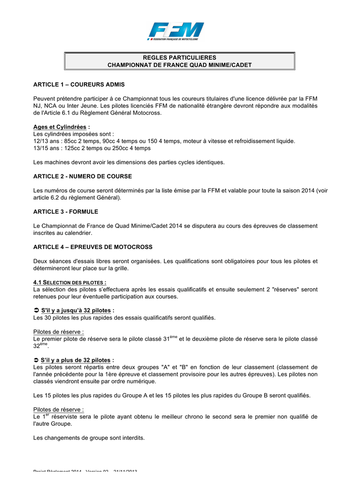 REGLES PARTICULIERES CHAMPIONNAT DE FRANCE QUAD MINIME/CADET ARTICLE 1 – COUREURS ADMIS Peuvent prétendre participer à ce Championnat tous les coureurs titulaires d'une licence délivrée par la FFM NJ, NCA ou Inter Jeune. Les pilotes licenciés FFM de nationalité étrangère devront répondre aux modalités de l'Article 6.1 du Règlement Général Motocross. Ages et Cylindrées : Les cylindrées imposées sont : 12/13 ans : 85cc 2 temps, 90cc 4 temps ou 150 4 temps, moteur à vitesse et refroidissement liquide. 13/15 ans : 125cc 2 temps ou 250cc 4 temps Les machines devront avoir les dimensions des parties cycles identiques. ARTICLE 2 - NUMERO DE COURSE Les numéros de course seront déterminés par la liste émise par la FFM et valable pour toute la saison 2014 (voir article 6.2 du règlement Général). ARTICLE 3 - FORMULE Le Championnat de France de Quad Minime/Cadet 2014 se disputera au cours des épreuves de classement inscrites au calendrier. ARTICLE 4 – EPREUVES DE MOTOCROSS Deux séances d'essais libres seront organisées. Les qualifications sont obligatoires pour tous les pilotes et détermineront leur place sur la grille. 4.1 SELECTION DES PILOTES : La sélection des pilotes s’effectuera après les essais qualificatifs et ensuite seulement 2 "réserves" seront retenues pour leur éventuelle participation aux courses. Ü S'il y a jusqu’à 32 pilotes : Les 30 pilotes les plus rapides des essais qualificatifs seront qualifiés. Pilotes de réserve : ème Le premier pilote de réserve sera le pilote classé 31 et le deuxième pilote de réserve sera le pilote classé ème 32 . Ü S’il y a plus de 32 pilotes : Les pilotes seront répartis entre deux groupes "A" et "B" en fonction de leur classement (classement de l'année précédente pour la 1ère épreuve et classement provisoire pour les autres épreuves). Les pilotes non classés viendront ensuite par ordre numérique. Les 15 pilotes les plus rapides du Groupe A et les 15 pilotes les plus rapides du Groupe B seront qualifiés. Pilotes de réserve : er Le 1 réserviste sera le pilote ayant obtenu le meilleur chrono le second sera le premier non qualifié de l'autre Groupe. Les changements de groupe sont interdits. Projet Règlement 2014 - Version 02 – 21/11/2013 2 Si le nombre de pilotes à diviser est un nombre impair, le Groupe A comprendra un pilote de plus que le Groupe B. Participation des pilotes de réserve : La décision de faire participer les réservistes aux manches sera prise 5mn avant chaque départ dans le cas où il manquerait un ou deux pilotes dans le parc d'attente. ère Un pilote de réserve qui n'était pas autorisé à prendre le départ de la 1 manche pourra, si nécessaire, prendre le départ des autres manches. Les deux pilotes de réserve devront rester sur l'épreuve jusqu'à la fin de celle-ci. ARTICLE 4BIS – EPREUVES D’ENDURANCE TT Essais libres : 10 mn Essais chronométrés : 10 mn ARTICLE 5 – EPREUVES - Départ : Epreuves de Motocross : Les départs seront obligatoirement donnés sur 2 lignes de 15 machines. Epreuves d’Endurance TT : Les départs « type le Mans » seront donnés. - Durée : Epreuves de Motocross : Chaque épreuve se disputera en 3 manches de 10 mn + 2 tours séparées par un intervalle de 45mn maximum. Epreuves d’Endurance TT : Chaque épreuve se disputera en 2 manches de 20 mn. ARTICLE 6 - MOTOCYCLES Seront admises les machines répondant aux normes suivantes : DEFINITION : Un quad est un véhicule à quatre roues et dont les roues arrière assurant la propulsion sont montées sur le même axe rigide horizontal - - Le moteur ne peut en aucun cas être situé derrière le pilote. Tout système différentiel de transmission est interdit. Le choix du cadre, du moteur, de l’emplacement du réservoir de carburant est libre. Les pneus cloutés, chaînés sont interdits. Les jantes, que ce soit pour l’avant ou l’arrière, ne peuvent excéder 12 pouces de diamètre. Les roues à bâtons et à rayons ainsi que les jantes en carbone sont interdites. La largeur hors tout ne doit pas excéder 1300 mm, quelque soit la compression de l'amortisseur, mesure prise en charge (pilote sur la machine). Le silencieux d’échappement ne doit pas dépasser l’aplomb arrière du quad ou une ligne verticale tangente. La plaque arrière sera en plastique souple. Le pilote doit être obligatoirement isolé des roues arrière par deux ailes, solidaires ou non l’une de l’autre, réalisées en matière plastique ou en polyester. La transmission assurée par une chaîne devra être équipée d’un sabot en matière dur (type téflon et non alu) à sa partie inférieure protégeant la couronne et le disque. Un pare choc ou pare buffle devra être mis en place. Dans le cas d’un pare choc, les deux embouts devront être arrondis, diamètre minimum : 15 mm Un tube de protection (ou nerf bar) sans partie saillante de section ronde doit être prévu de chaque côté de l’engin. Il devra obligatoirement être fixé en deux points : un au niveau du support d’articulation du bras de suspension inférieur, l’autre sur le support de repose-pied et comporter des sangles ou treillages métalliques fixés sur la tubulure du nerf bar et du châssis. Afin d’empêcher le pied du pilote de toucher le sol accidentellement. Un coupe-circuit interrompant l’alimentation électrique doit être relié au pilote. La direction doit être assurée par les roues avant. Le guidon doit être équipé d’une protection rembourrée sur la barre transversale. Les guidons sans barre transversale doivent être équipés d’une protection rembourrée située au milieu du guidon, recouvrant largement les brides du guidon. Projet Règlement 2014 - Version 02 – 21/11/2013 3 - Les extrémités exposées du guidon doivent être bouchées avec un matériau solide, ou recouvertes de caoutchouc. - Les gardes boue doivent être en matériaux souples. - Les plaques des machines devront être de dimension