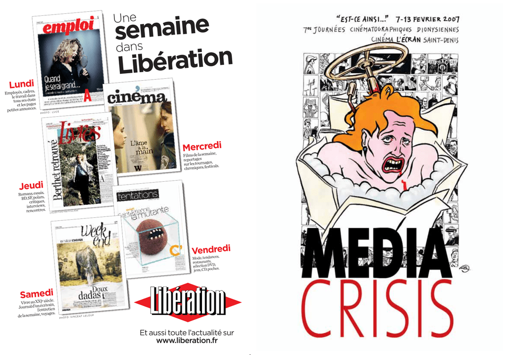 sdaensmaine n o i t a r é b i L Une Lundi es, Employés, cadr ns le travail da tous ses états et les pages es. petites annonc CE P H OT O : L U di Merlacserme aine, Films de reportages s, sur les tournagetivals. chroniques, fes Jeudsais,i Romans, es BD, SF, polars, critiques, interviews, rencontres. COLLECTIO LI N PA R T I C U ERE di Vendadncre es, Mode, ten restaurants, sélection DVD, jeux, CD, poches. di SamXXe I siècle. e Vivre au rivain, Journal d’un éctretien l’en yages. de la semaine, vo NCENT P H OT O : V I L E LO U P Et aussi toute l’actualité sur www.liberation.fr Les médias sont en crise. Paradoxe apparent puisqu’ils n’ont jamais été aussi présents dans notre environnement. Après avoir longtemps cru qu’une chose est vraie « parce qu’elle est écrite dans le journal ou vue à la télévision », la conviction citoyenne s’est inversée. La représentation n’est plus objet de croyance, la communication semble remplacer l’information et devenir un système de simple consommation marchande. Les entreprises de presse ou de médias, concentrées au sein de groupes industriels surpuissants, semblent de plus en plus dépendantes de leurs actionnaires et des publicitaires. La mise en scène de l’actualité dans ces médias est elle aussi en crise, formatée et liée à une conception du monde et de l’information que l’on se garde généralement d’interroger. Voir, est-ce savoir ? Peut-on se fier aux informations ? Que nous apprennent-elles ? « La souffrance n’est pas une star, ni l’église incendiée, ni le paysage dévasté » dit Jean-Luc Godard. Comment rompre avec cette dictature du sensationnel ? Pourquoi est-il devenu si difficile, à l’ère du temps réel et de l’info continue, de penser le journalisme en dehors d’un sentiment d’urgence ? C’est à ce travail d’élucidation que vous invitent nos septièmes journées cinématographiques dionysiennes placées sous le signe du cinéaste politique anglais, Peter Watkins, et son regard critique sur les mass media audiovisuels. Peter Watkins a placé au cœur de son œuvre une réflexion sur le langage des images et sur l’état de délabrement de notre paysage médiatique mondial. « Aujourd’hui, après 70 ans d’impact social par le cinéma hollywoodien, nous n’avons toujours pas la tradition d’une discussion critique, sur la façon dont l’audiovisuel nous affecte. Nous allons au cinéma, nous allumons la télévision, nous regardons, nous rions, nous sursautons. Nous savons que quelque chose se passe en nous et avec nous, et nous l’acceptons. » Durant une semaine, pour résister à cette spectacularisation permanente du réel, partagez avec nous le cinéma dynamité de Guy Debord, découvrez les films du collectif de cinéastes résistants fondé par Robert Kramer, The Newsreel, les propositions de Jean-Luc Godard, de Philippe Grandrieux ainsi que l’expérience de télévision libre de Zalea TV. Si de la qualité de l’information dépend celle du débat citoyen, nous espérons contribuer à ouvrir un débat nécessaire sur la violence et l’égoïsme croissant de nos sociétés médiatiques. De la crise des médias à leur critique, réapproprions-les-nous. / Boris Spire, directeur de l’Écran 3 Nous tournons en rond dans la nuit médiatique, consumés et guidés par le feu du cinéma LE CINÉMA À L’ŒUVRE EN SEINE-SAINT-DENIS Depuis plus de vingt ans, le Conseil général de la Seine-Saint-Denis s’engage dans une politique dynamique en faveur du cinéma de création. Cette politique prend appui sur un réseau actif de partenaires et s’attache à promouvoir : un soutien à la création cinématographique, une priorité donnée à la mise en œuvre d’actions d’éducation à l’image, une diffusion d’un cinéma de qualité dans le cadre de festivals et de rencontres cinématographiques, une dynamique de réseau des salles publiques de cinéma et leur modernisation, une valorisation du patrimoine cinématographique en Seine-Saint-Denis. Le festival « Est-ce ainsi que les hommes vivent ? » s’inscrit dans ce large dispositif de soutien et de promotion du cinéma. En 1984, Gilles Deleuze écrivait, en préface au Ciné-journal de Serge Daney, un texte lumineux sur les rapports entre cinéma et télévision. Il décrivait la confrontation entre, d’un côté « le développement intérieur du cinéma à la recherche de ses nouvelles combinaisons audiovisuelles et de ses nouvelles pédagogies, recherches qui pourraient trouver dans la télévision un champ et des moyens exceptionnels », et de l’autre « le développement propre de la télévision pour elle-même ». Il en tirait deux constats. L’un, pessimiste, énonçait que « la télévision n’avait pas cherché sa spécificité dans une fonction esthétique, mais dans une fonction sociale, fonction de contrôle et de pouvoir ». L’autre, optimiste, rappelait que « le cinéma, malgré tous les pouvoirs qu’il a servis, a toujours conservé une fonction esthétique ou noétique, même si cette fonction était fragile ou mal saisie. » Deux leçons encore moins discutables aujourd’hui qu’il y a vingt ans. D’une part, la télévision, parvenue à un terrifiant degré de perfection dans le contrôle et la gestion des sociétés, n’est plus un champ d’expérimentation pour le cinéma. D’autre part, malgré toutes les Cassandre, le cinéma n’est pas mort, il perpétue une résistance farouche à la mise au pas médiatique – mais loin de la télé. une vieille promesse L’ambition de concilier art et communication était au cœur de la tentative de Godard d’investir la télévision. Ce geste, accompli par Six fois deux (1976), fut le contraire d’une rupture ou d’un repli. Porter le cinéma dans la télévision, c’était à la fois montrer ce que peut la télé et offrir au cinéma les moyens de son ambition pédagogique. Il semblait ainsi possible, grâce à la tél