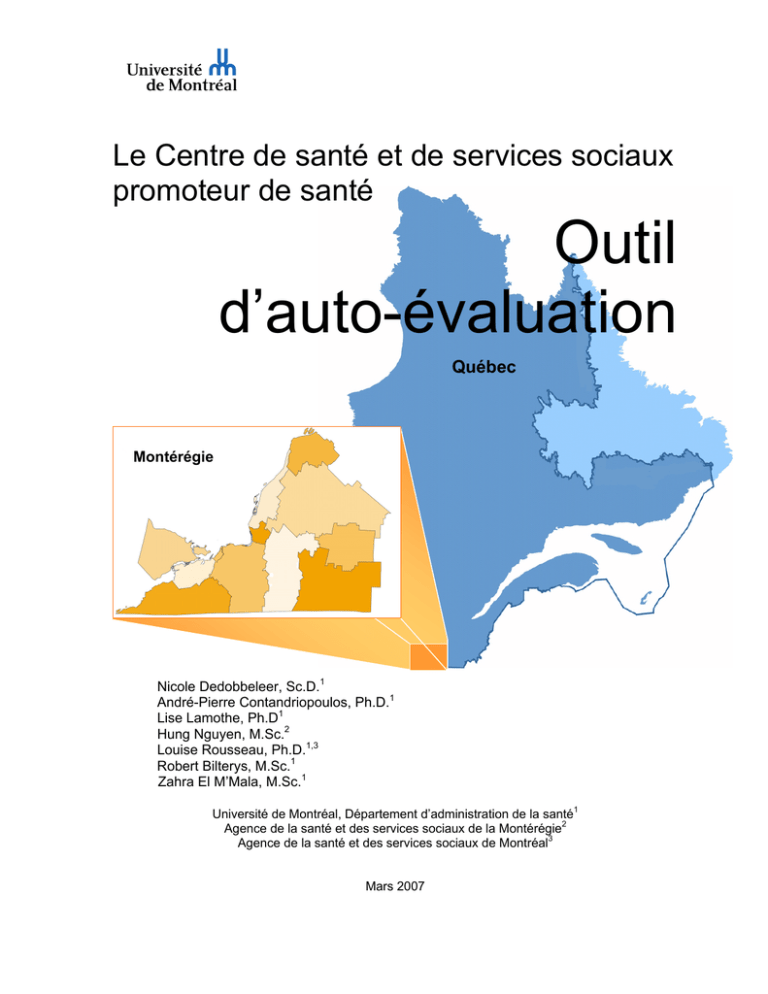 Le Centre de santé et de services sociaux promoteur de santé Outil d’auto-évaluation Québec Montérégie Nicole Dedobbeleer, Sc.D.1 André-Pierre Contandriopoulos, Ph.D.1 Lise Lamothe, Ph.D1 Hung Nguyen, M.Sc.2 Louise Rousseau, Ph.D.1,3 Robert Bilterys, M.Sc.1 Zahra El M’Mala, M.Sc.1 Université de Montréal, Département d’administration de la santé1 Agence de la santé et des services sociaux de la Montérégie2 Agence de la santé et des services sociaux de Montréal3 Mars 2007 Also available in English under the title: The Health Promoting Health and Social Services Center: Self Assessment Tool. Des copies sont disponibles à l’adresse suivante : Groupe de recherche interdisciplinaire en santé Université de Montréal C.P. 6128, succursale Centre-ville Montréal QC H3C 3J7 courriel : [email protected] Édité par GRIS Faculté de médecine Université de Montréal Dépôt légal – Bibliothèque et Archives nationales du Québec, 2007 Dépôt légal – Bibliothèque et Archives Canada, 2007 ISBN : 978-2-923544-04-5 Remerciements Nous tenons à souligner l’appui financier des Instituts de recherche en santé du Canada (subvention #139492) et de l’Agence de la santé et des services sociaux de la Montérégie (contrat 0531). Le développement de cet outil n’a pu se faire aussi sans la participation de nombreux collaborateurs. Nous tenons ainsi à remercier très chaleureusement les personnes clés des quatre CSSS de la Montérégie qui ont accepté de participer à notre étude exploratoire et qui ont investi temps et énergie à répondre à nos questions et à en commenter la pertinence et l’utilité. Nous remercions aussi particulièrement les collaborateurs suivants pour leurs conseils et leur appui soutenu tout au long de l’étude : Martin Beaumont, Inh, RRT., M.Sc., directeur de recherche et de développement, Conseil canadien d’agrément des services de santé, Ottawa, Canada Ginette Lafontaine, M.Sc., adjointe à la planification, évaluation et recherche, Agence de la santé et des services sociaux de la Montérégie, Montérégie, Québec, Canada Gilles Lanteigne, MBA, MSW, CGA, directeur exécutif adjoint, Conseil canadien d’agrément des services de santé, Ottawa, Canada Jürgen M. Pelikan, Ph.D., professeur, directeur du WHO Collaborating Centre for Health Promotion in Hospitals and Health Care c/o Ludwig Boltzmann Institute for the Sociology of Health and Medicine at the Institute of Sociology, Université de Vienne, Vienne, Autriche Denis A. Roy, M.D., M.P.H., M.Sc., FRCPC, directeur de la gestion de l’information et des connaissances, Agence de la santé et des services sociaux de la Montérégie, Montérégie, Canada Nous tenons à remercier Diane Crevier pour son travail de mise en page et sa contribution artistique à la présentation du document final. 3 TABLE DE MATIÈRES REMERCIEMENTS.............................................................................................................. 3 PRÉFACE ............................................................................................................................ 7 STANDARD I : ORGANISATION PROMOTRICE DE SANTÉ............................................ 9 CRITÈRE A : Politique de promotion de la santé ..........................................................................9 CRITÈRE B : Organisation apprenante et performante................................................................ 14 CRITÈRE C : Organisation protectrice de l’environnement ........................................................... 16 STANDARD II : SOINS PROMOTEURS DE SANTÉ ........................................................ 19 CRITÈRE A : Évaluation des besoins des patients/usagers de services de santé en promotion de la santé .................................................................................... 19 CRITÈRE B : Information auprès des patients/usagers de services de santé .................................. 20 CRITÈRE C : Programmes et interventions en promotion, prévention et protection de la santé......................................................................................... 22 CRITÈRE D : Changements environnementaux.......................................................................... 23 STANDARD III : MILIEU DE TRAVAIL PROMOTEUR DE SANTÉ .................................. 25 CRITÈRE A : Stratégies pour créer un milieu de travail sain et sécuritaire ..................................... 25 CRITÈRE B : Stratégies de promotion de saines habitudes de vie................................................. 28 CRITÈRE C : Modifications de l’environnement physique et social................................................. 29 CRITÈRE D : Participation du personnel ................................................................................... 31 STANDARD IV : COMMUNAUTÉ PROMOTRICE DE SANTÉ ......................................... 32 CRITÈRE A : Collaboration avec des partenaires ........................................................................ 32 CRITÈRE B : Réalisations avec les partenaires .......................................................................... 34 CRITÈRE C : Évaluation de la collaboration ............................................................................... 36 ÉVALUATION GLOBALE DE LA CONFORMITÉ AUX STANDARDS............................. 37 GLOSSAIRE ...................................................................................................................... 39 RÉFÉRENCES................................................................................................................... 40 5 Préface La planification de cet outil d’auto-évaluation a débuté en 2005 lors du financement de notre étude pilote sur l’extension du concept de l’OMS « Hôpital promoteur de santé » à celui de « Centre de santé et de services sociaux promoteur de santé » au Québec, Canada