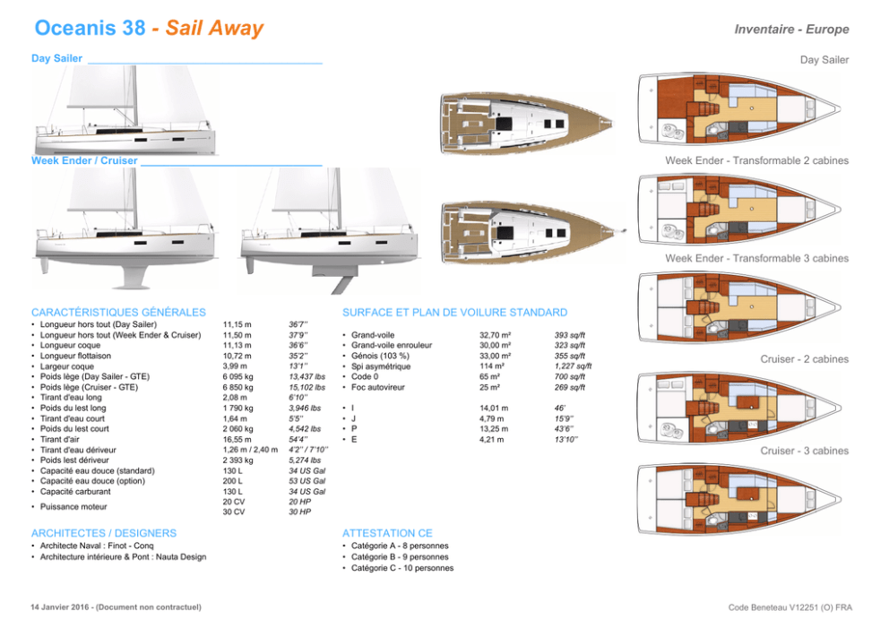 Oceanis 38 - Sail Away Inventaire - Europe Day Sailer ________________________________________ Day Sailer Week Ender / Cruiser _______________________________ Week Ender - Transformable 2 cabines Week Ender - Transformable 3 cabines CARACTÉRISTIQUES GÉNÉRALES • • • • • • • • • • • • • • • • • Longueur hors tout (Day Sailer) Longueur hors tout (Week Ender & Cruiser) Longueur coque Longueur flottaison Largeur coque Poids lège (Day Sailer - GTE) Poids lège (Cruiser - GTE) Tirant d'eau long Poids du lest long Tirant d'eau court Poids du lest court Tirant d'air Tirant d'eau dériveur Poids lest dériveur Capacité eau douce (standard) Capacité eau douce (option) Capacité carburant • Puissance moteur SURFACE ET PLAN DE VOILURE STANDARD 11,15 m 11,50 m 11,13 m 10,72 m 3,99 m 6 095 kg 6 850 kg 2,08 m 1 790 kg 1,64 m 2 060 kg 16,55 m 1,26 m / 2,40 m 2 393 kg 130 L 200 L 130 L 20 CV 30 CV 36’7’’ 37’9’’ 36’6’’ 35’2’’ 13’1’’ 13,437 lbs 15,102 lbs 6’10’’ 3,946 lbs 5’5’’ 4,542 lbs 54’4’’ 4’2’’ / 7’10’’ 5,274 lbs 34 US Gal 53 US Gal 34 US Gal 20 HP 30 HP • • • • • • Grand-voile Grand-voile enrouleur Génois (103 %) Spi asymétrique Code 0 Foc autovireur 32,70 m² 30,00 m² 33,00 m² 114 m² 65 m² 25 m² 393 sq/ft 323 sq/ft 355 sq/ft 1,227 sq/ft 700 sq/ft 269 sq/ft • • • • I J P E 14,01 m 4,79 m 13,25 m 4,21 m 46’ 15’9’’ 43’6’’ 13’10’’ Cruiser - 3 cabines ARCHITECTES / DESIGNERS ATTESTATION CE • Architecte Naval : Finot - Conq • Architecture intérieure & Pont : Nauta Design • Catégorie A - 8 personnes • Catégorie B - 9 personnes • Catégorie C - 10 personnes 14 Janvier 2016 - (Document non contractuel) Cruiser - 2 cabines Code Beneteau V12251 (O) FRA Oceanis 38 - Sail Away Inventaire - Europe Week Ender Day Sailer (Transformable) 2C 3C Week Ender Cruiser 2C Day Sailer 3C 2C CONSTRUCTION WINCHES • Conception faite selon les exigences des Directives Européennes et selon la certification CE • Coque de conception monolithique en polyester • Contre moule structurel monolithique collé à la coque • Pont en injection en sandwich fibre de verre et mousse Saerfoam, revêtu d'antidérapant de type "pointe de diamant" • Liaison coque pont vissée, collée et ceinturée par 1 pavois • Quille en fonte fixée avec boulons et contreplaque inox et collée • 2 Safrans suspendus avec mèche en inox • Coque de couleur blanche - Décoration de coque gris métal • 2 Winches d'écoute de génois self tailing (H40.2 STA) • 1 Winch de manoeuvre self tailing (H35.2 STA) • 1 Manivelle de winch aluminium "Speed Grip", 1 Boîte à manivelle de winch standard standard standard Cruiser 2C 3C standard standard standard standard standard standard standard standard standard standard standard standard Option Sail Away AMARRAGE - MOUILLAGE • Puits à chaîne autovideur - Piton d'étalingure - Capot • Pontet inox • 6 Taquets d'amarrage aluminium - Protections de livet en inox GRÉEMENT 14 Janvier 2016 - (Document non contractuel) 3C VOILES • Génois à enrouleur avec bande de protection UV • Grand voile siglée semi full batten à coulisseaux (coulisseaux à rouleaux pour lattes forcées) • Lazy Jack et Lazy Bag couleur Natural ÉQUIPEMENT DE PONT • Mât classique 9/10e aluminium anodisé posé sur le pont, 2 étages de barres de flèches poussantes • Bôme en aluminium anodisé • Gréement dormant en inox monotoron • 1 Pataras patte d'oie • Hale bas de bôme rigide avec palan • Enrouleur de génois avec tambour sur le pont • 2 Rails d'écoute de génois avec chariots avale-tout réglables par piston • 2 Filoirs inox de renvoi d'écoutes de génois • Manoeuvres ramenées au cockpit (sauf balancine de bôme) • Gréement courant complet : Drisse de grand voile, drisse de génois avec bloqueur au mât et taquet, Balancine de bôme avec taquet au mât, bordure et écoute de grand voile, 2 Écoutes de génois, 2 Ris automatiques • 4 Bloqueurs, 4 Taquets loveurs • 1 Point fixe - Écoute de grand voile, en fond de cockpit • Arceau fixe composite, avec éclairage LED incorporé • 2 Poulies Stand-up d'écoute de Grand Voile (Transformable) COCKPIT standard Option standard Option standard Sail Away • Fond de cockpit auto-videur • 1 Coffre de cockpit • 2 Coffres en fond de cockpit - Assises latérales barreur • 1 Coffre à bib - arrière du cockpit (0,95 m x 0,59 m x 0,36 m / 3’1’’ x 1’11’’ x 1’2’’) • Bancs de cockpit (1,69 m x 0,50 m / 5’7’’ x 1’8’’) • 2 Consoles de barres à roues : Barres à roues inox - diamètre 800 mm / 2’7’’ - gainage cuir - Appareils à gouverner sur poste de barre - système de transmission à drosses métalliques - Main courante inox - support instruments de navigation (instruments en option) - Porte gobelet • 2 Compas de route • 2 Nables de pont d'accès système barre franche • 1 Barre franche de secours • Commande moteur et tableau de contrôle à bâbord • 2 Portes de descente sur charnières en PMMA - Panneau coulissant en PMMA • 1 Échelle de bain • Douchette de cockpit eau chaude/Eau froide Code Beneteau V12251 (O) FRA Oceanis 38 - Sail Away Inventaire - Europe Week Ender Day Sailer (Transformable) 2C 3C Week Ender Cruiser 2C Day Sailer 3C 2C PROTECTIONS HUMAINES DESCENTE • • • • • • Hauteur sous barrot : 1,96 m / 6’5’’ • Descente du carré en polyester revêtues d'antidérapant sur les marches • 2 Mains courantes inox gainées cuir 1 Balcon avant inox ouvert, 2 Balcons arrière inox 1 Support bouée couronne Filières doubles et chandeliers inox Ouvertures de coupée à bâbord et à tribord Anneaux soudés sur balcon pour pavillon standard standard standard Option Option Sail Away standard standard standard CARRÉ • • • • • • • • • • • • Hauteur sous barrot : 1,95 m / 6’5’’ Banquette d