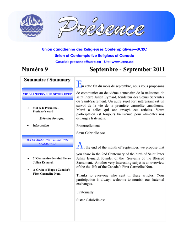 Union canadienne des Religieuses Contemplatives—UCRC Union canadienne des Religieuses Contemplatives—UCRC Union of Contemplative Religious of Canada Courriel: [email protected] Site: www.ucrc.ca Numéro 9 SSoom mm maaiirree // SSuum mm maarryy VIE DE L’UCRC- LIFE OF THE UCRC • Mot de la Présidente President’s word SrJanine Bourque. ••• Septembre - September 2011 E n cette fin du mois de septembre, nous vous proposons de communier au deuxième centenaire de la naissance de saint Pierre Julien Eymard, fondateur des Sœurs Servantes du Saint-Sacrement. Un autre sujet fort intéressant est un survol de la vie de la première carmélite canadienne. Merci à celles qui ont envoyé ces articles. Votre participation est toujours bienvenue pour alimenter nos échanges fraternels. IIInformation nnffoorrm maattiioonn Fraternellement . Sœur Gabrielle osc. ICI ET AILLEURS – HERE AND ELSEWHERE A t the end of the month of September, we propose that • 2e Centenaire de saint Pierre Julien Eymard. • A Grain of Hope : Canada’s First Carmelite Nun. you share in the 2nd Centernary of the birth of Saint Peter Julian Eymard, founder of the Servants of the Blessed Sacrament. Another very interesting subjet is an overview of the the life of the Canada’s First Carmelite Nun. Thanks to everyone who sent in these articles. Your participation is always welcome to nourish our fraternal exchanges. Fraternally Sister Gabrielle osc. Mot de la Présidente Voici l’automne aux mille coloris, le temps des récoltes et aussi des labours pour préparer la prochaine récolte. C’est le temps des relances, des nouveaux départs, de remises en route après la période plus relaxe de l’été et du repos. L’U.C.R.C. et la revue Présence ne font pas autrement. Nous voici donc avec une invitation à repartir … de notre baptême avec saint Pierre Julien Eymard, fondateur des Religieux et des Servantes du T.S. Sacrement. Ses réflexions sur son baptême sont pertinentes et interpellantes pour nous toutes encore aujourd’hui. Un Religieux du St Sacrement a écrit cet article que vous trouvez dans nos pages à l’occasion du 2è centenaire du baptême du P. Eymard, né le 4 février 1811. C’est le seul article parvenu à Présence. Si on souhaite la continuation de ce périodique, je rappelle qu’il en dépend de la matière à publier que nous pouvons recevoir. Chaque monastère est responsable en ce domaine! Bonne lecture, Sr Janine Bourque, sss Présidente du l’U.C.R.C. President’s word Here is autumn and its thousand colors, the time for harvests and for plowing to prepare the next harvest. It’s time for revival, for new beginnings and to start again after a good rest during the more relaxed season of summer. The U.C.R.C. and the magazine Presence are no different. So here we are with an invitation to start again ... with our baptism with St. Peter Julian Eymard, founder of the Brothers and the Servants of the Blessed Sacrament. His reflections on his baptism are relevant and make all of us stop and think today. A Brother of the Blessed Sacrament wrote this article that you can find in our pages on the occasion of the 2nd centenary of the baptism of Father Eymard, born on February 4th, 1811. This is the only article that reached Presence. If you want a continuation of this periodical, please note it depends on the material to be published that we can receive. Each monastery is responsible in this area! Happy reading, Sr Janine Bourque, sss President of the U.C.R.C. 2 Prochain Chapitre général - Next General Chapter Les Servantes du T.S. Sacrement tiendront leur chapitre général à Sherbrooke du 18 septembre au 8 octobre. Il réunira 21 capitulaires représentant 8 pays répartis sur les 5 continents. Au cours de ces assises, le chapitre procédera à l’élection d’un nouveau conseil général. Nous recommandons tous ces travaux à vos ferventes prières. The Servants of the very Blessed Sacrament will hold their General Chapter in Sherbrooke from September 18th to October 8th, 2011. It will gather 21 capitularies representing 8 countries from the 5 continents. During these meetings, the chapter will elect a new General Council. We recommend all these proceedings to your fervent prayers. Deuxième centenaire de la naissance et du baptême de saint Pierre Julien Eymard fondateur des Servantes du T.S. Sacrement Le P. Eymard et la « mémoire » de son baptême Barbiero, sss, P. Manuel Il y a 200 ans naissait le 4 février et était baptisé le 5, à La Mure d’Isère au diocèse de Grenoble en France, un petit garçon, d’une simple famille d’artisan. Un enfant comme les autres, qui a dû lutter et travailler pour vivre; qui a dû se battre pour suivre la vocation à laquelle il se sentait appelé. L’église paroissiale de l’époque du P. Eymard, conserve l’antique cuve en pierre où Pierre-Julien fut baptisé. Saint Pierre Julien Eymard est connu comme apôtre éminent de l’Eucharistie, nous connaissons avec quel soin il s’est préparé pour recevoir la première 3 communion; mais nous restons surpris quand nous découvrons que dans sa correspondance jamais il parle du jour anniversaire de sa première communion, par contre souvent il rappelle le jour de son baptême. Le baptême : une pierre d’angle de sa vie C’est à partir de l’année 1841 (il avait 30 ans) deux ans après son entrée chez les maristes qu’on trouve des écrits rappelant avec une certaine constance, son baptême. À l’occasion de la retraite du mois, il note le 5 février, que c’est sainte Agathe, jour de son baptême … (cf.NR 15,2-OC V,99) Le même jour, le 5 février 1841, il écrit à sa sœur Marianne, qui est sa marraine : « C’est aujourd’hui un beau jour pour moi, c’est aujourd’hui que je vous ai eue comme marraine. Vous savez que de millions de fois je vous ai appelée de ce doux nom. En entrant dans l’état ecclésiastique, je vous ai donné celui de sœur; mais l