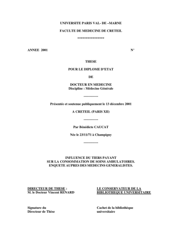 UNIVERSITE PARIS VAL- DE –MARNE FACULTE DE MEDECINE DE CRETEIL **************** ANNEE 2001 N° THESE POUR LE DIPLOME D’ETAT DE DOCTEUR EN MEDECINE Discipline : Médecine Générale ------------Présentée et soutenue publiquement le 13 décembre 2001 A CRETEIL (PARIS XII) ------------Par Bénédicte CAUCAT Née le 23/11/71 à Champigny ------------- INFLUENCE DU TIERS PAYANT SUR LA CONSOMMATION DE SOINS AMBULATOIRES. ENQUETE AUPRES DES MEDECINS GENERALISTES. DIRECTEUR DE THESE : M. le Docteur Vincent RENARD LE CONSERVATEUR DE LA BIBLIOTHEQUE UNIVERSITAIRE Signature du Directeur de Thèse Cachet de la bibliothèque universitaire 2 A mes amis, qui m’ont accompagnée et soutenue, et que j’ai parfois mis à l’épreuve, Avec une pensée particulière pour Franck, Sandrine, Carole, Hélène et Constance, A Karine, dont le soutien et la présence me sont si chers, A mes parents, A ma famille. 3 Je remercie chaleureusement Monsieur le Docteur Vincent RENARD d’avoir accepté la direction de ce travail, de m’avoir apporté son soutien et ses connaissances, et de s’être montré disponible pour la préparation de mon travail, Monsieur le Professeur LOISANCE, Monsieur le Professeur MAVIER et Monsieur le Professeur REVUZ d’accepter de faire partie de mon jury, Madame le Docteur Sylvie BASTUJI-GARIN de son aide pour le travail statistique ainsi que de sa patience et de sa disponibilité face à mes nombreuses sollicitations, Madame Anne PUEL, secrétaire dans le service de Santé Publique de l’hôpital Henri Mondor, d’avoir facilité mes démarches dans le service, Monsieur Didier RENARD, Professeur de Sciences Politiques à l’Université de Lyon, d’avoir apporté ses connaissances pointues sur l’historique de l’aide médicale, Les médecins généralistes qui ont participé à l’enquête, sans qui ce travail n’aurait pu aboutir, Je remercie particulièrement ceux qui, par quelques mots de soutien, ont témoigné de l’intérêt à ma recherche. 4 Je tiens également à remercier pour leur coopération dans mon travail de recherche : Madame Agnès GRANDIN, documentaliste au CREDES, Monsieur CARPENTIER, Directeur du Risque et de la Communication à la CPAM du Val de Marne, Madame PAILLARD, Chargée d’Etudes à la CPAM du Val de Marne, Monsieur CAMPARGUE et Madame DANIEL, du Service des Relations Professions de Santé à la CPAM DU Val de Marne, Madame C.QUILFEN, Responsable du Service de l’Aide Médicale au Conseil Général du Val de Marne, Monsieur François PAPE, Chargé de la Gestion des Risques à la CPAM de Beauvais, Madame Christel VALLEE, Chef de Service de l’Aide Médicale au Conseil général de l’Oise, Monsieur Joël MELZI, Directeur du Service Statistiques de la CPAM du Calvados, Monsieur le Docteur FX.GUYON, Médecin Conseil Chef de Service à la CPAM de Caen, Monsieur Marc PUZENAT, Attaché de direction à la CPAM de l’Eure, Madame F.HUET, Chef de Division de la Gestion du Risque à la CPAM de Nancy, Monsieur Patrick TEREYGEOL, Directeur de la Gestion du Risque à la CPAM de Paris, Monsieur le Docteur SERRUQUES, du service Etudes, Recherches et Documentation de la DASS de paris. 5 TABLE DES MATIERES 6 I. INTRODUCTION 9 II. DONNEES ETABLIES SUR L’AIDE MEDICALE, LA COUVERTURE MALADIE ET LA CONSOMMATION DE SOIN 12 II. 1 – L’aide médicale : le modèle de l’aide médicale départementale et de la couverture maladie universelle 13 II. 1.1 – Rappel historique sur la protection sociale et l’aide médicale en France 13 II. 1.2 – L’Aide Médicale Départementale 17 II. 1.2.1. – Mise en place de l’Aide Médicale Départementale 17 II. 1.2.2. – Conditions d’admission à l’Aide Médicale Départementale 18 II. 1.2.3. – Dépenses prises en charge au titre de l’aide médicale 20 II. 1.2.4. – Modalités d’amission à l’aide médicale 21 II. 1.3. – La Couverture Maladie Universelle (CMU) 22 II. 1.3.1. – Mise en place de la Couverture maladie Universelle 22 II. 1.3.2. – Conditions d’adhésion à la CMU 24 II. 1.3.3. – Prise en charge des prestations par la CMU complémentaire 27 II. 1.3.4. – La CMU en chiffres aujourd’hui 28 II. 2 – Influence du type de couverture maladie sur la consommation médicale 33 II. 2.1 – Etudes sur la consommation de soins des bénéficiaires de la CMU 33 II. 2.1.1 – Présentation des études 33 II. 2.1.2 – Les bénéficiaires de l’Aide Médicale Départemental 34 II. 2.1.3 – Résultats et interprétations 35 II. 2.2 – Consommation de soins ambulatoires par les bénéficiaires de la CMU 40 II. 2.2.1 – Les bénéficiaires de la CMU 40 II. 2.2.2 – Recours aux soins 41 II. 2.3 – Etudes sur les comportements de demande de soins selon la couverture Maladie 44 II. 2.3.1 – Liens entre état de santé, précarité sociale et assurance 44 II. 2.3.2 – Liens entre assurance, consommation de soins et revenus 48 II. 2.3.3 – Liens entre le recours au tiers payant et la consommation de soins 52 7 II. 2.4 – Réflexions sur les résultats des études présentées 54 II. 2.4.1 – Profil de consommation de soins ambulatoires des bénéficiaires de l’AMD et de la CMU 54 II. 2.4.2 – Profil socio-économique des bénéficiaires de l’AMD et de la CMU 55 II. 2.4.3 – Bilan entre le coût monétaire le gain social de la CMU 56 II. 3 – Représentations culturelles de l’aide médicale chez les médecins généralistes 57 II. 3.1 – Evolution du discours syndical des représentants des médecins généralistes 57 II. 3.2 – Opinion des généralistes sur la CMU : exemples à partir d’une revue de la presse médicale 60 II. 3.2.1 – Opinions favorables sur la CMU 61 II. 3.2.2 – Opinions défavorables sur la CMU 61 III. ENQUETE AUPRES DE MEDECINS GENERALISTES DU VAL DE MARNE SUR LA CONSOMMATION DE SOINS DES BENEFICIARES DE LA CMU 63 III. 1 – Matériel et méthode 64 III.1.1 – L’enquête 64 III.1.2 – Le taux de participation 65 III.1.3 – Le questionnaire 67 II