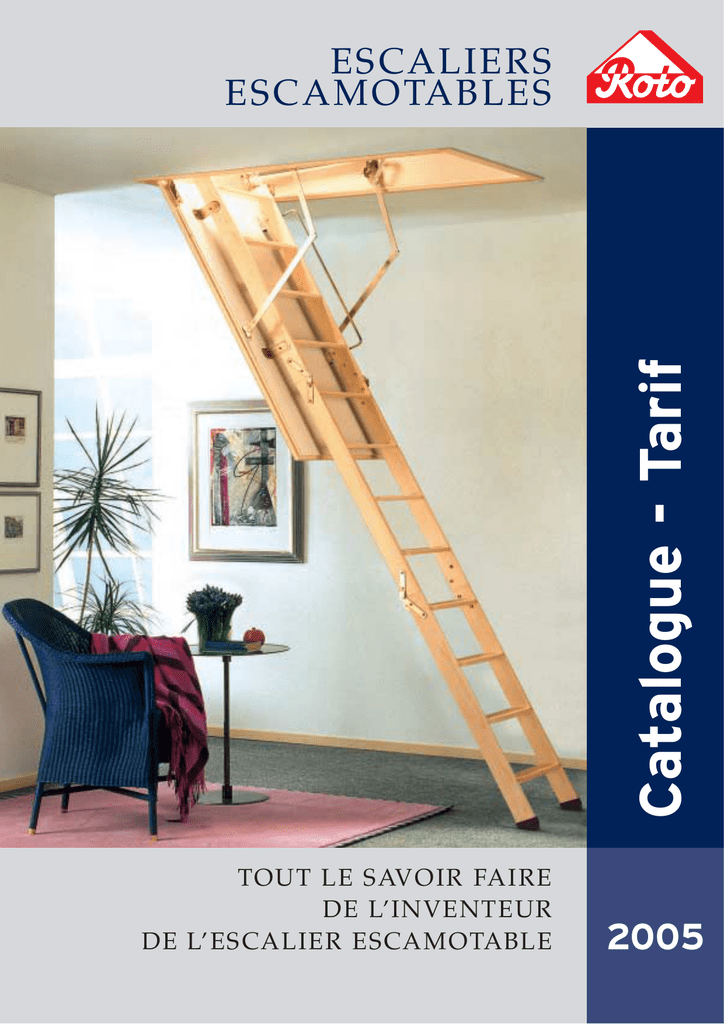 Catalogue - Tarif ESCALIERS ESCAMOTABLES TOUT LE SAVOIR FAIRE DE L’INVENTEUR DE L’ESCALIER ESCAMOTABLE 2005 2 LA GAMME D’ESCALIERS ESCAMOTABLES se décline en bois et en aluminium. Des matériaux nobles et de haute qualité pour accéder aux combles en toute sécurité. 8/3 ALU NORM 8/3 BOIS 8/2 ALU ISO-RC 6-7 8-9 ISO NORM 8/2 BOIS CADET 3 4-5 ISO ISO-RC ISO-RC 10-11 12-13 ESCAMOD ISO-RC 14-15 ESCAMOD WD-RC 16-17 Accessoires 18 Schémas techniques 19 3 8/3 ALU ISO 4 HAUT DE GAMME LE HAUT DE GAMME AVEC ISOLATION norme a l à me Confor 0 DIN 457 Modèle haut de gamme, 8/3 Aluminium, se décline en standard avec isolation thermique. Equipé d’un joint périphérique. Description du produit Entièrement monté d’usine, prêt à poser. L’escalier escamotable 3 parties ne nécessite pas d’espace de dégagement à l’étage, les éléments de l’échelle étant repliés dans le caisson. Trappe Panneau sandwich de 30 mm composé d’un isolant de 24 mm (mousse PU extrudée) recouvert de deux panneaux de fibres blancs (3 mm d’épaisseur) Cœfficient d’isolation en partie courante U = 0,85 W/m2K., avec loqueteau de fermeture pour plus de sécurité. Possibilité d’habillage de la trappe jusqu’à 20 mm (max. 10 Kg/m2) Eléments composant l’échelle Montants constitués de profilés spéciaux en aluminium (28 x 75 mm) Marches antidérapantes en aluminium (75 x 350 mm). 170 Charge admissible Kg (conformément à la norme DIN 4570) Caisson Bois latté collé de 19 mm, hauteur de caisson de 18 cm avec joint d’étanchéité monté en série. Equipement de série Bâton de manœuvre Couvre-joints faciles à monter Accessoires Balustrade de protection Etanchéité à l’air selon norme Emballage Emballage carton et film plastique Hauteur sous plafond Encombrement au sol Espace de basculement Longueur partie basse 120 X 70 cm 224 à 241 239 à 257 253 à 271 145 à 113 153 à 119 160 à 124 170 à 157 170 à 157 170 à 157 L 59 L 76 L 93 130 X 70 cm 219 à 241 234 à 256 248 à 272 153 à 113 162 à 119 170 à 125 173 à 157 173 à 157 173 à 157 L 59 L 76 L 93 140 X 70 cm 219 à 241 234 à 256 248 à 272 264 à 288 153 à 113 162 à 119 170 à 125 177 à 130 173 à 157 173 à 157 173 à 157 173 à 157 L 59 L 76 L 93 L 111 Les dimensions citées sont celles de la trémie, le caisson mesure 2 cm de moins. Prix dimensions standards 536,20 HT 641,30 TTC Possibilité de réalisation sur mesure, nous consulter Catalogue/Tarif ESCALIERS 2005 Dimensions trémie 8/3 ALU ISO DIN EN 12207 CLASSE 4 5 NORM 8/3 BOIS ISO-RC 6 HAUT DE GAMME LE HAUT DE GAMME AVEC ISOLATION Modèle haut de gamme, Norm 8/3 bois, se décline en standard avec isolation thermique. Equipé d’un joint périphérique. norme a l à me Confor 0 DIN 457 Description du produit Entièrement monté d’usine, prêt à poser. L’escalier escamotable 3 parties ne nécessite pas d’espace de dégagement à l’étage, les éléments de l’échelle étant repliés dans le caisson. Trappe Panneau sandwich de 36 mm composé d’un isolant de 30 mm et de deux panneaux de fibres blancs sur les deux faces, cœfficient d’isolation U = 0,85 W/m2K., avec loqueteau de fermeture pour plus de sécurité. Possibilité d’habillage de la trappe jusqu’à 20 mm (max. 10 Kg/m2) Eléments composant l’échelle Montants en pin (21 x 83 mm) Marches antidérapantes en pin (78 x 360 mm) . Liaison entre marches et montants par queue d’aronde Caisson Bois latté collé de 18 mm, hauteur de caisson de 22 cm avec joint d’étanchéité monté en série. 150 Charge admissible Kg (conformément à la norme DIN 4570) Accessoires Balustrade de protection Emballage Emballage carton et film plastique Dimensions trémie 120 X 60 cm 120 X 70 cm 130 X 70 cm 140 X 70 cm Etanchéité à l’air selon norme Produit certifié conforme à la norme DIN EN 12207 CLASSE 4 TÜV Rheinland Product Safety DIN 4570 Hauteur sous plafond Encombrement au sol Espace de basculement 220 à 289 135 à 87 153 à 162 Adaptation par recoupe de l’échelle Les dimensions citées sont celles de la trémie, le caisson mesure 2 cm de moins. Prix dimensions standards 315,90 HT 377,82 TTC Catalogue/Tarif ESCALIERS 2005 Equipement spécifique Main courante sur la partie supérieure droite de l’escalier NORM 8/3 BOIS ISO-RC Equipement de série Bâton de manœuvre Couvre-joints faciles à monter Pieds de protection 7 8/2 ALU ISO 8 HAUT DE GAMME UN CONFORT D’UTILISATION MÊME DANS LES PLUS PETITS ESPACES norme a l à me Confor 0 DIN 457 Le modèle 8/2 Aluminium est idéal si vous disposez de peu de place dans une pièce ou un couloir. Sa partie basse coulissante vous permet de l’installer jusqu’à 322 cm de hauteur sous plafond. Description du produit Entièrement monté d’usine, prêt à poser. Trappe Panneau sandwich de 30 mm composé d’un isolant de 24 mm (mousse PU extrudée) recouvert de 2 panneaux de fibres blancs (3 mm d’épaisseur) Cœfficient d’isolation en partie courante U = 0,85 W/m2K., avec loqueteau de fermeture pour plus de sécurité. Possibilité d’habillage de la trappe jusqu’à 20 mm (max. 10 Kg/m2) Eléments composant l’échelle Montants constitués de profilés spéciaux en aluminium teinte naturelle (28 x 75 mm) Marches antidérapantes en aluminium (75 x 350 mm). Caisson Bois latté collé de 19 mm, hauteur de caisson de 18 cm avec joint d’étanchéité monté en série. 170 Charge admissible Kg (conformément à la norme DIN 4570) Equipement de série Bâton de manœuvre Couvre-joints faciles à monter Accessoires Balustrade de protection Etanchéité à l’air selon norme DIN EN 12207 CLASSE 4 8/2 ALU ISO Emballage Emballage carton et film plastique Hauteur sous plafond Encombrement au sol Espace de dégagement Longueur partie basse 120 X 60 cm 120 X 70 cm 216 à 236 236 à 258 255 à 279 275 à 301 151 à 112 162 à 120 174 à 128 185 à 136 47 70 93 116 L 155 L 178 L 201 L 224 140 X 70 cm 235 à 257 255 à 279 275 à 300 295 à