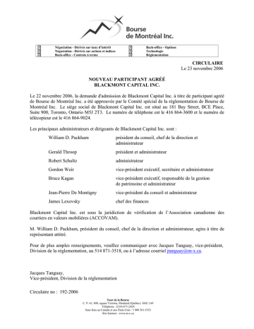 Négociation - Dérivés sur taux d’intérêt Négociation - Dérivés sur actions et indices Back-office - Contrats à terme Back-office - Options Technologie Réglementation CIRCULAIRE Le 23 novembre 2006 NOUVEAU PARTICIPANT AGRÉÉ BLACKMONT CAPITAL INC. Le 22 novembre 2006, la demande d'admission de Blackmont Capital Inc. à titre de participant agréé de Bourse de Montréal Inc. a été approuvée par le Comité spécial de la réglementation de Bourse de Montréal Inc. Le siège social de Blackmont Capital Inc. est situé au 181 Bay Street, BCE Place, Suite 900, Toronto, Ontario M5J 2T3. Le numéro de téléphone est le 416 864-3600 et le numéro de télécopieur est le 416 864-9024. Les principaux administrateurs et dirigeants de Blackmont Capital Inc. sont : William D. Packham président du conseil, chef de la direction et administrateur Gerald Throop président et administrateur Robert Schultz administrateur Gordon Weir vice-président exécutif, secrétaire et administrateur Bruce Kagan vice-président exécutif, responsable de la gestion de patrimoine et administrateur Jean-Pierre De Montigny vice-président du conseil et administrateur James Lexovsky chef des finances Blackmont Capital Inc. est sous la juridiction de vérification de l’Association canadienne des courtiers en valeurs mobilières (ACCOVAM). M. William D. Packham, président du conseil, chef de la direction et administrateur, agira à titre de représentant attitré. Pour de plus amples renseignements, veuillez communiquer avec Jacques Tanguay, vice-président, Division de la réglementation, au 514 871-3518, ou à l’adresse courriel [email protected]. Jacques Tanguay, Vice-président, Division de la réglementation Circulaire no : 192-2006 Tour de la Bourse C. P. 61, 800, square Victoria, Montréal (Québec) H4Z 1A9 Téléphone : (514) 871-2424 Sans frais au Canada et aux États-Unis : 1 800 361-5353 Site Internet : www.m-x.ca