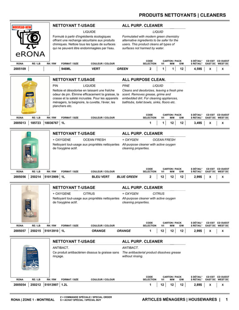 PRODUITS NETTOYANTS | CLEANERS RONA RE / LB NETTOYANT T-USAGE ALL PURP. CLEANER LIQUIDE Formulé à partir d'ingrédients écologiques offrant une rechange sécuritaire aux produits chimiques. Nettoie tous les types de surfaces qui ne peuvent être endommagées par l'eau. LIQUID Formulated with modern green chemistry alternative ingredients to be safer for the users. This product cleans all types of surfaces not harmed by water. RK / RW 2005109 FORMAT / SIZE 946ML RONA RE / LB 2005013 185723 CODE SELECTION COULEUR / COLOUR VERT GREEN 2 Gro Ord CARTON / PACK V/I M/M O/M 1 1 12 NETTOYANT T.USAGE ALL PURPOSE CLEAN. PIN LIQUIDE Nettoie et désodorise en laissant une fraîche odeur de pin. Élimine efficacement la graisse, la crasse et la saleté incrustée. Pour les appareils ménagers, la baignoire, la cuvette, l'évier, les planchers etc. PINE LIQUID Cleans and deodorizes, leaving a fresh pine scent. Removes grease, grime and embedded dirt. For cleaning appliances, bathtubs, toilet bowls, sinks, floors etc. RK / RW FORMAT / SIZE CODE SELECTION COULEUR / COLOUR 18036767 1L 1 NETTOYANT T-USAGE CARTON / PACK V/I M/M O/M 1 12 12 $ DÉTAIL* $ RETAIL* 4,59$ CD EST CD OUEST EAST DC WEST DC X T X Gro Ord $ DÉTAIL* $ RETAIL* 3,49$ CD EST CD OUEST EAST DC WEST DC X X ALL PURP. CLEANER + OXYGENE OCEAN FRESH + OXYGEN OCEAN FRESH Nettoyant tout-usage aux propriétés nettoyantes All-purpose cleaner with active oxygen de l'oxygène actif. cleaning properties. RONA RE / LB 2005056 250214 RK / RW FORMAT / SIZE 51013909 1L CODE SELECTION COULEUR / COLOUR BLEU VERT BLUE GREEN NETTOYANT T-USAGE 2 Gro Ord CARTON / PACK V/I M/M O/M 12 12 12 $ DÉTAIL* $ RETAIL* 2,99$ CD EST CD OUEST EAST DC WEST DC X X ALL PURP. CLEANER + OXYGENE CITRUS + OXYGEN CITRUS Nettoyant tout-usage aux propriétés nettoyantes All-purpose cleaner with active oxygen de l'oxygène actif. cleaning properties. RONA RE / LB 2005057 250215 RONA RE / LB 2005054 250212 RK / RW FORMAT / SIZE 51013910 1L CODE SELECTION COULEUR / COLOUR ORANGE ORANGE 1 Gro Ord CARTON / PACK V/I M/M O/M 12 12 12 NETTOYANT T-USAGE ALL PURP. CLEANER ANTIBACT. Ce produit antibactérien dissous la graisse sans rinçage. ANTIBACT. The antibacterial product dissolves grease without rinsing. RK / RW FORMAT / SIZE COULEUR / COLOUR 51013907 1.2L RONA | ZONE 1 - MONTREAL Z = COMMANDE SPÉCIALE / SPECIAL ORDER S = ACHAT SPÉCIAL / SPECIAL BUY CODE SELECTION 1 CARTON / PACK V/I M/M O/M 12 12 12 $ DÉTAIL* $ RETAIL* 2,99$ CD EST CD OUEST EAST DC WEST DC X X Gro Ord $ DÉTAIL* $ RETAIL* 2,89$ CD EST CD OUEST EAST DC WEST DC X ARTICLES MÉNAGERS | HOUSEWARES | X 1 PRODUITS NETTOYANTS | CLEANERS RONA RE / LB 2005023 185729 RONA RE / LB 2012044 187490 RONA RE / LB 2005026 185730 RONA RE / LB 2005055 250213 RONA RE / LB 2005015 185725 NETTOYANT T.USAGE ALL PURPOSE CLEAN. CITRON Idéal pour usage domestique et institutionnel. Ce produit nettoie toutes surfaces dures, comptoirs, murs, revêtements de sol, portes, stores, surfaces peintes ou autres. LEMON This all-purpose cleaner is ideal for household and institutional use. This product may be used to clean hard surfaces such as countertops, walls, floors, doors, blinds, painted surfaces and more. RK / RW FORMAT / SIZE COULEUR / COLOUR 18036765 1.2L CODE SELECTION CARTON / PACK V/I M/M O/M 1 1 12 12 NETTOYANT T-USAGE ALL PURP.CLEANER PRO-88 (COMM LIQUIDE Pour usage domestique et institutionnel. Pour surfaces dures, comptoirs, murs, revêtements de sol, portes, stores, surfaces peintes et autres. Parfum de citron. PRO-88 (COMM LIQUID Ideal for household and institutional use. This product may be used to clean hard surfaces such as countertops, walls, floors, doors, blinds, painted surfaces and more. Lemon scent. RK / RW FORMAT / SIZE COULEUR / COLOUR 18037693 4L CODE SELECTION 2 CARTON / PACK V/I M/M O/M 4 4 4 NETTOYANT T.USAGE ALL PURPOSE CLEAN. CITRON Idéal pour usage domestique et institutionnel. Ce produit nettoie toutes surfaces dures, comptoirs, murs, revêtements de sol, portes, stores, surfaces peintes ou autres. LEMON This all-purpose cleaner is ideal for household and institutional use. This product may be used to clean hard surfaces such as countertops, walls, floors, doors, blinds, painted surfaces and more. RK / RW FORMAT / SIZE COULEUR / COLOUR 18036768 5L CODE SELECTION 1 CARTON / PACK V/I M/M O/M 1 4 4 NETTOYANT T-USAGE ALL PURP. CLEANER ANTIBACT. Ce produit antibactérien dissous la graisse sans rinçage. ANTIBACT. The antibacterial product dissolves grease without rinsing. RK / RW FORMAT / SIZE COULEUR / COLOUR 51013908 5L CODE SELECTION 1 4 4 CREAM CLEANSER CITRON CREME Pour utilisation sur presque toutes les surfaces de la salle de bain et cuisine incluant les éviers, comptoirs, cuisinières et autres surfaces. LEMON CREAM Can be used on most washroom and kitchen surfaces including sinks, stove tops, countertops and more. FORMAT / SIZE COULEUR / COLOUR 18036769 500ML RONA | ZONE 1 - MONTREAL Z = COMMANDE SPÉCIALE / SPECIAL ORDER S = ACHAT SPÉCIAL / SPECIAL BUY CODE SELECTION 1 CARTON / PACK V/I M/M O/M 1 16 $ DÉTAIL* $ RETAIL* 2,89$ CD EST CD OUEST EAST DC WEST DC X X Gro Ord $ DÉTAIL* $ RETAIL* 7,39$ CD EST CD OUEST EAST DC WEST DC X X Gro Ord $ DÉTAIL* $ RETAIL* 11,29$ CD EST CD OUEST EAST DC WEST DC X X Ord NETTOYANT CREMEUX RK / RW Ord Gro CARTON / PACK V/I M/M O/M 4 Gro 16 $ DÉTAIL* $ RETAIL* 10,29$ CD EST CD OUEST EAST DC WEST DC X X Gro Ord $ DÉTAIL* $ RETAIL* 2,49$ CD EST CD OUEST EAST DC WEST DC X ARTICLES MÉNAGERS | HOUSEWARES | X 2 PRODUITS NETTOYANTS | CLEANERS RONA RE / LB 2005093 291540 RONA RE / LB NETTOY.ANTI-MOISI. CLEANER MILDEW-0FF Nettoyant qui enlève les taches de moisissure, PH 3.0 - 5.0; H2O2 (% p/p): 2.8 - 2.9; densité 0.97 - 1.02. Cleaner that removes mildew stains, PH 3.0 5.0; H2O2 (% p/p) 2.9 - 2.9; density 0.97 1.02. RK / RW INCOLORE RE / LB 2005021 185728 RE / LB 2005103 297843 1 1 12 SALLE-BAIN LIQUIDE Pour faire disparaître les résidus savonneux et les dépôts de calca