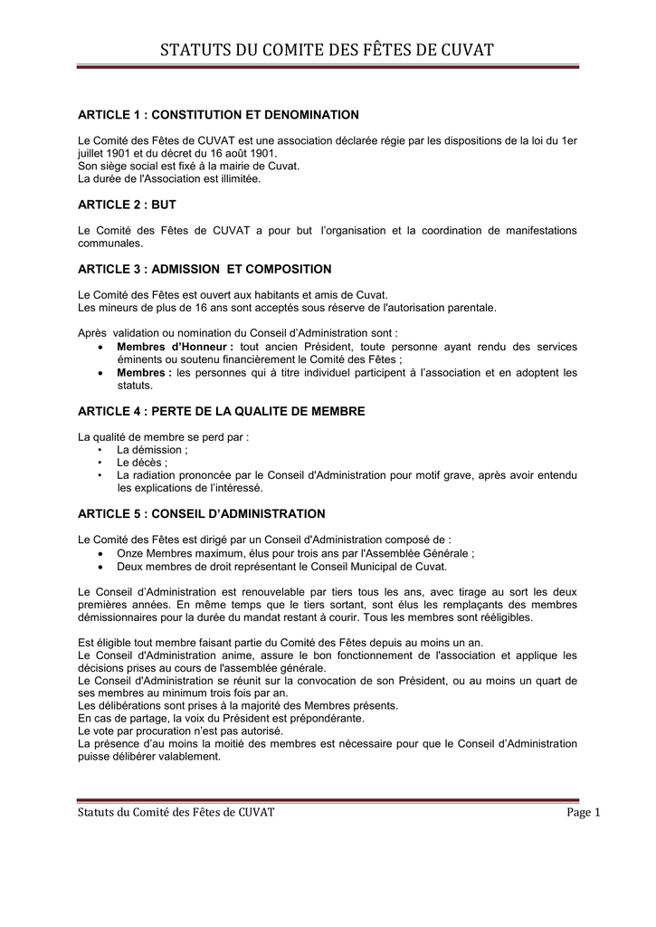 STATUTS DU COMITE DES FÊTES DE CUVAT