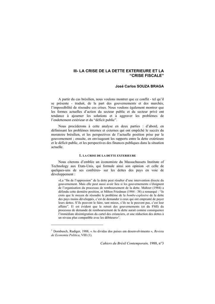 III- LA CRISE DE LA DETTE EXTERIEURE ET LA “CRISE FISCALE” José Carlos SOUZA BRAGA A partir du cas brésilien, nous voulons montrer que ce conflit - tel qu’il se présente - traduit, de la part des gouvernements et des marchés, l’impossibilité de résoudre ces crises. Nous voulons également montrer que les formes actuelles d’action du secteur public et du secteur privé ont tendance à ajourner les solutions et à aggraver les problèmes de l’endettement extérieur et du “déficit public”. Nous procéderons à cette analyse en deux parties : d’abord, en définissant les problèmes internes et externes qui ont empêché le succès du moratoire brésilien, et les perspectives de l’actuelle position prise par le gouvernement ; ensuite, en envisageant les rapports entre la dette extérieure et le déficit public, et les perspectives des finances publiques dans la situation actuelle. 1. LA CRISE DE LA DETTE EXTERIEURE Nous citerons d’emblée un économiste du Massachussets Institute of Technology aux Etats-Unis, qui formule ainsi son opinion -et celle de quelques-uns de ses confrères- sur les dettes des pays en voie de développement : «La “fin de l’oppression” de la dette peut résulter d’une intervention directe du gouvernement. Mais elle peut aussi avoir lieu si les gouvernements s’éloignent de l’organisation du processus de remboursement de la dette. Maltzer (1984) a défendu cette dernière position, et Milton Friedman (1984 : 38) a remarqué : “Je crois que le moyen de résoudre le problème de la bombe-explosive de la dette des pays moins développés, c’est de demander à ceux qui ont emprunté de payer leurs dettes. S’ils peuvent le faire, tant mieux, s’ils ne le peuvent pas, c’est leur affaire”. I1 est évident que le retrait des gouvernements (et du FMI) du processus de demande de remboursement de la dette aurait comme conséquence l’immédiate désintégration du cartel des créanciers, et une réduction des dettes à un niveau plus compatible avec les débiteurs»1. 1 Dornbusch, Rudiger, 1988, « As dividas dos paises em desenvolvimento », Revista de Economia Politica, VIII (1). Cahiers du Brésil Contemporain, 1988, n°3 José Carlos SOUZA BRAGA Sur le marché financier international, on compte déjà sur la dévaluation des dettes extérieures. Et la déstructuration des finances publiques -ce qu’on appelle la “crise fiscale”- met systématiquement en jeu les politiques orthodoxes et hétérodoxes, surtout parce que les intérêts et les amortissements extérieurs déséquilibrent les budgets publics. Dans les deux crises, l’une des questions les plus importantes est la suivante : quel est le rôle des Etats capitalistes ? Et, plus exactement, quelle est la meilleure attitude à recommander aux gouvernements ? Les réponses à ces questions tendent à la radicalisation, l’une demande aux gouvernements et au FMI de ne plus s’occuper de ces problèmes, l’autre réclame une intervention directe des gouvernements. Le principal “maître” du monétarisme aux Etats-Unis -Milton Friedman- semble faire une plaisanterie de mauvais goût. Même s’ils disent le contraire, il est évident que les gouvernements ne vont pas se retirer. Tout simplement parce que leurs banquiers et leurs entrepreneurs ne les laisseront pas faire. Si les dettes ne sont pas remboursées, le problème sera à la fois celui des débiteurs et celui des créanciers. A vrai dire, ces derniers n’ont encore rien perdu depuis 1982, quand la crise des endettements a été déclenchée par le Mexique. Les créanciers -pour exiger le remboursement des dettes- ont créé leur cartel, en accord avec le FMI. Les débiteurs, au lieu de former un cartel, ont fait monter la concurrence entre eux pour voir qui perdait le moins. C’est une naïveté de croire que les gouvernements ont le choix entre agir et ne pas agir Ce qu’il faut prendre en considération, c’est la nature de l’actuelle intervention de l’Etat, en évaluant si elle contribue ou non à la solution des problèmes. De toute façon, le débat sur le conflit entre l’intervention gouvernementale et les mécanismes de marché montre bien que ces crises ont détruit les engrenages et les institutions crées depuis l’après-guerre pour la régulation étatique des économies capitalistes. Cette forme d’articulation entre les sphères du public et du privé s’est épuisée. En attendant la création d’une nouvelle articulation, on recourt au vieux schéma du pouvoir coercitif pour “demander l’addition”. Le débat s’est complètement politisé, mais les acrobaties idéologiques des libéraux et des conservateurs veulent nous faire croire que le marché, une fois libéré de la régulation étatique, fournira la solution. Dans la pratique, les gouvernements des principaux pays créanciers (et le FMI) prêtent tout ce qu’ils peuvent afin d’aider le cartel des créanciers à réclamer le remboursement de la dette. III- La crise de la dette extérieure et la « crise fiscale » Le moratoire brésilien, suspendu depuis février 1988, a essayé de rompre le vieux schéma. Peu à peu, il a commencé à être mis en déroute. Pour instaurer son know-how dans le blocage des exportations brésiliennes, le gouvernement américain a brandi la menace des représailles commerciales. Même si cela n’a pas de sens au plan économique, les créanciers demandent le remboursement de la dette en dollars et réduisent les possibilités de l’avoir à travers les exportations. C’est toujours le même schéma qui a cours: ils continuent à garantir leurs succès à travers une gestion conventionnelle, en se protégeant contre les risques. Les banques n’ont pas pris les précautions nécessaires face à la grave situation cambiale qui se manifestait en 1982 et, quand elles en ont mesuré l’ampleur, il était déjà trop tard. D’après les données statistiques1, les neuf plus gran