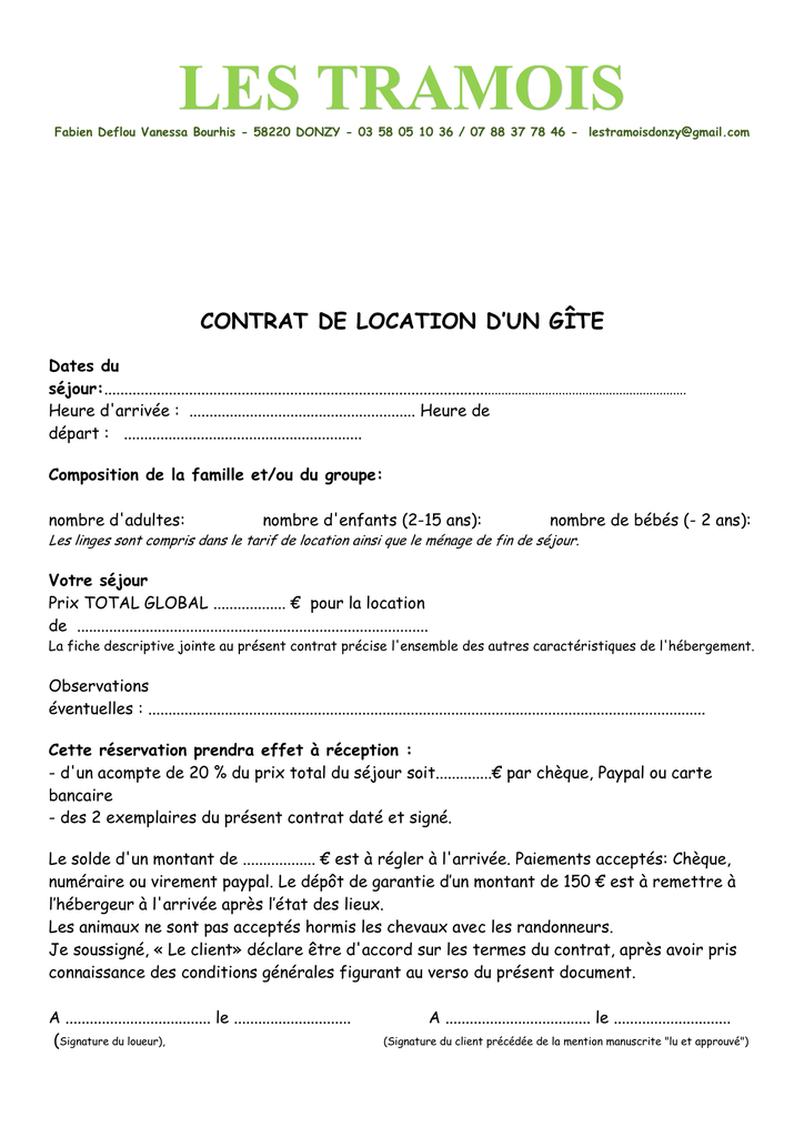 LES TRAMOIS Fabien Deflou Vanessa Bourhis - 58220 DONZY - 03 58 05 10 36 / 07 88 37 78 46 - [email protected] CONTRAT DE LOCATION D’UN GÎTE Dates du séjour:.......................................................................................................................................................... Heure d'arrivée : ........................................................ Heure de départ : ........................................................... Composition de la famille et/ou du groupe: nombre d'adultes: nombre d'enfants (2-15 ans): nombre de bébés (- 2 ans): Les linges sont compris dans le tarif de location ainsi que le ménage de fin de séjour. Votre séjour Prix TOTAL GLOBAL .................. € pour la location de ....................................................................................... La fiche descriptive jointe au présent contrat précise l'ensemble des autres caractéristiques de l'hébergement. Observations éventuelles : .......................................................................................................................................... Cette réservation prendra effet à réception : - d'un acompte de 20 % du prix total du séjour soit..............€ par chèque, Paypal ou carte bancaire - des 2 exemplaires du présent contrat daté et signé. Le solde d'un montant de .................. € est à régler à l'arrivée. Paiements acceptés: Chèque, numéraire ou virement paypal. Le dépôt de garantie d’un montant de 150 € est à remettre à l’hébergeur à l'arrivée après l’état des lieux. Les animaux ne sont pas acceptés hormis les chevaux avec les randonneurs. Je soussigné, « Le client» déclare être d'accord sur les termes du contrat, après avoir pris connaissance des conditions générales figurant au verso du présent document. A .................................... le ............................. (Signature du loueur), A .................................... le ............................. (Signature du client précédée de la mention manuscrite "lu et approuvé") Conditions Générales et Particulières de location d'hébergements Article 1 : Ce contrat de location saisonnière est réservé à l'usage exclusif de séjour en meublés de tourisme. Article 2 : durée du séjour. Le locataire signataire du présent contrat conclu pour une durée déterminée ne pourra en aucune circonstance se prévaloir d'un quelconque droit au maintien dans les lieux à l'issue du séjour. Article 3 : conclusion du contrat. La réservation devient effective dès lors que le locataire aura fait parvenir au propriétaire un acompte de 20 % du montant total de la location et un exemplaire du contrat signé. Un deuxième exemplaire est à conserver par le locataire. Article 4 : annulation par le locataire. Toute annulation doit être notifiée au prestataire partie au contrat. a) annulation avant l'arrivée dans les lieux : l'acompte reste acquis au loueur. Celui-ci pourra demander le solde du montant du séjour, si l'annulation intervient moins de 30 jours avant la date prévue d'entrée dans les lieux. Si le locataire ne se manifeste pas dans les 24 heures qui suivent la date d'arrivée indiquée sur le contrat, le présent contrat devient nul et le loueur peut disposer de son gîte. L'acompte reste également acquis au loueur qui demandera le solde de la location. b) si le séjour est écourté, le prix de la location reste acquis au loueur. Dans ce cas, il ne sera procédé à aucun remboursement. Article 5 : annulation par le loueur. Le loueur reverse au locataire l'intégralité des sommes versées, ainsi qu'une indemnité au moins égale à celle que le locataire aurait supportée si l'annulation était intervenue de son fait à cette date. Article 6 : arrivée. Le locataire doit se présenter le jour précisé et à l'heure mentionnée sur le présent contrat. En cas d'arrivée tardive ou différée, le locataire doit prévenir le loueur. Article 7 : règlement du solde: Le solde de la location est versé à l'entrée dans les lieux. Article 8 : état des lieux. Un inventaire est établi en commun et signé par le locataire et le loueur ou son représentant à l'arrivée et au départ du gîte. Cet inventaire constitue la seule référence en cas de litige concernant l'état des lieux. L'état de propreté du gîte à l'arrivée du locataire devra être constaté dans l'état des lieux. Le nettoyage des locaux est à la charge du locataire pendant la période de location. Article 9 : dépôt de garantie ou caution. A l'arrivée du locataire, un dépôt de garantie dont le montant est indiqué au recto du présent contrat est demandé par le loueur. Après l'établissement contradictoire de l'état des lieux de sortie, ce dépôt est restitué, déduction faite du coût de remise en état des lieux si des dégradations étaient constatées. En cas de départ anticipé (antérieur à l'heure mentionnée sur le présent contrat) empêchant l'établissement de l'état des lieux le jour même du départ du locataire, le dépôt de garantie est renvoyé par le loueur dans un délai n'excédant pas une semaine. Article 10 : utilisation des lieux. Le locataire devra assurer le caractère paisible de la location et en faire usage conformément à la destination des lieux. Article 11 : capacité. Le présent contrat est établi pour une capacité maximum de personnes. Si le nombre de locataires dépasse la capacité d'accueil, le loueur peut refuser les personnes supplémentaires. Toute modification ou rupture du contrat sera en conséquence considérée à l'initiative du client. Article 12 : animaux. Le présent contrat précise si le locataire peut ou non séjourner en compagnie d'un animal domestique. En cas de non respect de cette clause par le locataire, le loueur peut refuser le séjour. Dans ce cas, aucun remboursement ne sera effectué. Article 13 : assurances. Le locataire est responsable de tous les