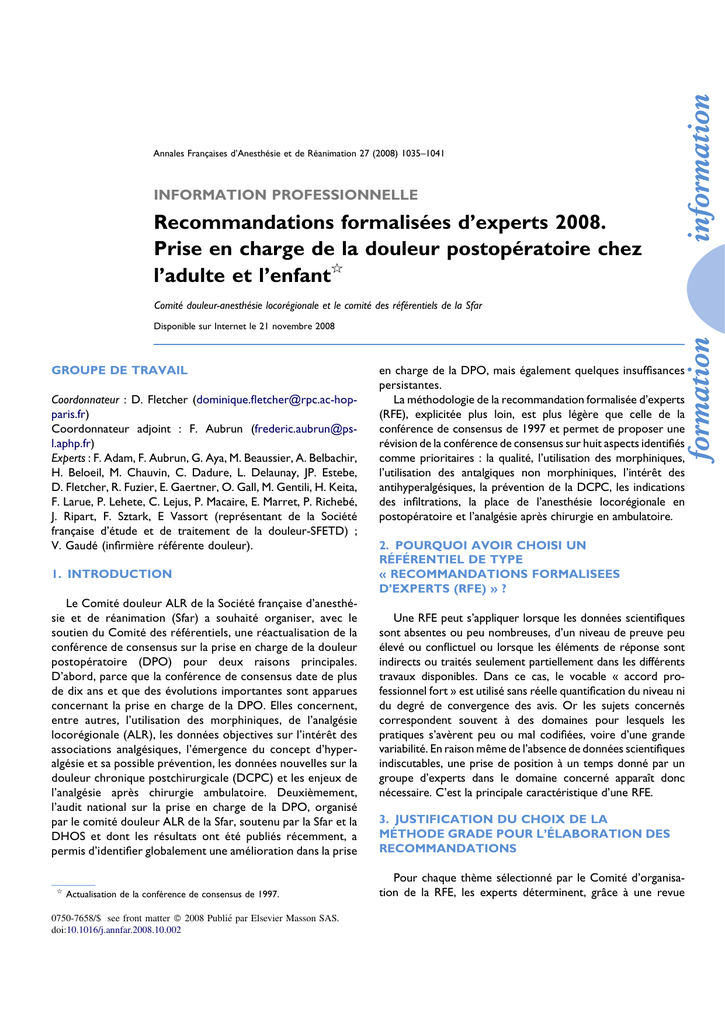 Annales Françaises d’Anesthésie et de Réanimation 27 (2008) 1035–1041 INFORMATION PROFESSIONNELLE Recommandations formalisées d’experts 2008. Prise en charge de la douleur postopératoire chez l’adulte et l’enfant§ Comité douleur-anesthésie locorégionale et le comité des référentiels de la Sfar Disponible sur Internet le 21 novembre 2008 GROUPE DE TRAVAIL Coordonnateur : D. Fletcher ([email protected]) Coordonnateur adjoint : F. Aubrun ([email protected]) Experts : F. Adam, F. Aubrun, G. Aya, M. Beaussier, A. Belbachir, H. Beloeil, M. Chauvin, C. Dadure, L. Delaunay, JP. Estebe, D. Fletcher, R. Fuzier, E. Gaertner, O. Gall, M. Gentili, H. Keita, F. Larue, P. Lehete, C. Lejus, P. Macaire, E. Marret, P. Richebé, J. Ripart, F. Sztark, E Vassort (représentant de la Société française d’étude et de traitement de la douleur-SFETD) ; V. Gaudé (infirmière référente douleur). 1. INTRODUCTION Le Comité douleur ALR de la Société française d’anesthésie et de réanimation (Sfar) a souhaité organiser, avec le soutien du Comité des référentiels, une réactualisation de la conférence de consensus sur la prise en charge de la douleur postopératoire (DPO) pour deux raisons principales. D’abord, parce que la conférence de consensus date de plus de dix ans et que des évolutions importantes sont apparues concernant la prise en charge de la DPO. Elles concernent, entre autres, l’utilisation des morphiniques, de l’analgésie locorégionale (ALR), les données objectives sur l’intérêt des associations analgésiques, l’émergence du concept d’hyperalgésie et sa possible prévention, les données nouvelles sur la douleur chronique postchirurgicale (DCPC) et les enjeux de l’analgésie après chirurgie ambulatoire. Deuxièmement, l’audit national sur la prise en charge de la DPO, organisé par le comité douleur ALR de la Sfar, soutenu par la Sfar et la DHOS et dont les résultats ont été publiés récemment, a permis d’identifier globalement une amélioration dans la prise § Actualisation de la conférence de consensus de 1997. 0750-7658/$ see front matter ß 2008 Publié par Elsevier Masson SAS. doi:10.1016/j.annfar.2008.10.002 en charge de la DPO, mais également quelques insuffisances persistantes. La méthodologie de la recommandation formalisée d’experts (RFE), explicitée plus loin, est plus légère que celle de la conférence de consensus de 1997 et permet de proposer une révision de la conférence de consensus sur huit aspects identifiés comme prioritaires : la qualité, l’utilisation des morphiniques, l’utilisation des antalgiques non morphiniques, l’intérêt des antihyperalgésiques, la prévention de la DCPC, les indications des infiltrations, la place de l’anesthésie locorégionale en postopératoire et l’analgésie après chirurgie en ambulatoire. 2. POURQUOI AVOIR CHOISI UN RÉFÉRENTIEL DE TYPE « RECOMMANDATIONS FORMALISEES D’EXPERTS (RFE) » ? Une RFE peut s’appliquer lorsque les données scientifiques sont absentes ou peu nombreuses, d’un niveau de preuve peu élevé ou conflictuel ou lorsque les éléments de réponse sont indirects ou traités seulement partiellement dans les différents travaux disponibles. Dans ce cas, le vocable « accord professionnel fort » est utilisé sans réelle quantification du niveau ni du degré de convergence des avis. Or les sujets concernés correspondent souvent à des domaines pour lesquels les pratiques s’avèrent peu ou mal codifiées, voire d’une grande variabilité. En raison même de l’absence de données scientifiques indiscutables, une prise de position à un temps donné par un groupe d’experts dans le domaine concerné apparaît donc nécessaire. C’est la principale caractéristique d’une RFE. 3. JUSTIFICATION DU CHOIX DE LA MÉTHODE GRADE POUR L’ÉLABORATION DES RECOMMANDATIONS Pour chaque thème sélectionné par le Comité d’organisation de la RFE, les experts déterminent, grâce à une revue 1036 Information professionnelle / Annales Françaises d’Anesthésie et de Réanimation 27 (2008) 1035–1041 systématique de la littérature, différentes sujets dignes d’intérêt. Pour chacun des sujets, des « critères de jugement cruciaux et importants » sont décidés avec un classement du niveau de preuve et l’appréciation de la balance bénéfice–risque. Trois niveaux de preuve sont déterminés : essai randomisé (haut niveau de preuve), étude observationnelle (bas niveau de preuve) et autres sources de données (très bas niveau de preuve). L’originalité de la méthode GRADE tient au fait que la seule caractérisation du type d’étude (essai randomisé ou étude observationnelle, par exemple) ne suffit pas à attribuer un niveau de preuve à l’étude. Les différents aspects méthodologiques, selon qu’ils sont jugés satisfaisants ou non, servent à « monter ou descendre le curseur ». Il s’agit donc de coter le niveau de preuve de chacune des études sélectionnées en fonction de leurs qualités et de leurs faiblesses évaluées méthodiquement par les experts. Des tableaux récapitulatifs (joints dans certains textes longs) peuvent aider les experts dans leur cotation du niveau global de preuve : les études sont classées et synthétisées avec rigueur. Le principe de l’élaboration des recommandations, à partir du système GRADE, est d’aboutir ensuite à une formulation simple, parfaitement lisible et compréhensible, et pour ce faire, binaire. Ainsi, on ne prévoit de formuler que des « recommandations fortes » (« il faut faire ou ne pas faire ou nous recommandons fortement de. . . ») et des recommandations « optionnelles » (« il est possible ou probable de faire ou de ne pas faire ou nous proposons d’éventuellement faire. . . »). Une recommandation forte ne signifie pas que tous les patients doivent être traités de façon identique, mais elle doit faciliter la prise de décision et est cens