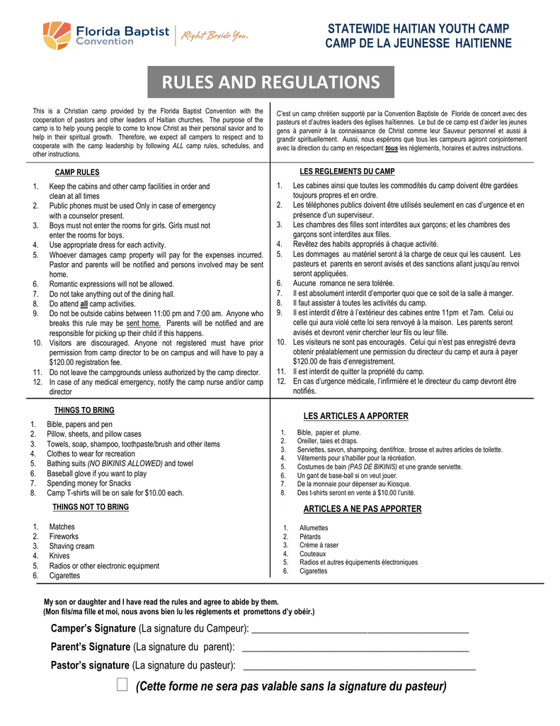 STATEWIDE HAITIAN YOUTH CAMP CAMP DE LA JEUNESSE HAITIENNE RULES AND REGULATIONS This is a Christian camp provided by the Florida Baptist Convention with the cooperation of pastors and other leaders of Haitian churches. The purpose of the camp is to help young people to come to know Christ as their personal savior and to help in their spiritual growth. Therefore, we expect all campers to respect and to cooperate with the camp leadership by following ALL camp rules, schedules, and other instructions. C’est un camp chrétien supporté par la Convention Baptiste de Floride de concert avec des pasteurs et d’autres leaders des églises haïtiennes. Le but de ce camp est d’aider les jeunes gens à parvenir à la connaissance de Christ comme leur Sauveur personnel et aussi à grandir spirituellement. Aussi, nous espérons que tous les campeurs agiront conjointement avec la direction du camp en respectant tous les règlements, horaires et autres instructions. LES REGLEMENTS DU CAMP CAMP RULES 1. Keep the cabins and other camp facilities in order and clean at all times 2. Public phones must be used Only in case of emergency with a counselor present. 3. Boys must not enter the rooms for girls. Girls must not enter the rooms for boys. 4. Use appropriate dress for each activity. 5. Whoever damages camp property will pay for the expenses incurred. Pastor and parents will be notified and persons involved may be sent home. 6. Romantic expressions will not be allowed. 7. Do not take anything out of the dining hall. 8. Do attend all camp activities. 9. Do not be outside cabins between 11:00 pm and 7:00 am. Anyone who breaks this rule may be sent home. Parents will be notified and are responsible for picking up their child if this happens. 10. Visitors are discouraged. Anyone not registered must have prior permission from camp director to be on campus and will have to pay a $120.00 registration fee. 11. Do not leave the campgrounds unless authorized by the camp director. 12. In case of any medical emergency, notify the camp nurse and/or camp director 1. Les cabines ainsi que toutes les commodités du camp doivent être gardées toujours propres et en ordre. 2. Les téléphones publics doivent être utilisés seulement en cas d’urgence et en présence d’un superviseur. 3. Les chambres des filles sont interdites aux garçons; et les chambres des garçons sont interdites aux filles. 4. Revêtez des habits appropriés á chaque activité. 5. Les dommages au matériel seront á la charge de ceux qui les causent. Les pasteurs et parents en seront avisés et des sanctions allant jusqu’au renvoi seront appliquées. 6. Aucune romance ne sera tolérée. 7. Il est absolument interdit d’emporter quoi que ce soit de la salle á manger. 8. Il faut assister à toutes les activités du camp. 9. Il est interdit d’être à l’extérieur des cabines entre 11pm et 7am. Celui ou celle qui aura violé cette loi sera renvoyé à la maison. Les parents seront avisés et devront venir chercher leur fils ou leur fille. 10. Les visiteurs ne sont pas encouragés. Celui qui n’est pas enregistré devra obtenir préalablement une permission du directeur du camp et aura à payer $120.00 de frais d’enregistrement. 11. Il est interdit de quitter la propriété du camp. 12. En cas d’urgence médicale, l’infirmière et le directeur du camp devront être notifiés. THINGS TO BRING 1. 2. 3. 4. 5. 6. 7. 8. Bible, papers and pen Pillow, sheets, and pillow cases Towels, soap, shampoo, toothpaste/brush and other items Clothes to wear for recreation Bathing suits (NO BIKINIS ALLOWED) and towel Baseball glove if you want to play Spending money for Snacks Camp T-shirts will be on sale for $10.00 each. LES ARTICLES A APPORTER 1. 2. 3. 4. 5. 6. 7. 8. THINGS NOT TO BRING 1. 2. 3. 4. 5. 6. Bible, papier et plume. Oreiller, taies et draps. Serviettes, savon, shampoing, dentifrice, brosse et autres articles de toilette. Vêtements pour s’habiller pour la récréation. Costumes de bain (PAS DE BIKINIS) et une grande serviette. Un gant de base-ball si on veut jouer. De la monnaie pour dépenser au Kiosque. Des t-shirts seront en vente à $10.00 l’unité. ARTICLES A NE PAS APPORTER Matches Fireworks Shaving cream Knives Radios or other electronic equipment Cigarettes 1. 2. 3. 4. 5. 6. Allumettes Pétards Crème à raser Couteaux Radios et autres équipements électroniques Cigarettes My son or daughter and I have read the rules and agree to abide by them. (Mon fils/ma fille et moi, nous avons bien lu les règlements et promettons d’y obéir.) Camper’s Signature (La signature du Campeur): ___________________________________________ Parent’s Signature (La signature du parent): _____________________________________________ Pastor’s signature (La signature du pasteur): ______________________________________________ (Cette forme ne sera pas valable sans la signature du pasteur) MEDICAL INFORMATION FORM LAKE YALE HAITIAN YOUTH CAMP July 1 - 4, 2016. Lake Yale Baptist Conference Center To be completed by parent or guardian. This form must be completed properly, signed and send to: Florida Baptist Convention | 140 East 7th Street, Hialeah, FL 33010 CAMPER’S PERSONAL INFORMATION NAME last first ADDRESS city state zip code TEL. (_______)____________________ BIRTH DATE______-______-______ AGE_______SEX PARENT OR GUARDIAN ________________________________________TEL_(_____) In Emergency Notify _____________________________________________ TEL (_____) _______ CAMPER’S CHURCH INFORMATION Church’s name: Address: Church’s phone: (_____) Pastor’s name: CAMPER’S HEALTH RELEASE FORM My son/daughter __________________________________________________has my permission to engage in all of the camp activities. If a medical emergency should arise while my child is at camp, I hereby give permission to the camp director to select a physician and/or hospital for my child’s care. I hereby also give the hospital my permission for hospital