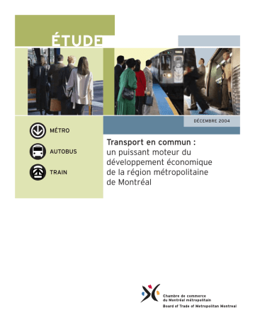 ÉTUDE DÉCEMBRE 2004 MÉTRO AUTOBUS TRAIN Transport en commun : un puissant moteur du développement économique de la région métropolitaine de Montréal 1 TABLE des matières Sommaire . . . . . . . . . . . . . . . . . . . . . . . . . . . . . . . . . . . . . . . . . . . . . . . . . . . . . . . . . . . . . . . . . . . . . . . . . . . . . . . . . . . . . . . . . . . . . . . . . . . . . . . . . . .2 Étude réalisée en collaboration avec : Contexte et limites de l’analyse 1. 5 ....................................................................... Le transport en commun et le développement économique des régions métropolitaines . . . . . . . . . . . . . . . . . . . . . . . . . . . . . . . . . . . . . . . . . . . . . . . . . . . . . . . . . . . . . . . . . . . . . . .7 L’importance des régions métropolitaines . . . . . . . . . . . . . . . . . . . . . . . . . . . . . . . . . . . . . . . . . . . . . . . . . . . .7 Les facteurs de développement des régions métropolitaines ..................... 8 L’apport du transport dans le développement économique des régions . . . . .9 La contribution spécifique du transport en commun ................................. 10 2. Le transport en commun dans la région de Montréal et les activités économiques qu’il génère . . . . . . . . . . . . . . . . . . . . . . . . . . . . . . . . . . . . . . . . . . . . . . . . . . . . .15 Un bref portrait socioéconomique de la région de Montréal . . . . . . . . . . . . . . . . . . . . . .15 Les déplacements dans la région de Montréal . . . . . . . . . . . . . . . . . . . . . . . . . . . . . . . . . . . . . . . . . . . .16 L’envergure des activités des organismes de transport en commun . . . . . . . . . .19 L’impact économique des activités des organismes de transport en commun . . . . . . . . . . . . . . . . . . . . . . . . . . . . . . . . . . . . . . . . . . . . . . . . . . . . . . . . . . . . . . . . . . . . . . . . . . . . . . . . . .21 La comparaison des impacts économiques des dépenses de transport .... 23 3. Le transport en commun dans la région de Montréal et les bénéfices économiques qu’il génère . . . . . . . . . . . . . . . . . . . . . . . . . . . . . . . . . . . . . . . . . . . . . . . . . .25 La réduction des coûts de transport et ses effets sur les revenus des ménages montréalais . . . . . . . . . . . . . . . . . . . . . . . . . . . . . . . . . . . . . . . . . . . . . . . . . . . . . . . .25 L’augmentation de la facilité des déplacements et ses effets sur le développement de secteurs industriels clés pour la région de Montréal . . . . . . . . . . . . . . . . . . . . . . . . . . . . . . . . . . . . . . . . . . . . . . . . . . . . . . . . . . . . . . . . . . . . . . . . . . . . . . . . . .27 L’accroissement de la rapidité des déplacements et ses effets sur la diminution de la congestion de la région montréalaise . . . . . . . . . . . . . . . . . . . .31 L’atténuation des effets néfastes du transport et ses effets sur l’amélioration de la qualité de vie de la région montréalaise .............. 32 Les bénéfices économiques résultant d’un accroissement de 2 % de la part modale du transport en commun dans la région de Montréal . . . . . . . . . . . . . . . . . . . . . . . . . . . . . . . . . . . . . . . . . . . . . . . . . . . . . . . . . . . . . . . . . . . . . . . . . . . . . . . . . . . . . . . . . . . . . . . . .33 4. Conclusion . . . . . . . . . . . . . . . . . . . . . . . . . . . . . . . . . . . . . . . . . . . . . . . . . . . . . . . . . . . . . . . . . . . . . . . . . . . . . . . . . . . . . . . . . . . . . . . . . .35 2 SOMMAIRE Pourquoi s’intéresser à la contribution économique du transport en commun ? > La compétitivité et le pouvoir d’attraction des régions métropolitaines constituent des conditions essentielles de la prospérité des sociétés avancées, d’où l’importance que la plupart des pays industrialisés accordent à la santé économique de leurs grandes villes ou régions. Le transport en commun joue un rôle prépondérant dans le développement économique et la compétitivité des régions métropolitaines > Pouvoir compter sur des régions métropolitaines compétitives et attirantes représente toutefois un défi continu et exige d’agir avec diligence sur plusieurs facteurs clés de création de richesse. Or, la présence d’infrastructures de transport performantes, notamment en transport en commun, constitue l’un de ces facteurs clés. > Le transport en commun engendre des bénéfices économiques complexes et très importants. Le transport en commun réduit ainsi le coût unitaire des déplacements de ses utilisateurs, augmente la rapidité de déplacement des non-utilisateurs, accroît le bassin des travailleurs et consommateurs des entreprises et atténue les effets néfastes des déplacements. > Les acteurs de plusieurs des régions parmi les plus dynamiques sur le plan économique ont d’ailleurs bien compris les avantages spécifiques de ce système de transport. Des régions comme celles de Barcelone, Lyon, Montpellier et Strasbourg ont placé le transport en commun parmi leurs priorités régionales. Les régions considérées comme les plus compétitives aux États-Unis se retrouvent généralement dans la situation suivante : soit i) elles disposent déjà d’un bon niveau de service de transport, soit ii) elles ont le plus investi dans leur réseau de transport en commun ces dernières années. > Pour ces régions, le transport en commun est considéré comme un investissement dans leurs capacités productives et leur pouvoir d’attraction. Il permet de concilier croissance économique forte et qualité de vie. Les activités des organismes de transport en commun de la région de Montréal soutenaient 12 845 emplois en 2003 et contribuaient à augmenter les revenus de l’économie montréalaise de près de 1 milliard $ Quelles sont les retombées économiques des ac