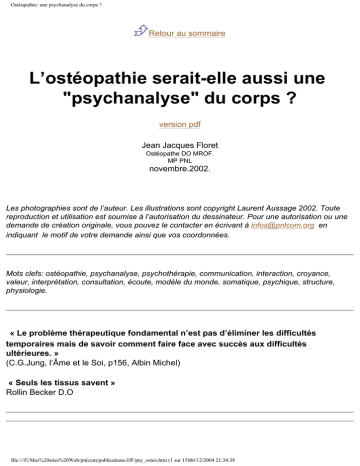Ostéopathie: une psychanalyse du corps ? Retour au sommaire L’ostéopathie serait-elle aussi une "psychanalyse" du corps ? version pdf Jean Jacques Floret Ostéopathe DO MROF. MP PNL novembre.2002. Les photographies sont de l’auteur. Les illustrations sont copyright Laurent Aussage 2002. Toute reproduction et utilisation est soumise à l’autorisation du dessinateur. Pour une autorisation ou une demande de création originale, vous pouvez le contacter en écrivant à [email protected] en indiquant le motif de votre demande ainsi que vos coordonnées. Mots clefs: ostéopathie, psychanalyse, psychothérapie, communication, interaction, croyance, valeur, interprétation, consultation, écoute, modèle du monde, somatique, psychique, structure, physiologie. « Le problème thérapeutique fondamental n’est pas d’éliminer les difficultés temporaires mais de savoir comment faire face avec succès aux difficultés ultérieures. » (C.G.Jung, l’Âme et le Soi, p156, Albin Michel) « Seuls les tissus savent » Rollin Becker D.O file:///F|/Mes%20sites%20Web/pnlcom/publications/JJF/psy_osteo.htm (1 sur 15)06/12/2004 21:34:38 Ostéopathie: une psychanalyse du corps ? Résumé C’est en prenant en compte le patient en lui même que l’ostéopathie apporte une solution durable aux maux apportés en consultation. En libérant des restrictions de mobilité tissulaire le traitement ostéopathique soulage, peut contribuer à ouvrir des voies de guérison et contribue à la révélation de causes plus profondes reposant sur des croyances et des valeurs alimentées par la perception que le patient a du monde. Cette perception du monde repose sur la qualité des informations recueillies et l’interprétation qui en est donnée à travers nos filtres personnels. Cette interprétation est marquée par la liberté tissulaire du patient et de ses états internes. Au delà de l’action somatique, l’ostéopathe par son action manuelle autant que par la qualité de ses interactions offre au patient l’opportunité de trouver encore plus d’adaptabilité et de qualité d’être. En ce sens l’ostéopathie est peut être qualifiable de psychanalyse du corps. Avertissement : Robert Dantzer nous rappelle que les croyances initiales peuvent entraîner des corrélations illusoires. On trouve des relations alors qu’elle n’existent pas, car elles correspondent à l’idée qu’on s’en fait. C’est un garde-fou qu’il faut conserver constamment présent à l’esprit dès que l’on ne parle plus « de chiffre », dès que l’on ne parle plus d’équations telles que 1 +1=2. Au-delà des mots employés je veux rester pratique, proche de la réalité d’un exercice où ce qui demeure est liée à la qualité d’une palpation et d’une communication, avec les essais et erreurs que cela comporte et où tout ce qui change et doit évoluer concerne les concepts, essentiellement les théories , les systèmes que l’on peut bâtir à partir de ces faits pratiques… Ce que vous ne trouverez pas dans cet article : Vous ne trouverez pas de justifications scientifiques (par expérimentation ou analyse de la littérature scientifique) au sens rigoureux du terme. Ce sera l’objet d’une publication ultérieure. Milton Erickson à dit « a truth is a truth when it works » (une vérité est une vérité si elle marche). Les concepts qui découlent d'une pratique sont somme toute secondaires et seront de toute file:///F|/Mes%20sites%20Web/pnlcom/publications/JJF/psy_osteo.htm (2 sur 15)06/12/2004 21:34:38 Ostéopathie: une psychanalyse du corps ? façon validés ou modifiés par d’autres dont le savoir et la démarche est pleinement scientifique. Je vous propose de faire comme si. Comme si ce que je propose est vrai et d’abord de chercher dans votre propre savoir ce qui peut aller dans le même sens, enrichir ce qui est ici écrit et offert. Puis, et seulement ensuite, prendre note de ce qui ne ‘colle’ pas avec vos connaissances vérifiées en gardant à l’esprit qu’il s’agit d’abord de pratique et que ce qui peut être dit ‘ne pas coller’ relève uniquement de l’explication et de la théorie, toutes choses qui sont faites pour naître, évoluer, changer, voire mourir pour renaître autrement. Si vous avez cru que les petits hommes qui s’agitent dans le poste de télévision étaient vraiment dans le poste, lorsque vous avez compris que ce n’était pas vrai, la télévision a quand même continué à fonctionner. Ce type de sujet est de ceux qui "confusent" et prêtent à controverse. Il convient de ne pas être dupe ni des mots ni des concepts qui ne sont que l’illustration du savoir d’un moment et d’un homme, quel que soit cet homme et son savoir. Pour illustrer la complexité de cette problématique multifactorielle je vous renvoie à trois ouvrages et quelques autres : L’illusion psychosomatique, de Robert Dantzer, éditeur Odile Jacob. Psychobiologie de la guérison, de Ernest Lawrence Rossi, éditeur le souffle d’or. La force de guérir, de Édouard Zarifian, éditions Odile Jacobs. La plupart des ouvrages traitant de P.N.L. , à titre d’exemple : ceux de Robert Dilts, de Josiane de Saint-Paul. Aux ouvrages du psychiatre Milton Erikson. Les ouvrages de Carl Gustav Jung, de Freud, de Grodeck… Ce que je commence à développer dans cet article: Les personnes en présence dans le cadre d'une consultation ostéopathique sont des êtres humains qui ont chacun leur propre système de référence et de compréhension de la vie en général et de ce qu'ils sont en particulier. La communication qui s'établit entre ces personnes fait partie intégrante de chaque consultation. Le traitement manuel, dont il n'est que très peu question dans cet écrit, agit comme un possible révélateur par la libération somatique qui se met en place. Je me dois donc pour débuter, d'indiquer quelles sont quelques unes de mes valeurs présentes et de ce qu'elles impliquent dans 