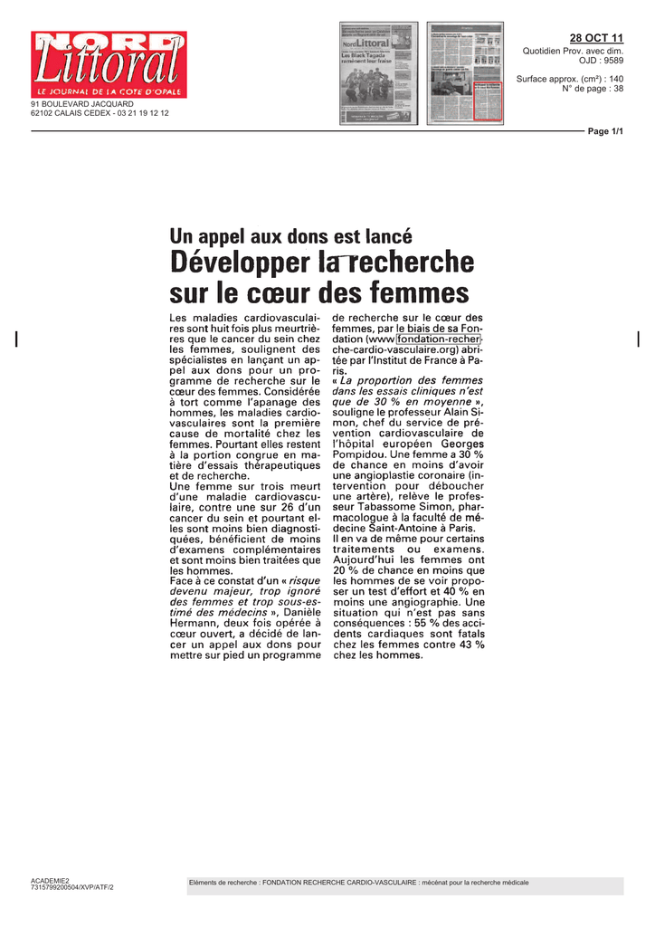 28 OCT 11 Quotidien Prov. avec dim. OJD : 9589 Surface approx. (cm²) : 140 N° de page : 38 91 BOULEVARD JACQUARD 62102 CALAIS CEDEX - 03 21 19 12 12 Page 1/1 Un appel aux dons est lancé Développer la recherche sur le cœur des femmes Les maladies cardiovasculaires sont huit fois plus meurtrières que le cancer du sein chez les femmes, soulignent des spécialistes en lançant un appel aux dons pour un programme de recherche sur le cœur des femmes. Considérée à tort comme l'apanage des hommes, les maladies cardiovasculaires sont la première cause de mortalité chez les femmes. Pourtant elles restent à la portion congrue en matière d'essais thérapeutiques et de recherche. Une femme sur trois meurt d'une maladie cardiovasculaire, contre une sur 26 d'un cancer du sein et pourtant elles sont moins bien diagnostiquées, bénéficient de moins d'examens complémentaires et sont moins bien traitées que les hommes. Face à ce constat d'un « risque devenu majeur, trop ignoré des femmes et trop sous-estime des médecins », Danièle Hermann, deux fois opérée à coeur ouvert, a décidé de lancer un appel aux dons pour mettre sur pied un programme ACADEMIE2 7315799200504/XVP/ATF/2 de recherche sur le cœur des femmes, par le biais de sa Fondation (www.fondation-recherche-cardio-vasculaire.org) abritée par l'Institut de France à Paris. « La proportion des femmes dans les essais cliniques n'est que de 30 % en moyenne », souligne le professeur Alain Simon, chef du service de prévention cardiovasculaire de l'hôpital européen Georges Pompidou. Une femme a 30 % de chance en moins d'avoir une angioplastie coronaire (intervention pour déboucher une artère), relève le professeur Tabasspme Simon, pharmacologue à la faculté cle médecine Saint-Antoine à Paris. Il en va de même pour certains traitements ou examens. Aujourd'hui les femmes ont 20 % de chance en moins que les hommes de se voir proposer un test d'effort et 40 % en moins une angiographie. Une situation qui n'est pas sans conséquences : 55 % des accidents cardiaques sont fatals chez les femmes contre 43 % chez les hommes. Eléments de recherche : FONDATION RECHERCHE CARDIO-VASCULAIRE : mécénat pour la recherche médicale 28 OCT 11 Quotidien Prov. avec dim. OJD : 131895 3 RUE SAINT ELOY 57140 WOIPPY - 03 87 34 17 89 Surface approx. (cm²) : 91 Page 1/1 IG Surveiller le cœur des femmes Les maladies cardiovasculaires sont huit fois plus meurtrières que le cancer du sein chez les femmes, soulignent des spécialistes. Considérées a tort comme l'apanage des hommes, les maladies cardiovasculaires sont la première cause de mortalité chez les femmes Pourtant elles restent a la portion congrue en matière d'essais thérapeutiques et de recherche Une femme sur trois meurt d'une maladie cardiovasculaire, contre une sur 26 d'un cancer du sein et pourtant elles sont moins bien diagnostiquées, bénéficient de moins d'examens complémentaires et sont moins bien traitées que les hommes, ont explique des spécialistes Face a ce constat d'un « nsque devenu majeur, trop ignore des femmes et trop sous-estime des médecins », Damele Hermann, deux fois opérée a cœur ouvert, a décide de lancer un appel aux dons pour mettre sur pied un programme de recherche sur le cœur des femmes, par le biais de sa Fondation (\v\v\\ fondation-recherche-cardio-vasculaire o rg) abritée par l'Institut de France a Paris « La proportion des femmes dans les essais cliniques n'est que de 30 % en moyenne », souligne le professeur Alain Simon, chef du service de prévention cardiovasculaire de l'hôpital européen Georges Pompidou Une femme a 30 % de chance en moins d'avoir une angioplastie coronaire (intervention pour déboucher une artère), relevé le professeur Tabassome Simon, pharmacologue a la faculté de médecine Saint-Antoine a Pans Aujourd'hui les femmes ont 20 % de chance en moins que les hommes de se voir proposer un test d'effort et 40 % en moins une angiographie Une situation qui n'est pas sans conséquences 467A55FC57600007723243D4BE09252B31A0A91C912A18B87B1C851 ACADEMIE2 7897599200507/XNR/FCF/2 Eléments de recherche : FONDATION RECHERCHE CARDIO-VASCULAIRE : mécénat pour la recherche médicale 30 OCT 11 Quotidien Prov. avec dim. Surface approx. (cm²) : 55 9 RUE GAMBETTA 50104 CHERBOURG CEDEX - 02 33 97 16 16 Page 1/1 • Appel pour développer la recherche sur le cœur et les artères des femmes PARIS. - Les maladies cardiovasculaires sont huit fois plus meurtrières que le cancer du sein chez les femmes, soulignent des spécialistes en lançant un appel aux dons pour un programme de recherche sur le cœur des femmes Considérée à tort comme l'apanage des hommes, les maladies cardiovasculaires sont la première cause de mortalité chez les femmes. Pourtant elles restent à la portion congrue en matière d'essais thérapeutiques et de recherche. Une femme sur trois meurt d'une maladie cardiovasculaire, contre une sur 26 d'un cancer du sein et pourtant elles sont moins bien diagnostiquées, bénéficient de moins d'examens complémentaires et sont moins bien traitées que les hommes, ont expliqué ces spécialistes. Danièle Hermann, deux fois opérée à cœur ouvert, a décidé de lancer un appel aux dons pour mettre sur pied un programme de recherche sur le cœur des femmes, par le biais de sa Fondation (www.fondation-recherchecardio-vasculaire.org) abritée par l'Institut de France à Paris. Un premier projet d'exploration des artères de 500 femmes et de biomarqueurs de risque nécessitera 100000 euros/an pendant cinq ans pour pouvoir être lancé. A terme, une telle étude nécessitera de l'ordre de cinq millions d'euros. ACADEMIE2 8682000300506/GCP/MSL/2 Eléments de recherche : - INSTITUT DE FRANCE : réseau des cinq académies scientifiques et artistiques françaises - BIBLIOTHEQUE DE L'INSTITUT : conserve des fonds scientifique et patrimonial, à Paris 6ème 31 OCT 11 Quotidien Prov. avec dim. OJD : 95667 18 RUE DE TH