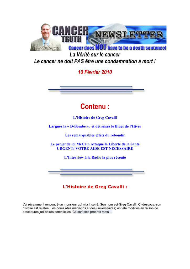 La Vérité sur le cancer Le cancer ne doit PAS être une condamnation à mort ! 10 Février 2010 Contenu : L’Histoire de Greg Cavalli Larguez la « D-Bombe », et détruisez le Blues de l’Hiver Les remarquables effets du rebondir Le projet de loi McCain Attaque la Liberté de la Santé URGENT: VOTRE AIDE EST NECESSAIRE L’Interview à la Radio la plus récente L’Histoire de Greg Cavalli : J'ai récemment rencontré un monsieur qui m'a inspiré. Son nom est Greg Cavalli. Ci-dessous, son histoire est relatée. Les noms (des médecins et des universitaires) ont été modifiés en raison de procédures judiciaires potentielles. Ce sont ses propres mots ... Mon nom est Gregory Cavalli. Autour du 15 Octobre, j’ai été diagnostiqué d'un cancer épidermoïde par un spécialiste local. Après examen, le Dr Smith a indiqué de combien la croissance était, voulant même me faire un devis sur la zone de la croissance. Il a immédiatement eu envie de faire une biopsie, sur laquelle j'ai fait valoir mon acceptation. Elle est revenue positive. J'ai décidé d'obtenir un deuxième avis auprès d'une organisation plus importante. J'ai appelé le directeur général et chef du personnel de l’USA Université, le Dr Jones, et ai mis en place un rendez-vous avec lui. Je l'ai rencontré, lui et son personnel, au début, et il a déclaré à l'origine, après un examen au microscope et un examen borascopique, que la croissance était très faible et pourrait être traitée uniquement avec des rayonnements minimes. Peu de temps après qu'un autre médecin (Dr Reed) entra pour m’examiner et me parler. Il avait une approche très différente, qui était une chirurgie de 16 heures, qui consistait à couper la tumeur, avec un fractionnement de la mâchoire, les graphiques de la peau, et certains ré-attachements simples des nerfs. Il m'a dit que si je ne subissais pas d'intervention chirurgicale, alors, je n’avais plus que peu de temps à vivre. A cette heure de la consultation, le Dr Reed a déclaré que ce type de cancer est curable et qu'ils seraient en mesure d'enlever la tumeur sans aucun problème et je serais alors capable de vivre ma vie comme beaucoup d'autres de ses patients. Selon lui, la plus douloureuse et la plus mauvaise partie du processus serait le graphisme de la peau, mais qui ne serait pas vraiment douloureux. En plus de cela, il a dit que je ne serais à l'hôpital que pendant environ une semaine et après que je pourrai rentrer à la maison et récupérer très bien. Comme vous pouvez le voir sur la photo à gauche, j'étais très actif et en très bonne forme physique. Sous les auspices qu'ils ne feraient que supprimer une "très petite" partie de ma langue et que le temps de récupération serait minime, je leur permis d’opérer sur moi. Ils n'ont eu mon IRM ou Scanner que quelques heures avant la chirurgie, ce qui m'avait intéressé. Si ce n'était pas pour mes efforts et ma constante pression, ils ne les ont jamais reçus ou ont-ils eu la chance de les examiner ? Puis, j'ai été emmené à la salle d'opération. Êtes-vous prêt pour cela ? Sans que je sache ou y consente, au cours de la chirurgie, ils ont enlevé plus de 80% de ma langue, ont coupé et ouvert mon cou, mes avant-bras, et ont endommagé ma jambe. Ni le Dr Reed ni le Dr Jones n’ont jamais dit que ma faculté de parler et ma capacité de manger ne seraient plus les mêmes, sans parler du fait de la presque complète disparition de la première. Quand j'ai demandé à M. Reed pourquoi il n'a jamais divulgué le fait que je perdrais ma langue entière et que je ne serais plus jamais capable de manger ou d’avoir de goût, ou de parler à nouveau normalement, sa réponse fut : «Je suis désolé, M. Cavalli, si je ne vous ai pas informé de ces facteurs.» Je trouve cela inacceptable et inexcusable ! Comme conséquence directe de cette chirurgie, à laquelle je n'étais PAS .... Consentant : • Je ne serai plus jamais capable de mâcher ou de mordre dans tout type d'aliment. • Je ne pourrai plus jamais avoir le goût des aliments. • Je ne serai plus jamais capable de parler ou de chanter à mes enfants. Vous ne pouvez pas être sûr de ne jamais être capable de manger ou de parler à nouveau. Ils m'ont promis qu'ils ne supprimeraient pas les muscles de mon cou. Ce fut l'une des raisons pour lesquelles j'ai demandé un deuxième avis, qui était de ne pas enlever les muscles de mon cou. Sur l'auto-examen, j'ai découvert qu'ils avaient en effet supprimé les muscles de mon cou. J'étais en état de choc total, car ils disaient qu'ils ne le feraient pas. Regardez l'image à gauche qui a été prise juste après la chirurgie et vous pouvez voir clairement l'incision dans le cou. J'avais l'habitude d'être un grand orateur et gagnais ma vie en communiquant avec les gens. J'ai 2 beaux enfants en bas âge et un autre sur le chemin. Pour dire le moins, j'ai beaucoup pleuré à la maison avec ma famille. En plus de cela je ne serai plus jamais en mesure de donner des leçons ou de parler de mon domaine d'expertise, qui est l'archéologie, la science et la recherche. Je suis très préoccupé. Mais j'essaie de garder une attitude très positive et suis prêt à travailler très dur et à faire ce qu'il faut pour surmonter cette catastrophe médicale. Je n'aurais jamais accepté la chirurgie si on m'avait dit que je perdrais ma capacité à manger et à parler. Je sais que j’aurais pu profiter de nombreuses autres procédures. Ils ont fait une grosse affaire en me disant qu’ils guérissaient et effectuaient cette opération sur toutes les célébrités et politiciens à Beverly Hills et à travers le pays. Quand je regarde en arrière, je me sens comme s’ils avaient vraiment essayé de me «vendre» la chirurgie, ce qui est très très cher. Je me sens comme s’ils avaient complètement profité de moi à travers LA DIVULGATION DES EFFETS DE LA CHIRURGIE ET DES PROCÉDURES, AFIN DE REMPLIR LA NÉGLIG
