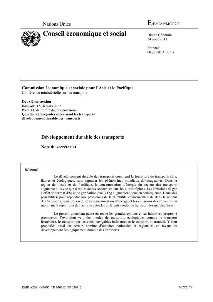 Nations Unies Conseil économique et social E/ESCAP/MCT.2/7 Distr.: Générale 24 août 2011 Français Original: Anglais Commission économique et sociale pour l’Asie et le Pacifique Conférence ministérielle sur les transports Deuxième session Bangkok, 12-16 mars 2012 Point 3 f) de l’ordre du jour provisoire Questions émergentes concernant les transports: développement durable des transports Développement durable des transports Note du secrétariat Résumé Le développement durable des transports comprend la fourniture de transports sûrs, fiables et écologiques, sans aggraver les phénomènes mondiaux dommageables. Dans la région de l’Asie et du Pacifique, la consommation d’énergie du secteur des transports augmente plus vite que dans les autres secteurs et dans les autres régions. Les émissions de gaz à effet de serre (GES) et de gaz carbonique (CO2) augmentent donc en conséquence. L’une des possibilités, pour répondre aux problèmes de la durabilité environnementale dans le secteur des transports, consiste à réduire la consommation d’énergie et les émissions des véhicules en modifiant la répartition de l’activité entre les différents modes de transport des marchandises. Le présent document passe en revue les grandes options et les initiatives propres à promouvoir l’évolution vers des modes de transports écologiques comme le transport ferroviaire, le transport par les voies navigables intérieures et le transport intermodal. Y sont proposées aussi un certain nombre d’activités nationales et régionales en faveur du développement écologiquement durable des transports. DMR A2011-000397 TR 020312 TP 020312 MCT2_7F E/ESCAP/MCT.2/7 Table des matières Page I. Introduction............................................................................................................ 2 II. Consommation d’énergie et émissions dans le secteur des transports ................... 3 III. IV. A. Utilisation d’énergie..................................................................................... 3 B. Émissions ..................................................................................................... 5 C. Part des différents modes dans le transport des marchandises ..................... 7 Options et initiatives de portée générale pour promouvoir une redistribution entre les modes de transport des marchandises.................................................... 11 A. Développement des ports secs et des centres logistiques........................... 12 B. Changement de mode de transport au profit du rail ................................... 13 C. Utilisation des voies navigables intérieures et du cabotage ....................... 15 Questions à examiner ........................................................................................... 15 Figures I. 1. Consommation d’énergie par secteur (en Asie et dans le Pacifique), 2008.............................................................................................................. 4 2. Consommation d’énergie par le secteur des transports, 2008 ...................... 4 3. Émissions mondiales de gaz à effet de serre par secteur ............................. 5 4. Émissions de gaz carbonique par secteur en Asie et dans le Pacifique, 2008.............................................................................................................. 6 5. Part des transports dans les émissions, par mode, 2008 ............................... 6 6. Répartition modale du transport des marchandises dans quelques pays ...... 8 7. Intensité énergétique des différents modes de transport ............................ 10 Introduction 1. Le développement durable des transports comprend la fourniture de transports sûrs, fiables et écologiques, sans aggraver les phénomènes mondiaux dommageables. Il y a trois aspects principaux à prendre en considération pour assurer la durabilité d’un système de transport. Le premier est le développement social, l’objectif étant de fournir un accès sûr et bon marché et de favoriser la réalisation des Objectifs du Millénaire pour le développement (OMD). Le second est la protection de l’environnement: il s’agit ici principalement de préserver l’écosystème et d’optimiser les ressources. Le troisième est le développement économique, qui suppose de prendre en considération l’efficience, l’efficacité et la durabilité financière du système de transport. 2. Le présent document se concentre sur la durabilité environnementale car les questions concernant la durabilité économique et sociale font l’objet d’autres documents soumis à la Réunion. Cependant, les trois aspects susmentionnés de la durabilité se complètent et toute intervention en faveur de l’un peut donc avoir une incidence sur les deux autres. 2 E/ESCAP/MCT.2/7 3. La durabilité environnementale des systèmes de transport est une question sans cesse plus importante étant donné qu’il est nécessaire d’optimiser l’utilisation des ressources énergétiques raréfiées et de réduire les émissions. 4. Le secteur des transports est le troisième consommateur d’énergie et le principal consommateur de produits pétroliers dans la région de la CESAP. L’augmentation de la consommation d’énergie y est plus rapide que dans les autres secteurs 1 et dans les autres régions, sous l’effet d’un accroissement rapide de la motorisation et d’une demande de transport soutenue aux fins du développement économique. Dans le secteur des transports de la région Asie-Pacifique, les transports routiers consomment environ 80 % des produits pétroliers, alors que la part du rail atteint juste 2 %. Or il est indéniable que la route est le mode de transport préféré en Asie, pour les voyageurs comme pour les marchandises. 5. En même temps, le secteur des transports est la source principale de la pollution atmosphérique et l’un des p