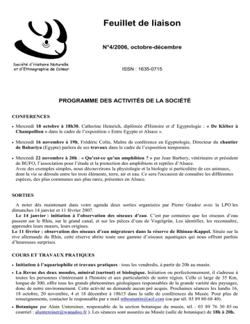 Feuillet de liaison N°4/2006, octobre-décembre ISSN : 1635-0715 PROGRAMME DES ACTIVITÉS DE LA SOCIÉTÉ CONFERENCES Mercredi 18 octobre à 18h30, Catherine Heinrich, diplômée d'Histoire et d' Egyptologie : « De Kléber à Champollion » dans le cadre de l’exposition « Entre Egypte et Alsace ». Mercredi 16 novembre à 19h, Frédéric Colin, Maître de conférence en Egyptologie, Directeur du chantier de Bahariya (Egypte) parlera de ses travaux dans le cadre de l’exposition temporaire. Mercredi 22 novembre à 20h : « Qu’est-ce qu’un amphibien ? » par Jean Barbery, vétérinaire et président de BUFO, l’association pour l’étude et la protection des amphibiens et reptiles d’Alsace. Avec des exemples simples, nous découvrirons la physiologie et la biologie si particulière de ces animaux, dont la vie se déroule entre les trois éléments, terre, air et eau. Ce sera l'occasion de connaître les différentes espèces, des plus communes aux plus rares, présentes en Alsace. SORTIES A noter dès maintenant dans votre agenda deux sorties organisées par Pierre Gradoz avec la LPO les dimanches 14 janvier et 11 février 2007. Le 14 janvier : initiation à l’observation des oiseaux d’eau. C’est par centaines que les oiseaux d’eau passent sur le Rhin, sur le grand canal, et sur les pièces d’eau de Vogelgrün. Les identifier, les reconnaître, apprendre leurs mœurs, leurs origines. Le 11 février : observation des oiseaux d’eau migrateurs dans la réserve de Rhinau-Kappel. Située sur la rive allemande du Rhin, cette réserve abrite toute une gamme d’oiseaux aquatiques qui nous offrent parfois d’heureuses surprises. COURS ET TRAVAUX PRATIQUES Initiation à l’aquariophilie et travaux pratiques : tous les vendredis, à partir de 20h au musée. La Revue des deux mondes, minéral (surtout) et biologique. Initiation ou perfectionnement, il s'adresse à toutes les personnes s'intéressant à l'histoire et aux particularités de notre région. Celle ci large de 35 Km, longue de 300, offre tous les grands phénomènes géologiques responsables de la grande variété des paysages, donc de notre environnement. Cette activité ne demande aucun pré acquis. Prochaines séances les lundis 16, 18 octobre, 20 novembre, 4 et 18 décembre à 18h15 dans la salle de conférences du Musée. Pour plus de renseignements, contacter le responsable par e mail [email protected] (ou par tél. 03 89 80 68 40). Botanique par Alain Untereiner, responsable de la section botanique du musée, tél. : 03 89 76 30 85 ou courriel : [email protected] ). Les séances sont assurées au Musée (salle de botanique) de 18h à 20h. INFORMATIONS Attention, nouvelles dates de fermeture annuelle du musée : du 22 décembre 2006 au 21 janvier 2007 inclus. N’oubliez pas d’acheter votre Passmusées au muséum afin de bénéficier d’une économie de 12,50 euros en tant que membre, et pour soutenir la SHNE. Le réseau inclue maintenant le Vaisseau et le Bioscope. Nous recherchons dès maintenant des personnes pour : - Le stand du Salon du livre de Colmar les 25 et 26 novembre (Parc des expos) : permanence et vente. - Pour participer à la vie du musée en offrant ses compétences (documentaliste, graphiste, comptable, peinture, couture, bricoleur, etc…) dès novembre 2006. Merci de contacter le secrétariat ou par courriel : [email protected]. VIE DU MUSÉE ANIMATIONS - Reprise des ateliers du mercredi qui se déroulent désormais tous les mercredis avec un thème différent chaque mois. Prochaines dates : Mercredis 18 et 26 octobre, « L’Egypte des explorateurs » permettra aux enfants de venir découvrir l’exposition “Entre Egypte et Alsace” et de jouer aux explorateurs. Mercredis 8, 22 et 29 novembre, « Animaux d’Alsace et leurs milieux naturels », pour partir, à travers différents jeux, à la redécouverte de l’Alsace et de la diversité de ses paysages et animaux typiques, parfois menacés. Décembre : programmation en cours. Les ateliers du mercredi, sont ouverts à tous les curieux de 7 à 11 ans, de 14 h à 17 h. Places limitées à 12 jeunes. Tarifs : 7 € / enfant, la séance (goûter compris) ou 18 € le trimestre. Renseignements et inscription dès maintenant auprès d'Eole Colin (03 89 23 84 15 ou [email protected]). - Ateliers de découverte des hiéroglyphes animés par Catherine Heinrich les jeudis, de 16h30 à 17h30, à partir du 12 octobre et jusqu’au mois de mars, dans la salle de conférences du musée. Il reste encore quelques places. Inscription auprès de l’ALEP. - Nuit autour du cinéma égyptien : « La nuit cairote » le 18 novembre à 19h au cinéma Le Colisée à Colmar, en partenariat avec le Lézard. Projection de deux films récents, « L’immeuble Yacoubian » de Marwan Hamed, (2h40) et « OSS 117 : Le Caire, nid d’espions » avec Jean Dujardin (1h40), entrecoupé d'un buffet oriental concocté par l’association Mouvements d’Elles. Réservation au Lézard : 03 89 41 70 77. Tarif réduit pour les membres de la société à jour de cotisation. - Inauguration d’un calicot de tissu confectionné par la section U.P.I du collège Berlioz de Colmar, avec leur professeur Marie Claire Juillard, le jeudi 19 octobre à 14h dans la cour du musée. Orné de figures d’inspirations égyptiennes, il servira de signalétique pendant la durée de l’exposition temporaire. - Cours de cuisine orientale organisé par Mouvements d’Elles, au Centre Théodore Monod les jeudis soirs, de 19h à 21h, à partir de novembre. Préparation de plats typiques et dégustation avec le groupe (10 personnes maximum). Renseignements et inscription au musée ou [email protected] - Musique et intermèdes théâtraux au musée par les élèves des cours de Harpe et d’Art dramatique de l’Ecole Nationale de Musique et de Théâtre courant décembre sous la houlette de leurs professeurs (Aude Gary et Béatrice Houplain). - Animations pour fêter Noël avec des contes ég