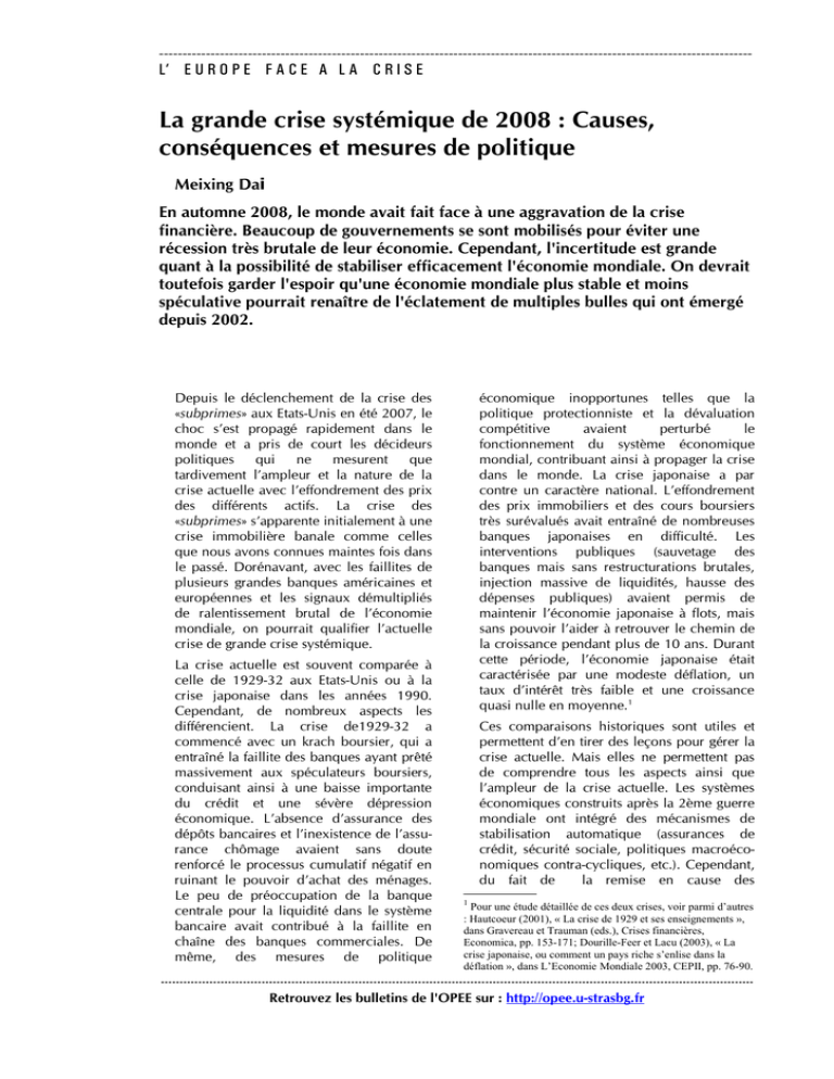 ------------------------------------------------------------------------------------------------------------------------------- L’ E U R O P E F A C E A L A C R I S E La grande crise systémique de 2008 : Causes, conséquences et mesures de politique Meixing Dai En automne 2008, le monde avait fait face à une aggravation de la crise financière. Beaucoup de gouvernements se sont mobilisés pour éviter une récession très brutale de leur économie. Cependant, l'incertitude est grande quant à la possibilité de stabiliser efficacement l'économie mondiale. On devrait toutefois garder l'espoir qu'une économie mondiale plus stable et moins spéculative pourrait renaître de l'éclatement de multiples bulles qui ont émergé depuis 2002. Depuis le déclenchement de la crise des «subprimes» aux Etats-Unis en été 2007, le choc s’est propagé rapidement dans le monde et a pris de court les décideurs politiques qui ne mesurent que tardivement l’ampleur et la nature de la crise actuelle avec l’effondrement des prix des différents actifs. La crise des «subprimes» s’apparente initialement à une crise immobilière banale comme celles que nous avons connues maintes fois dans le passé. Dorénavant, avec les faillites de plusieurs grandes banques américaines et européennes et les signaux démultipliés de ralentissement brutal de l’économie mondiale, on pourrait qualifier l’actuelle crise de grande crise systémique. La crise actuelle est souvent comparée à celle de 1929-32 aux Etats-Unis ou à la crise japonaise dans les années 1990. Cependant, de nombreux aspects les différencient. La crise de1929-32 a commencé avec un krach boursier, qui a entraîné la faillite des banques ayant prêté massivement aux spéculateurs boursiers, conduisant ainsi à une baisse importante du crédit et une sévère dépression économique. L’absence d’assurance des dépôts bancaires et l’inexistence de l’assurance chômage avaient sans doute renforcé le processus cumulatif négatif en ruinant le pouvoir d’achat des ménages. Le peu de préoccupation de la banque centrale pour la liquidité dans le système bancaire avait contribué à la faillite en chaîne des banques commerciales. De même, des mesures de politique économique inopportunes telles que la politique protectionniste et la dévaluation compétitive avaient perturbé le fonctionnement du système économique mondial, contribuant ainsi à propager la crise dans le monde. La crise japonaise a par contre un caractère national. L’effondrement des prix immobiliers et des cours boursiers très surévalués avait entraîné de nombreuses banques japonaises en difficulté. Les interventions publiques (sauvetage des banques mais sans restructurations brutales, injection massive de liquidités, hausse des dépenses publiques) avaient permis de maintenir l’économie japonaise à flots, mais sans pouvoir l’aider à retrouver le chemin de la croissance pendant plus de 10 ans. Durant cette période, l’économie japonaise était caractérisée par une modeste déflation, un taux d’intérêt très faible et une croissance quasi nulle en moyenne.1 Ces comparaisons historiques sont utiles et permettent d’en tirer des leçons pour gérer la crise actuelle. Mais elles ne permettent pas de comprendre tous les aspects ainsi que l’ampleur de la crise actuelle. Les systèmes économiques construits après la 2ème guerre mondiale ont intégré des mécanismes de stabilisation automatique (assurances de crédit, sécurité sociale, politiques macroéconomiques contra-cycliques, etc.). Cependant, du fait de la remise en cause des 1 Pour une étude détaillée de ces deux crises, voir parmi d’autres : Hautcoeur (2001), « La crise de 1929 et ses enseignements », dans Gravereau et Trauman (eds.), Crises financières, Economica, pp. 153-171; Dourille-Feer et Lacu (2003), « La crise japonaise, ou comment un pays riche s’enlise dans la déflation », dans L’Economie Mondiale 2003, CEPII, pp. 76-90. --------------------------------------------------------------------------------------------------------------------------------------------------------------Retrouvez les bulletins de l'OPEE sur : http://opee.u-strasbg.fr ------------------------------------------------------------------------------------------------------------------------------- L’ E U R O P E F A C E A L A C R I S E réglementations financières érigées après la crise des années 1930 et au développement tous azimuts des innovations financières, le risque s’est longuement diffusé et a grandi sans cesse jusqu’à un niveau difficilement supportable pour l’économie mondiale. qui encourage la consommation2, et stimule les constructions nouvelles. Par ailleurs, la baisse du taux d’intérêt rapide et son maintien à un niveau faible ont été aussi un stimulant très puissant pour les investissements des entreprises. Ce mécanisme de stimulation économique a été énormément renforcé par les innovations financières récentes. L’émergence d’une multitude de bulles spéculatives Dans le système économique et financier moderne, les banques jouent un rôle important dans la création de liquidités à côté de la banque centrale. Dans un système bancaire classique, les banques absorbent les dépôts et font des crédits. Les innovations financières introduites depuis les années 1980 ont considérablement bouleversé le paysage du marché des crédits. Le fait que les entreprises puissent accéder facilement au marché financier via les émissions directes de titres a poussé les banquiers à inventer de nouveaux instruments financiers qui leur permettent de diminuer la consommation de fonds propres et d’augmenter la rentabilité du capital. Dans un métier de crédit où la marge a été considérablement réduite par le développement des marchés financiers, les banques ont trouvé le moyen d’augmenter la rentabilité en t