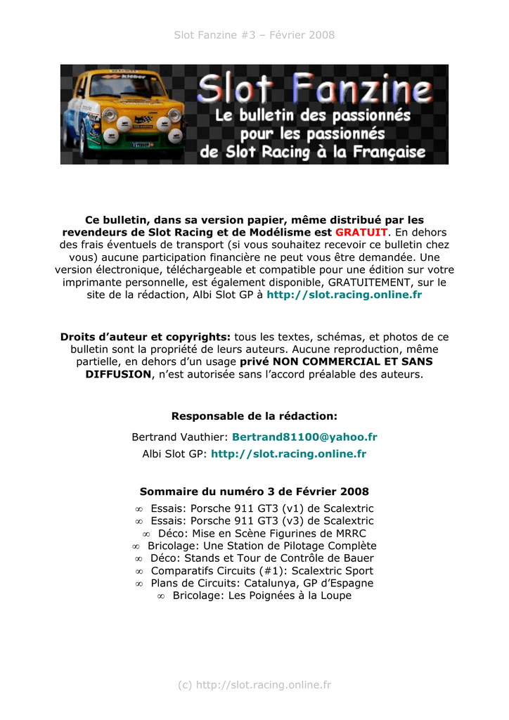 Slot Fanzine #3 – Février 2008 Ce bulletin, dans sa version papier, même distribué par les revendeurs de Slot Racing et de Modélisme est GRATUIT. En dehors des frais éventuels de transport (si vous souhaitez recevoir ce bulletin chez vous) aucune participation financière ne peut vous être demandée. Une version électronique, téléchargeable et compatible pour une édition sur votre imprimante personnelle, est également disponible, GRATUITEMENT, sur le site de la rédaction, Albi Slot GP à http://slot.racing.online.fr Droits d’auteur et copyrights: tous les textes, schémas, et photos de ce bulletin sont la propriété de leurs auteurs. Aucune reproduction, même partielle, en dehors d’un usage privé NON COMMERCIAL ET SANS DIFFUSION, n’est autorisée sans l’accord préalable des auteurs. Responsable de la rédaction: Bertrand Vauthier: [email protected] Albi Slot GP: http://slot.racing.online.fr Sommaire du numéro 3 de Février 2008 • • Essais: Porsche 911 GT3 (v1) de Scalextric Essais: Porsche 911 GT3 (v3) de Scalextric • Déco: Mise en Scène Figurines de MRRC • Bricolage: Une Station de Pilotage Complète • Déco: Stands et Tour de Contrôle de Bauer • Comparatifs Circuits (#1): Scalextric Sport • Plans de Circuits: Catalunya, GP d’Espagne • Bricolage: Les Poignées à la Loupe (c) http://slot.racing.online.fr Slot Fanzine #3 – Février 2008 Scalextric : Porsche 911 GT3-R Reportage présenté par Bertrand Je vais ici vous parler d'une de mes voitures préférées, la Porsche 911 GT3-R de Scalextric. Il ne s'agit pas d'une nouveauté, bien au contraire; si mes souvenirs sont exacts, Scalextric a proposé cette voiture à la fin du XXe siècle :-) Peu de temps avant encore, les voitures de circuit n'avait pour seul but que de rouler, plus ou moins vite, la finition et l'esthétisme n'étaient pas vraiment pris en comptes. Puis arriva un petit fabricant, inconnu, qui bouleversa tout cela; je veux parler bien sûr de Fly. On lui doit un grand merci, Fly a révolutionné le hobby, fini les voitures moches ! Non seulement les voitures roulent désormais aussi bien (en fait généralement mieux) mais surtout elles font plaisir à l'oeil, elles rivalisent de beauté et de détails avec les voitures de collection. Dès la seconde moitié des années 90, Fly c'est fait une réputation que beaucoup enviaient. Scalextric en particulier se devait de réagir. Sans vouloir trop m'avancer, je crois que ces Porsche 911 GT3-R sont le premier vrai effort de Scalex en la matière (il y a bien eu les Mercedes du Mans, les Formules 1 Williams et Jordan, mais elles n'étaient pas encore aussi réussies); oui, je vous parle d'intérieurs totalement modélisés avec pilotes complets, de jantes super détaillées, de grilles d'aération en métal photo découpé, de phares à leds, de guides à changement rapide et à alignement automatique, d'aimantation réglable, d'une peinture superbe et vernie (plus de plastiques teintés dans la masse), et d'une décoration "tampo printed” superbe et sans bavures ! J'ai eu l'occasion à la même époque d'acquérir quelques Fly, eh bien, je préférais cette Scalex. Un grand pas en avant, non exempt d'erreurs ou d'améliorations possibles, le tout "Made in China"... Bienvenus dans le 3e millénaire du Slot Racing !!! (c) http://slot.racing.online.fr Slot Fanzine #3 – Février 2008 2 photos prises par moi-même au Grand Prix d'Albi 2005 Cet article se concentre sur les premières versions. En fait je crois être en possession des modèles les plus rares et les plus originaux; les modèles UPS et HP, disponibles uniquement à l'époque en coffret. L'originalité principale est leur aileron arrière, inspiré de la version tourisme de la Porsche 911 GT, petit et discret, les versions plus modernes arborent un énorme aileron, comme toutes les GTR actuelles. Ne me demandez pas si ces anciennes versions sont exactes, je n'en sais rien ! D'ailleurs j'ai souvent lu que ces Porsche 911 GTR Scalex étaient assez loin d'une reproduction fidèle des originales, en particulier la voiture est trop haute, pas assez large, et pas assez "aérodynamique"; j'ai eu l'occasion de prendre quelques photos (voir ci-dessus) de GTR sur le circuit d'Albi, et tout cela se confirme. Ninco et Proslot semblent avoir réaliser des modèles plus fidèles, mais je trouve que leurs finitions ne sont pas à la hauteur des Scalex. (c) http://slot.racing.online.fr Slot Fanzine #3 – Février 2008 Comme je l'annonçais plus haut, la finition est remarquable; la peinture ne souffre d'aucune bavure, pas plus que les tampos (très nombreux et superbement détaillés), on trouve des parties en metal photo découpé (la grille avant par exemple ou les disques de freins), des jantes magnifiques (et elles varient en déco d'un modèle à l'autre), et même l'échappement qui est une pièce rapportée et fixée à l'arrière du chassis. Les photos montrent 2 voitures qui ont déjà bien vécu, elles ont parcouru des milliers de tours depuis 7 ans, elles ont eu droit à des moments "délicats", et pourtant vous remarquerez qu'elles sont en parfait état; pas de pièces cassées, et seulement quelques éraflures à peine visible. C'est du solide ! Une fois démontée, les éloges continuent; moteur (standard Mabushi) sidewinder, transmission très précise et silencieuse, cablage net et précis, guide à retour automatique (quoique pas toujours fiable et trop dur) et à changement rapide, phares à leds montés sur plaque électronique, train avant à 2 roues indépendantes (pas ce qu'il y a de plus réussi néanmoins), et enfin, un petit aimant cylindrique faible (plus puissant sur les versions plus récentes) avec 3 positions disponibles, bref une voiture bien pensée et bien réalisée ! (c) http://slot.racing.online.fr Slot Fanzine #3 – Février 2008 Sur la piste, les conclusions sont moins enthousiastes. Tout d'abord le train avant, dont les roues sont trop basses 