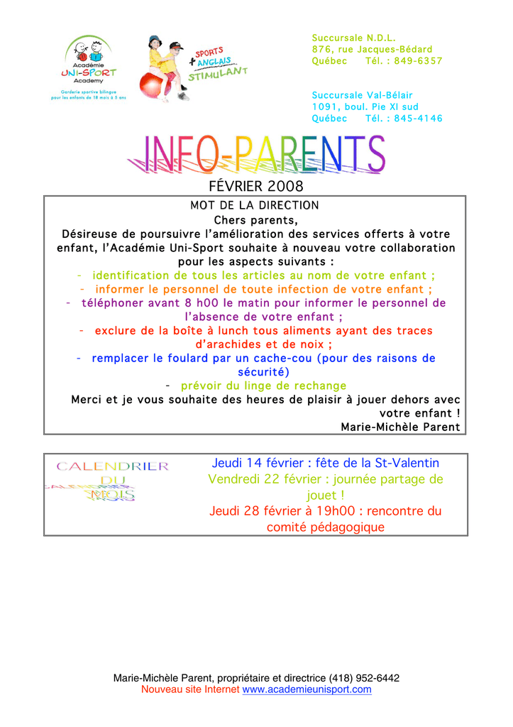 Succursale N.D.L. 876, rue Jacques-Bédard Québec Tél. : 849-6357 Succursale Val-Bélair 1091, boul. Pie XI sud Québec Tél. : 845-4146 FÉVRIER 2008 MOT DE LA DIRECTION Chers parents, Désireuse de poursuivre l’amélioration des services offerts à votre enfant, l’Académie Uni-Sport souhaite à nouveau votre collaboration pour les aspects suivants : - identification de tous les articles au nom de votre enfant ; - informer le personnel de toute infection de votre enfant ; - téléphoner avant 8 h00 le matin pour informer le personnel de l’absence de votre enfant ; - exclure de la boîte à lunch tous aliments ayant des traces d’arachides et de noix ; - remplacer le foulard par un cache-cou (pour des raisons de sécurité) - prévoir du linge de rechange Merci et je vous souhaite des heures de plaisir à jouer dehors avec votre enfant ! Marie-Michèle Parent Jeudi 14 février : fête de la St-Valentin Vendredi 22 février : journée partage de jouet ! Jeudi 28 février à 19h00 : rencontre du comité pédagogique Marie-Michèle Parent, propriétaire et directrice (418) 952-6442 Nouveau site Internet www.academieunisport.com Succursale N.D.L. 876, rue Jacques-Bédard Québec Tél. : 849-6357 Succursale Val-Bélair 1091, boul. Pie XI sud Québec Tél. : 845-4146 Pour la fabrication de sa marionnette, votre enfant a besoin d’une mitaine ou d’un gant usagé! Marie-Michèle Parent, propriétaire et directrice (418) 952-6442 Nouveau site Internet www.academieunisport.com Succursale N.D.L. 876, rue Jacques-Bédard Québec Tél. : 849-6357 Succursale Val-Bélair 1091, boul. Pie XI sud Québec Tél. : 845-4146 PROGRAMME ÉDUCATIF FÉVRIER 2008: LES SPORTS D’HIVER, LE CARNAVAL ET LA ST-VALENTIN Jeux de ballon Ateliers d’anglais J Ballons élastiques J Massage de balles J Ballons quilles J La balloune musicale v Snow sculpture, dogsled race, snowshoeing, skiing, cross country skiing, ice canoe race, parade, hockey, tobogganing vWhat’s your favourite winter outdoor activity? v Do you ski? Jeux sportifs et danse Ateliers scientifiqu es © Hockey intérieur © Courses de ski © La chaise du Bonhomme Carnaval © Course à obstacle © Course à relais © Le soleil ¶La Glace Aime le sel ¶ Des glaçons magiques ¶De liquide à solide Ateliers artistiques ? Mitaine ? Glaçons mignons ? Une patinoire collective ? Scapbooking Chansons du mois «SI TU AIMES» Si tu aimes les sports d’hiver tape des mains (bis) Si tu aimes les sports d’hiver, la neige qui brille sur le sol, si tu aimes les sports d’hiver tape des mains ! Si tu aimes le patin tape du pied (bis) Si tu aimes le patin, aller à la patinoire, si tu aimes le patin tape du pied ! Si tu aimes faire du ski crie Hourra ! (bis) Si tu aimes faire du ski, descendre sur les grandes pentes, si tu aimes faire du ski, crie Hourra ! Si tu aimes aller glisser fait deux bonds (bis) Si tu aimes aller glisser, avec tous les amis, si tu aimes aller glisser fait deux bonds ! « I WILL LOVE YOU FOR EVER» I love you for ever I will like you for always As long as I’m living My baby you’ll be (bis) « I LOVE YOU, YOU LOVE ME TOO» selon l’air de «This Old Man» I love you, You love me We're a happy family With a great big hug and kisses to you Won't you say you love me too? «HOKEY-POKEY» You put your right foot in, You put your right foot out; You put your right foot in, And you shake it all about. Marie-Michèle Parent, propriétaire et directrice (418) 952-6442 Nouveau site Internet www.academieunisport.com Succursale N.D.L. 876, rue Jacques-Bédard Québec Tél. : 849-6357 Succursale Val-Bélair 1091, boul. Pie XI sud Québec Tél. : 845-4146 «FRÈRE JACQUES» Les sports d’hiver (bis) C’est plaisant (bis) Ils ne durent pas longtemps (bis) Profitons-en (bis) «C’EST LA FÊTE À LA TORTUE» Il neige, il fait froid, c’est la fête des sports d’hiver ! Quand il neigera plus, ce sera la fête des sports d’été ! You do the Hokey-Pokey, And you turn yourself around. That's what it's all about! You put your left foot in, etc You put your right hand in, etc You put your left hand in, etc You put your nose in, etc You put your head in, etc Marie-Michèle Parent, propriétaire et directrice (418) 952-6442 Nouveau site Internet www.academieunisport.com