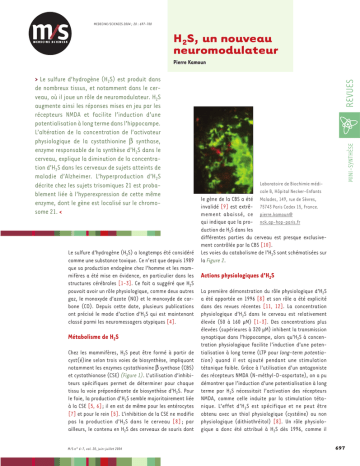 MEDECINE/SCIENCES 2004 ; 20 : 697-700 H2S, un nouveau neuromodulateur Le sulfure d’hydrogène (H2S) a longtemps été considéré comme une substance toxique. Ce n’est que depuis 1989 que sa production endogène chez l’homme et les mammifères a été mise en évidence, en particulier dans les structures cérébrales [1-3]. Ce fait a suggéré que H2S pouvait avoir un rôle physiologique, comme deux autres gaz, le monoxyde d’azote (NO) et le monoxyde de carbone (CO). Depuis cette date, plusieurs publications ont précisé le mode d’action d’H2S qui est maintenant classé parmi les neuromessagers atypiques [4]. Métabolisme de H2S Chez les mammifères, H2S peut être formé à partir de cyst(é)ine selon trois voies de biosynthèse, impliquant notamment les enzymes cystathionine β synthase (CBS) et cystathionase (CSE) (Figure 1). L’utilisation d’inhibiteurs spécifiques permet de déterminer pour chaque tissu la voie prépondérante de biosynthèse d’H2S. Pour le foie, la production d’H2S semble majoritairement liée à la CSE [5, 6]; il en est de même pour les entérocytes [7] et pour le rein [5]. L’inhibition de la CSE ne modifie pas la production d’H 2S dans le cerveau [8] ; par ailleurs, le contenu en H2S des cerveaux de souris dont M/S n° 6-7, vol. 20, juin-juillet 2004 MINI-SYNTHÈSE > Le sulfure d’hydrogène (H2S) est produit dans de nombreux tissus, et notamment dans le cerveau, où il joue un rôle de neuromodulateur. H2S augmente ainsi les réponses mises en jeu par les récepteurs NMDA et facilite l’induction d’une potentialisation à long terme dans l’hippocampe. L’altération de la concentration de l’activateur physiologique de la cystathionine β synthase, enzyme responsable de la synthèse d’H2S dans le cerveau, explique la diminution de la concentration d’H2S dans les cerveaux de sujets atteints de maladie d’Alzheimer. L’hyperproduction d’H2S décrite chez les sujets trisomiques 21 est probablement liée à l’hyperexpression de cette même enzyme, dont le gène est localisé sur le chromosome 21. < REVUES Pierre Kamoun Laboratoire de Biochimie médicale B, Hôpital Necker-Enfants Malades, 149, rue de Sèvres, 75743 Paris Cedex 15, France. pierre.kamoun@ nck.ap-hop-paris.fr le gène de la CBS a été invalidé [9] est extrêmement abaissé, ce qui indique que la production de H2S dans les différentes parties du cerveau est presque exclusivement contrôlée par la CBS [10]. Les voies du catabolisme de l’H2S sont schématisées sur la Figure 2. Actions physiologiques d’H2S La première démonstration du rôle physiologique d’H2S a été apportée en 1996 [8] et son rôle a été explicité dans des revues récentes [11, 12]. La concentration physiologique d’H2S dans le cerveau est relativement élevée (50 à 160 µM) [1-3]. Des concentrations plus élevées (supérieures à 320 µM) inhibent la transmission synaptique dans l’hippocampe, alors qu’H2S à concentration physiologique facilite l’induction d’une potentialisation à long terme (LTP pour long-term potentiation) quand il est ajouté pendant une stimulation tétanique faible. Grâce à l’utilisation d’un antagoniste des récepteurs NMDA (N-méthyl-D-aspartate), on a pu démontrer que l’induction d’une potentialisation à long terme par H2S nécessitait l’activation des récepteurs NMDA, comme celle induite par la stimulation tétanique. L’effet d’H2S est spécifique et ne peut être obtenu avec un thiol physiologique (cystéine) ou non physiologique (dithiothréitol) [8]. Un rôle physiologique a donc été attribué à H2S dès 1996, comme il 697 l’avait été auparavant aux autres neuromodulateurs endogène d’H2S dans les cellules musculaires lisses des gazeux, NO et CO [4]. Le mécanisme d’action a été vaisseaux car il augmente l’expression du gène de la cysensuite précisé sur des cellules neuronales et gliales en tathionase et exerce un effet direct de stimulation sur culture, où des concentrations physiologiques d’H2S cette activité enzymatique [18]. H2S semble agir direcaugmentent la production d’AMPc, et dans les oocytes tement sur les canaux K+ ATP-dépendants (KATP) des celde xénope, où des récepteurs NMDA exprimés à la mem- lules musculaires lisses des vaisseaux, car son effet est brane sont modulés de manière spécifique par H2S [13]. totalement inhibé par la glibenclamide, une substance Ces résultats suggèrent un mécanisme selon lequel une protéine kinase connue pour bloquer l’action du canal KATP [18]. A, activée par l’AMPc, phosphorylerait des récepteurs NMDA qui, sti- Des interrelations ont pu être mises en évidence entre mulés, seraient responsables de l’induction d’une potentialisation à les neuromodulateurs gazeux, NO et CO et la CBS [19]: long terme dans l’hippocampe. Le mécanisme d’action AMPc-dépen- NO peut se fixer sur la CBS et inhiber son activité enzydant d’H2S diffère donc de ceux de NO et CO qui sont GMPc-dépen- matique. Cependant, les différences d’affinité de NO dants. La libération de CRH (corticotropin releasing hormone) par l’hy- pour la CBS et sa cible habituelle, une guanylyl cyclase, pothalamus est inhibée par H2S. Celle-ci a été démontré in vitro sur ne sont pas en faveur d’une fixation de NO sur la CBS à explants hypothalamiques, mais aussi in vivo chez le rat: la stimula- l’état physiologique. A l’inverse, l’affinité de la CBS tion de la CBS par son activateur physiologique, la S-adénosylméthio- pour CO est très grande: la CBS est-elle la cible physionine (SAM), injectée par voie intra-péritonéale, accroît la production logique de CO au niveau cérébral? Cette question est intracérébrale d’H2S et inhibe la libération dans le plasma de cortico- pour l’heure sans réponse [19]. La CBS est codée par un gène situé sur le chromosome stérone après exposition de l’animal au froid [14, 15]. Le contrôle de la