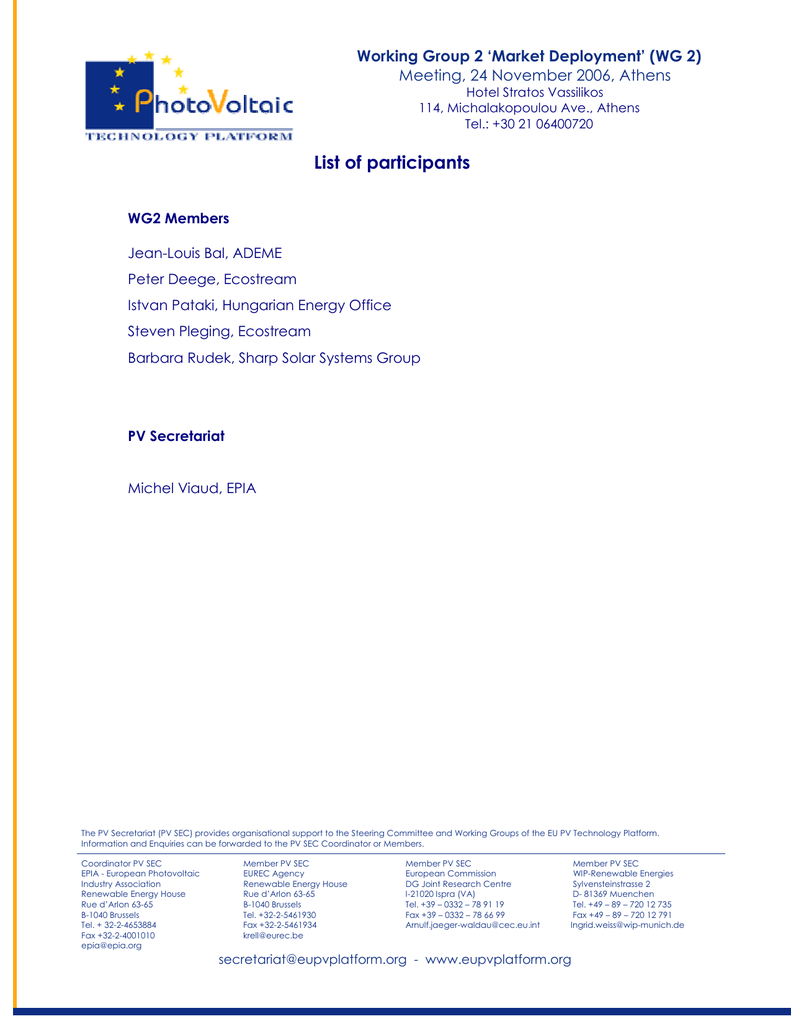 Working Group 2 ‘Market Deployment’ (WG 2) Meeting, 24 November 2006, Athens Hotel Stratos Vassilikos 114, Michalakopoulou Ave., Athens Tel.: +30 21 06400720 List of participants WG2 Members Jean-Louis Bal, ADEME Peter Deege, Ecostream Istvan Pataki, Hungarian Energy Office Steven Pleging, Ecostream Barbara Rudek, Sharp Solar Systems Group PV Secretariat Michel Viaud, EPIA The PV Secretariat (PV SEC) provides organisational support to the Steering Committee and Working Groups of the EU PV Technology Platform. Information and Enquiries can be forwarded to the PV SEC Coordinator or Members. Coordinator PV SEC EPIA - European Photovoltaic Industry Association Renewable Energy House Rue d’Arlon 63-65 B-1040 Brussels Tel. + 32-2-4653884 Fax +32-2-4001010 [email protected] Member PV SEC EUREC Agency Renewable Energy House Rue d’Arlon 63-65 B-1040 Brussels Tel. +32-2-5461930 Fax +32-2-5461934 [email protected] Member PV SEC European Commission DG Joint Research Centre I-21020 Ispra (VA) Tel. +39 – 0332 – 78 91 19 Fax +39 – 0332 – 78 66 99 [email protected] Member PV SEC WIP-Renewable Energies Sylvensteinstrasse 2 D- 81369 Muenchen Tel. +49 – 89 – 720 12 735 Fax +49 – 89 – 720 12 791 [email protected] [email protected] - www.eupvplatform.org