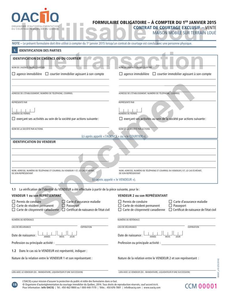 Inutilisable pour une transaction FORMULAIRE OBLIGATOIRE – À COMPTER DU 1ER JANVIER 2015 CONTRAT DE COURTAGE EXCLUSIF – VENTE MAISON MOBILE SUR TERRAIN LOUÉ NOTE – Le présent formulaire doit être utilisé à compter du 1er janvier 2015 lorsqu’un contrat de courtage est conclu avec une personne physique. 1. IDENTIFICATION DES PARTIES IDENTIFICATION DE L’AGENCE OU DU COURTIER NOM DE L’AGENCE OU DU COURTIER NOM DE L’AGENCE OU DU COURTIER agence immobilière courtier immobilier agissant à son compte agence immobilière courtier immobilier agissant à son compte ADRESSE DE L’ÉTABLISSEMENT, NUMÉRO DE TÉLÉPHONE, COURRIEL ADRESSE DE L’ÉTABLISSEMENT, NUMÉRO DE TÉLÉPHONE, COURRIEL REPRÉSENTÉ PAR REPRÉSENTÉ PAR NUMÉRO DE PERMIS NUMÉRO DE PERMIS exerçant ses activités au sein de la société par actions suivante : exerçant ses activités au sein de la société par actions suivante : NOM DE LA SOCIÉTÉ PAR ACTIONS NOM DE LA SOCIÉTÉ PAR ACTIONS m i (ci-après appelé « l’AGENCE » ou « le COURTIER »). c é IDENTIFICATION DU VENDEUR p S NOM, ADRESSE, NUMÉRO DE TÉLÉPHONE ET COURRIEL DU VENDEUR 1 ET, LE CAS ÉCHÉANT, DE SON REPRÉSENTANT 1.1 n e NOM, ADRESSE, NUMÉRO DE TÉLÉPHONE ET COURRIEL DU VENDEUR 2 ET, LE CAS ÉCHÉANT, DE SON REPRÉSENTANT (ci-après appelé « le VENDEUR »). La vérification de l’identité du VENDEUR a été effectuée à partir de la pièce suivante, pour le : VENDEUR 1 ou son REPRÉSENTANT VENDEUR 2 ou son REPRÉSENTANT Permis de conduire Carte d’assurance maladie Carte de résident permanent Passeport Carte de citoyenneté canadienne Certificat de naissance de l’état civil Permis de conduire Carte d’assurance maladie Carte de résident permanent Passeport Carte de citoyenneté canadienne Certificat de naissance de l’état civil NUMÉRO DE RÉFÉRENCE NUMÉRO DE RÉFÉRENCE LIEU DE DÉLIVRANCE Date de naissance : EXPIRATION ANNÉE MOIS JOUR Profession ou principale activité : LIEU DE DÉLIVRANCE Date de naissance : EXPIRATION ANNÉE MOIS JOUR Profession ou principale activité : Nature de la relation entre le VENDEUR 1 et son représentant : LIEN AVEC LE VENDEUR (EX. : MANDATAIRE, LIQUIDATEUR D’UNE SUCCESSION) 1/8 Nature de la relation entre le VENDEUR 2 et son représentant : LIEN AVEC LE VENDEUR (EX. : MANDATAIRE, LIQUIDATEUR D’UNE SUCCESSION) L’OACIQ a pour mission d’assurer la protection du public et édite des formulaires dans ce but. © Organisme d’autoréglementation du courtage immobilier du Québec, 2014. Tous droits de reproduction réservés, sauf accord écrit. Pour information : Info OACIQ | Tél. : 450 462-9800 ou 1 800 440-7170 | Téléc. : 450 676-7801 | [email protected] | www.oaciq.com 0000F_v19 (05/2014) 1.2 Dans le cas où le VENDEUR est représenté, indiquer : CCM 0 0 0 01 Pour le VENDEUR 1, indiquer : Pour le VENDEUR 2, indiquer : Inutilisable pour une transaction Date de naissance : Date de naissance : ANNÉE MOIS JOUR ANNÉE Profession ou principale activité : MOIS JOUR Profession ou principale activité : 2. OBJET ET DURÉE DU CONTRAT 2.1 Le VENDEUR retient en exclusivité les services de l’AGENCE ou du COURTIER pour mettre en marché la maison mobile placée sur un châssis, qu’elle ait ou non une fondation permanente, ci-après décrite et agir en vue de réaliser une entente visant la vente de celle-ci. Le présent contrat expire à 23 h 59, le . DATE À défaut d’une stipulation quant à sa date d’expiration, le présent contrat expire 30 jours après sa conclusion. À moins de stipulation contraire à la clause 11.1, le présent contrat peut être résilié. n e 3. DESCRIPTION SOMMAIRE DE LA MAISON MOBILE 3.1 La maison mobile est décrite comme suit : Marque : Numéro de série : Année : Dimensions (sans attache) : m i Superficie : (ci-après appelée « la MAISON MOBILE »). Elle est située sur un terrain loué appartenant à NUMÉRO D’EMPLACEMENT c é RUE VILLE DÉSIGNATION CADASTRALE m pi DIMENSIONS p S 4. PRIX ET CONDITIONS DE VENTE 4.1 Le prix de vente demandé est de : $). 4.2 Emprunts existants : PROVINCE CODE POSTAL m2 pi2 SUPERFICIE (ci-après appelé « le TERRAIN »). ( et décrit comme suit : dollars lesquels sont garantis par une hypothèque mobilière sans dépossession ou une hypothèque immobilière, ou les deux. Les frais reliés au remboursement de ces emprunts ainsi qu’à la radiation de toute hypothèque seront à la charge du VENDEUR. Les frais reliés au remboursement incluent toute pénalité pouvant être exigible dans le cas d’un remboursement par anticipation. lesquels sont vendus sans garantie légale de qualité, aux risques et périls de l’acheteur, mais devront être en état de fonctionnement lors de la livraison de la MAISON MOBILE. 2/8 L’OACIQ a pour mission d’assurer la protection du public et édite des formulaires dans ce but. © Organisme d’autoréglementation du courtage immobilier du Québec, 2014. Tous droits de reproduction réservés, sauf accord écrit. Pour information : Info OACIQ | Tél. : 450 462-9800 ou 1 800 440-7170 | Téléc. : 450 676-7801 | [email protected] | www.oaciq.com 0000F_v19 (05/2014) 4.3 INCLUSIONS – Sont inclus dans la vente, les biens suivants : CCM 0 0 0 01 4.4 EXCLUSIONS – Sont exclus de la vente, les biens suivants : Inutilisable pour une transaction 4.5 Contrats de service et de location visant le TERRAIN et les appareils et équipements devant être pris en charge par l’acheteur : 1° Pour la location du TERRAIN : a) Le loyer demandé pour le TERRAIN sur lequel est située la MAISON MOBILE est de : ( $ ) par semaine dollars par mois autre : pour un montant total de la durée complète du bail, s’il s’agit d’un bail à durée fixe. dollars ( n e b) Durée de la location du TERRAIN : c) Inclusions prévues au bail : , $) pour m i d) Exclusions prévues au bail : c é e) Indiquer, ci-après, les frais de services ou les taxes qui seront à la charge de l’acheteur rel