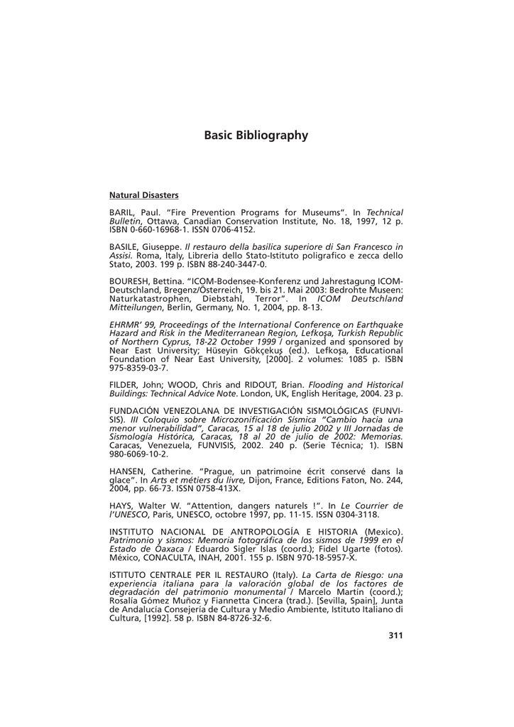 Basic Bibliography Natural Disasters BARIL, Paul. “Fire Prevention Programs for Museums”. In Technical Bulletin, Ottawa, Canadian Conservation Institute, No. 18, 1997, 12 p. ISBN 0-660-16968-1. ISSN 0706-4152. BASILE, Giuseppe. Il restauro della basilica superiore di San Francesco in Assisi. Roma, Italy, Libreria dello Stato-Istituto poligrafico e zecca dello Stato, 2003. 199 p. ISBN 88-240-3447-0. BOURESH, Bettina. “ICOM-Bodensee-Konferenz und Jahrestagung ICOMDeutschland, Bregenz/Österreich, 19. bis 21. Mai 2003: Bedrohte Museen: Naturkatastrophen, Diebstahl, Terror”. In ICOM Deutschland Mitteilungen, Berlin, Germany, No. 1, 2004, pp. 8-13. EHRMR’ 99, Proceedings of the International Conference on Earthquake Hazard and Risk in the Mediterranean Region, Lefkosa, Turkish Republic of Northern Cyprus, 18-22 October 1999 / organized‘ and sponsored by Near East University; Hüseyin Gökçekus (ed.). Lefkosa, Educational ‘ 1085 p. ISBN ‘ Foundation of Near East University, [2000]. 2 volumes: 975-8359-03-7. FILDER, John; WOOD, Chris and RIDOUT, Brian. Flooding and Historical Buildings: Technical Advice Note. London, UK, English Heritage, 2004. 23 p. FUNDACIÓN VENEZOLANA DE INVESTIGACIÓN SISMOLÓGICAS (FUNVISIS). III Coloquio sobre Microzonificación Sísmica “Cambio hacia una menor vulnerabilidad”, Caracas, 15 al 18 de julio 2002 y III Jornadas de Sismología Histórica, Caracas, 18 al 20 de julio de 2002: Memorias. Caracas, Venezuela, FUNVISIS, 2002. 240 p. (Serie Técnica; 1). ISBN 980-6069-10-2. HANSEN, Catherine. “Prague, un patrimoine écrit conservé dans la glace”. In Arts et métiers du livre, Dijon, France, Editions Faton, No. 244, 2004, pp. 66-73. ISSN 0758-413X. HAYS, Walter W. “Attention, dangers naturels !”. In Le Courrier de l’UNESCO, Paris, UNESCO, octobre 1997, pp. 11-15. ISSN 0304-3118. INSTITUTO NACIONAL DE ANTROPOLOGÍA E HISTORIA (Mexico). Patrimonio y sismos: Memoria fotográfica de los sismos de 1999 en el Estado de Oaxaca / Eduardo Sigler Islas (coord.); Fidel Ugarte (fotos). México, CONACULTA, INAH, 2001. 155 p. ISBN 970-18-5957-X. ISTITUTO CENTRALE PER IL RESTAURO (Italy). La Carta de Riesgo: una experiencia italiana para la valoración global de los factores de degradación del patrimonio monumental / Marcelo Martín (coord.); Rosalía Gómez Muñoz y Fiannetta Cincera (trad.). [Sevilla, Spain], Junta de Andalucía Consejería de Cultura y Medio Ambiente, Istituto Italiano di Cultura, [1992]. 58 p. ISBN 84-8726-32-6. 311 KAWAGUSHI, Kimio. Rodin’s ‘The Gates of Hell’: Seismic Isolation and Sculptural Conservation. Tokyo, Japan, The National Museum of Western Art, 2003. 89 p. ISBN 4-906536-26-3. MÜNCHENER RÜCKVERSICHERUNGS-GESELLSCHAFT. Carte universelle des risques naturels. München, Germany, Münchener Rück, cop. 1999. 55 p. M Ü N C H E N E R R Ü C K V E R S I C H E R U N G S - G E S E L L S C H A F T. N a t u r a l Catastrophes: The Current Position. München, Germany, Münchener Rück, cop. 1999. 126 p. (Topics, 2000). MÜNCHENER RÜCKVERSICHERUNGS-GESELLSCHAFT. Winter Storms in Europe (II): Analysis of 1999 Losses and Loss Potentials. München, Germany, Münchener Rück, cop. 2002. 72 p. MUSEOVIRASTO. Can We Learn From the Heritage Lost in Fire? / Edited by Anu Laurila. Helsinki, Finland, National Board of Antiquities, 2004. 80 p. ISBN 951-616-115-4. OKADA, Shin’ichi. “International Flood Network”. In Asia-Pacific Perspectives: Japan +, Tokyo, Vol. 1, No. 2, June 2003, p. 17. PICHARD, Pierre. Emergency Measures and Damage Assessment After an Earthquake. Paris, UNESCO, [ca 1984]. 40 p. + ann. (Studies and Documents on the Cultural Heritage; 6). WILSON, Andrew J. Protecting Cultural Heritage From Fire: Brochure. Nashville, Tennessee, USA, American Association for State and Local History, 1999. 8 p. Human Disasters AMANIEUX, Françoise. “Les dommages de guerre des musées français (1940-1944)”. In Musées et collections publiques de France, Paris, No. 210, 1996, pp. 18-25. ISSN 0996-0961. BERTAUX, Jean-Jacques. “Armées en guerre et collections publiques en Normandie, de 1940 à 1944”. In Musées et collections publiques de France, Paris, No. 210, 1996, pp. 14-17. ISSN 0996-0961. BRUNON, Jean. “Quand les pièces du musée sont aussi des symboles de l’histoire militaire… La récupération des collections du musée français de l’Armée emportées en Allemagne”. In Musées et collections publiques de France, Paris, No. 210, 1996, pp. 32-34. ISSN 0996-0961. COULON, Gérard. “La Vénus de Milo, la Victoire de Samothrace… Des hôtes de marque au Château de Valençay pendant la Seconde Guerre mondiale”. In Musées et collections publiques de France, Paris, No. 210, 1996, pp. 11-13. ISSN 0996-0961. COUTIN, Cécile. “Le musée de la Guerre victime de la guerre”. In Musées et collections publiques de France, Paris, No. 210, 1996, pp. 35-39. ISSN 0996-0961. DE SILVA, Nilma. ICCROM Risk preparedness case-study: Conservation and rehabilitation work after the bomb explosion at the Temple of Sacred Tooth relics in Kandy, Sri Lanka: Report. Roma, Italy, ICCROM, 2001. 8 p. 312 DURRANI, Nadia and ZARE, Mehdi. “Bam”. In Current World Archaeology, London, UK, Robert Selkirk, No. 3, 2004, pp. 12-17. ISSN 1745-5820. DUTLI, María Teresa. Protection of Cultural Property in the Event of Armed Conflict: Report on the Meeting of Experts (Geneva, 5-6 October 2000) / in coop. with Joanna Bourke Martignoni, Julie Gaudreau. Geneva, Switzerland, ICRC, International Committee of the Red Cross, 2002. 223 p. ISBN 2-88145-119-5. (Also in French/Existe aussi en français). FARCHAKH, Joanne. “Le massacre du patrimoine irakien”. In Archéologia, Dijon, France, Editions Faton, No. 402, 2003, pp. 12-31. ISSN 0570-6270. FAVIÈRE, Jean. “Les leçons de la guerre, musées et protection civile”. In Musées et collections publiques de France, Paris, No. 210, 1996, pp. 40-41. ISSN 0996-0961. HITCHCOCK, Ann. “Lessons 