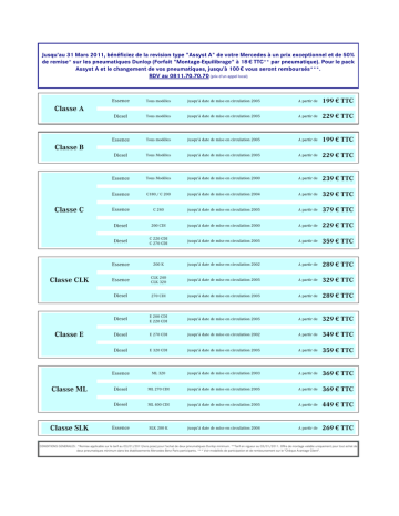 Jusqu'au 31 Mars 2011, bénéficiez de la revision type "Assyst A" de votre Mercedes à un prix exceptionnel et de 50% de remise* sur les pneumatiques Dunlop (Forfait "Montage-Equilibrage" à 18 € TTC** par pneumatique). Pour le pack Assyst A et le changement de vos pneumatiques, jusqu'à 100 € vous seront remboursés***. RDV au 0811.70.70.70 (prix d'un appel local) Essence Tous modèles jusqu'à date de mise en circulation 2005 A partir de 199 € TTC Diesel Tous modèles jusqu'à date de mise en circulation 2005 A partir de 229 € TTC Essence Tous modèles jusqu'à date de mise en circulation 2005 A partir de 199 € TTC Diesel Tous Modèles jusqu'à date de mise en circulation 2005 A partir de 229 € TTC Essence Tous Modèles jusqu'à date de mise en circulation 2000 A partir de 239 € TTC Essence C180 / C 200 jusqu'à date de mise en circulation 2004 A partir de 329 € TTC Essence C 240 jusqu'à date de mise en circulation 2005 A partir de 379 € TTC Diesel 200 CDI jusqu'à date de mise en circulation 2000 A partir de 229 € TTC Diesel C 220 CDI C 270 CDI jusqu'à date de mise en circulation 2005 A partir de 359 € TTC Essence 200 K jusqu'à date de mise en circulation 2002 A partir de 289 € TTC Essence CLK 240 CLK 320 jusqu'à date de mise en circulation 2005 A partir de 329 € TTC Diesel 270 CDI jusqu'à date de mise en circulation 2005 A partir de 289 € TTC Diesel E 200 CDI E 220 CDI jusqu'à date de mise en circulation 2005 A partir de 329 € TTC Diesel E 270 CDI jusqu'à date de mise en circulation 2002 A partir de 349 € TTC Diesel E 320 CDI jusqu'à date de mise en circulation 2005 A partir de 359 € TTC Essence ML 320 jusqu'à date de mise en circulation 2003 A partir de 369 € TTC Diesel ML 270 CDI jusqu'à date de mise en circulation 2005 A partir de 369 € TTC Diesel ML 400 CDI jusqu'à date de mise en circulation 2005 A partir de 449 € TTC Essence SLK 200 K jusqu'à date de mise en circulation 2004 A partir de 269 € TTC Classe A Classe B Classe C Classe CLK Classe E Classe ML Classe SLK CONDITIONS GENERALES : *Remise applicable sur le tarif au 03/01/2011(hors pose) pour l'achat de deux pneumatiques Dunlop minimum. **Tarif en vigueur au 03/01/2011. Offre de montage valable uniquement pour tout achat de deux pneumatiques minimum dans les établissements Mercedes Benz Paris participants. *** Voir modalités de participation et de remboursement sur le "Chèque Avantage Client".